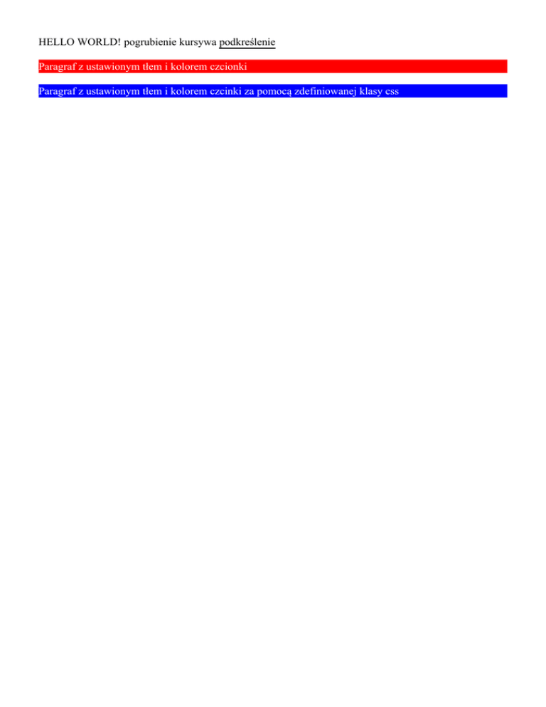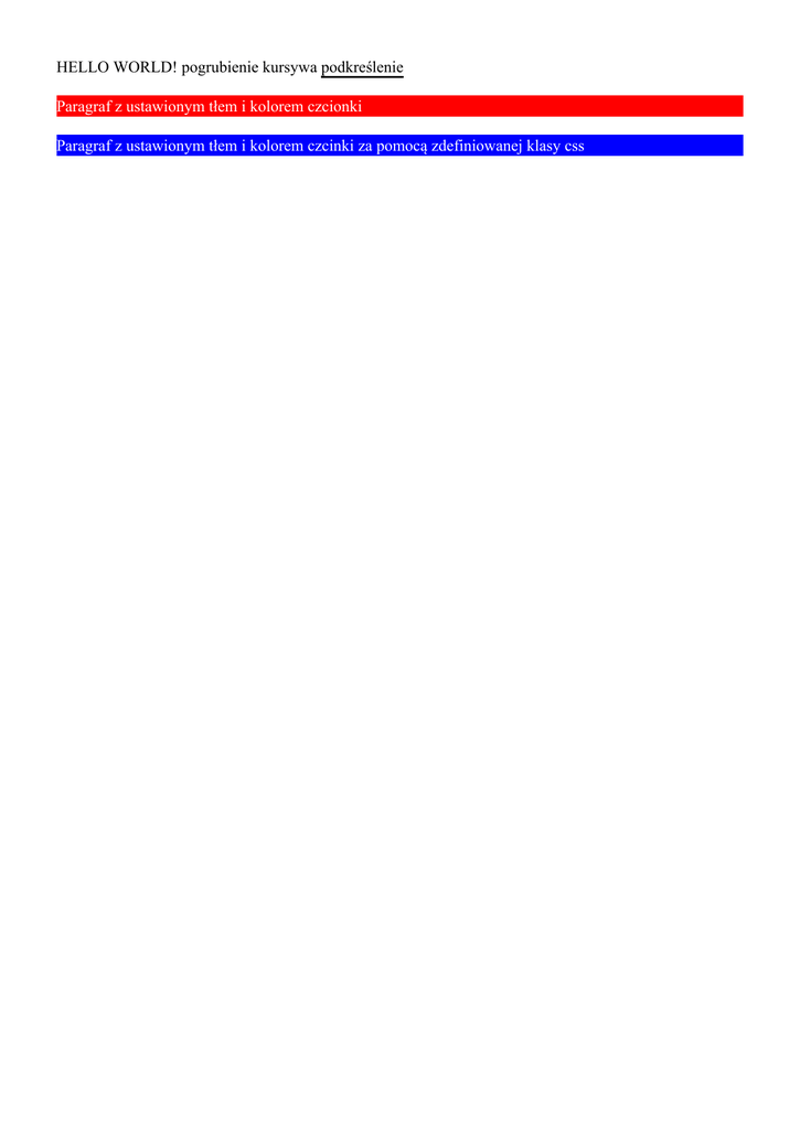 HELLO WORLD! pogrubienie kursywa podkreślenie Paragraf z ustawionym tłem i kolorem czcionki Paragraf z ustawionym tłem i kolorem czcinki za pomocą zdefiniowanej klasy css