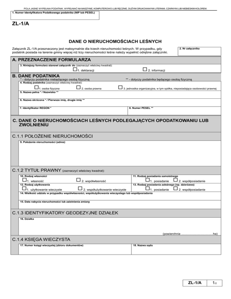 POLA JASNE WYPEŁNIA PODATNIK. WYPEŁNIAĆ NA MASZYNIE, KOMPUTEROWO LUB RĘCZNIE, DUŻYMI DRUKOWANYMI LITERAMI, CZARNYM LUB NIEBIESKIM KOLOREM. 1. Numer Identyfikatora Podatkowego podatnika (NIP lub PESEL) ZL-1/A DANE O NIERUCHOMOŚCIACH LEŚNYCH Załącznik ZL-1/A przeznaczony jest maksymalnie dla trzech nieruchomości leśnych. W przypadku, gdy podatnik posiada na terenie gminy więcej niż trzy nieruchomości leśne należy wypełnić odrębne załączniki. 2. Nr załącznika A. PRZEZNACZENIE FORMULARZA 3. Niniejszy formularz stanowi załącznik do (zaznaczyć właściwy kwadrat): 1. deklaracji 2. informacji B. DANE PODATNIKA * - dotyczy podatnika niebędącego osobą fizyczną ** - dotyczy podatnika będącego osobą fizyczną 4. Rodzaj podatnika (zaznaczyć właściwy kwadrat): 1. osoba fizyczna 5. Nazwa pełna * / Nazwisko ** 2. osoba prawna 3. jednostka organizacyjna, w tym spółka, nieposiadająca osobowości prawnej 6. Nazwa skrócona * / Pierwsze imię, drugie imię ** 7. Identyfikator REGON * 8. Numer PESEL ** C. DANE O NIERUCHOMOŚCIACH LEŚNYCH PODLEGAJĄCYCH OPODATKOWANIU LUB ZWOLNIENIU C.1.1 POŁOŻENIE NIERUCHOMOŚCI 9. Położenie nieruchomości (adres) C.1.2 TYTUŁ PRAWNY (zaznaczyć właściwy kwadrat): 10. Rodzaj własności 1. własność 12. Rodzaj użytkowania 1. użytkowanie wieczyste 2. współwłasność 2. współużytkowanie wieczyste 11. Rodzaj posiadania samoistnego 1. posiadanie 2. współposiadanie 13. Rodzaj posiadania zależnego (np. dzierżawa) 1. posiadanie 2. współposiadanie 14. Wielkość udziału w przypadku współwłasności, współużytkowania wieczystego lub współposiadania 15. Data nabycia nieruchomości lub zaistnienia zmiany C.1.3 IDENTYFIKATORY GEODEZYJNE DZIAŁEK 16. Działka (powierchnia ....................................ha) C.1.4 KSIĘGA WIECZYSTA 17. Numer księgi wieczystej (zbioru dokumentów) 18. Nazwa sądu ZL-1/A 1/2 POLA JASNE WYPEŁNIA PODATNIK. WYPEŁNIAĆ NA MASZYNIE, KOMPUTEROWO LUB RĘCZNIE, DUŻYMI DRUKOWANYMI LITERAMI, CZARNYM LUB NIEBIESKIM KOLOREM. C.2.1 POŁOŻENIE NIERUCHOMOŚCI 19. Położenie nieruchomości (adres) C.2.2 TYTUŁ PRAWNY (zaznaczyć właściwy kwadrat): 20. Rodzaj własności 1. własność 22. Rodzaj użytkowania 1. użytkowanie wieczyste 2. współwłasność 2. współużytkowanie wieczyste 21. Rodzaj posiadania samoistnego 1. posiadanie 2. współposiadanie 23. Rodzaj posiadania zależnego (np. dzierżawa) 1. posiadanie 2. współposiadanie 24. Wielkość udziału w przypadku współwłasności, współużytkowania wieczystego lub współposiadania 25. Data nabycia nieruchomości lub zaistnienia zmiany C.2.3 IDENTYFIKATORY GEODEZYJNE DZIAŁEK 26. Działka (powierchnia ....................................ha) C.2.4 KSIĘGA WIECZYSTA 27. Numer księgi wieczystej (zbioru dokumentów) 28. Nazwa sądu C.3.1 POŁOŻENIE NIERUCHOMOŚCI 29. Położenie nieruchomości (adres) C.3.2 TYTUŁ PRAWNY (zaznaczyć właściwy kwadrat): 30. Rodzaj własności 1. własność 32. Rodzaj użytkowania 1. użytkowanie wieczyste 2. współwłasność 2. współużytkowanie wieczyste 31. Rodzaj posiadania samoistnego 1. posiadanie 2. współposiadanie 33. Rodzaj posiadania zależnego (np. dzierżawa) 1. posiadanie 2. współposiadanie 34. Wielkość udziału w przypadku współwłasności, współużytkowania wieczystego lub współposiadania 35. Data nabycia nieruchomości lub zaistnienia zmiany C.3.3 IDENTYFIKATORY GEODEZYJNE DZIAŁEK 36. Działka (powierchnia ....................................ha) C.3.4 KSIĘGA WIECZYSTA 37. Numer księgi wieczystej (zbioru dokumentów) ZL-1/A 2/2 38. Nazwa sądu