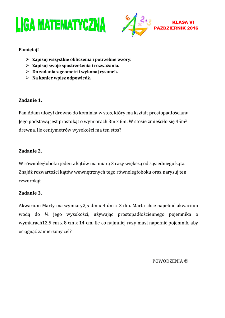 KLASA VI PAŹDZIERNIK 2016 Pamiętaj! Zapisuj wszystkie obliczenia i potrzebne wzory. Zapisuj swoje spostrzeżenia i rozważania. Do zadania z geometrii wykonaj rysunek. Na koniec wpisz odpowiedź. Zadanie 1. Pan Adam ułożył drewno do kominka w stos, który ma kształt prostopadłościanu. Jego podstawą jest prostokąt o wymiarach 3m x 6m. W stosie zmieściło się 45m3 drewna. Ile centymetrów wysokości ma ten stos? Zadanie 2. W równoległoboku jeden z kątów ma miarą 3 razy większą od sąsiedniego kąta. Znajdź rozwartości kątów wewnętrznych tego równoległoboku oraz narysuj ten czworokąt. Zadanie 3. Akwarium Marty ma wymiary2,5 dm x 4 dm x 3 dm. Marta chce napełnić akwarium wodą do ¾ jego wysokości, używając prostopadłościennego pojemnika o wymiarach12,5 cm x 8 cm x 14 cm. Ile co najmniej razy musi napełnić pojemnik, aby osiągnąć zamierzony cel? POWODZENIA ☺