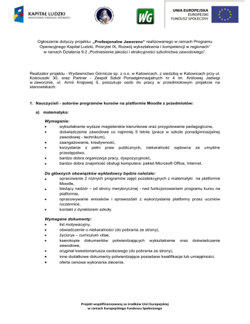 Ogłoszenie dotyczy projektu: „Profesjonalne Jaworzno” realizowanego w ramach Programu Operacyjnego Kapitał Ludzki, Priorytet IX, Rozwój wykształcenia i kompetencji w regionach” w ramach Działania 9.2 „Podniesienie jakości i atrakcyjności szkolnictwa zawodowego”. Realizator projektu - Wydawnictwo Górnicze sp. z o.o. w Katowicach, z siedzibą w Katowicach przy ul. Kościuszki 30, oraz Partner - Zespół Szkół Ponadgimnazjalnych nr 4 im. Królowej Jadwigi w Jaworznie, ul. Armii Krajowej 5, poszukuje osób do pracy w przedmiotowym projekcie na stanowiskach: 1. Nauczycieli - autorów programów kursów na platformie Moodle z przedmiotów: a) matematyka: Wymagania: wykształcenie wyższe magisterskie kierunkowe oraz przygotowanie pedagogiczne, doświadczenie zawodowe co najmniej 5 letnie (praca w szkole ponadgimnazjalnej zawodowej - technikum), zaangażowanie, kreatywność, korzystanie z pełni praw publicznych, niekaralność sądowna za umyślne przestępstwo, bardzo dobra organizacja pracy, dyspozycyjność, bardzo dobra znajomość obsługi komputera: pakiet Microsoft Office, Internet. Do głównych obowiązków wykładowcy będzie należało: opracowanie 2 różnych programów zajęć pozalekcyjnych z matematyki na platformie Moodle, bieżący nadzór – od strony merytorycznej - nad funkcjonowaniem programu kursu na platformie, opracowywanie wniosków i sprawozdań z wykorzystania platformy przez uczniów /uczennice, kontakt z dyrektorem szkoły. Wymagane dokumenty: list motywacyjny, oświadczenie o niekaralności (do pobrania ze strony), życiorys – curriculum vitae, kserokopie dokumentów potwierdzających wykształcenie zawodowe, oryginał kwestionariusza osobowego (do pobrania ze strony), oraz doświadczenie inne dodatkowe dokumenty potwierdzające posiadane kwalifikacje lub umiejętności, oferta cenowa wykonania zlecenia. Projekt współfinansowany ze środków Unii Europejskiej w ramach Europejskiego Funduszu Społecznego b) języka angielskiego zawodowego: Wymagania: wykształcenie wyższe magisterskie kierunkowe oraz przygotowanie pedagogiczne, doświadczenie zawodowe co najmniej 5 letnie (praca w szkole ponadgimnazjalnej zawodowej - technikum), bardzo dobra znajomość zagadnień egzaminacyjnych (egzaminu potwierdzający kwalifikacje zawodowe dla technikum w danym zawodzie), zaangażowanie, kreatywność, korzystanie z pełni praw publicznych, niekaralność sądowna za umyślne przestępstwo, bardzo dobra organizacja pracy, dyspozycyjność, bardzo dobra znajomość obsługi komputera: pakiet Microsoft Office, Internet. Do głównych obowiązków wykładowcy będzie należało: opracowanie 2 różnych programów zajęć pozalekcyjnych z języka angielskiego zawodowego na platformie Moodle, bieżący nadzór – od strony merytorycznej - nad funkcjonowaniem programu kursu na platformie, opracowywanie wniosków i sprawozdań z wykorzystania platformy przez uczniów /uczennice, kontakt z dyrektorem szkoły. Wymagane dokumenty: list motywacyjny, oświadczenie o niekaralności (do pobrania ze strony), życiorys – curriculum vitae, kserokopie dokumentów potwierdzających wykształcenie zawodowe, oryginał kwestionariusza osobowego (do pobrania ze strony), oraz doświadczenie inne dodatkowe dokumenty potwierdzające posiadane kwalifikacje lub umiejętności, oferta cenowa wykonania zlecenia. Termin składania ofert: 26 kwietnia 2013 r. do godz. 9:00 w siedzibie Wydawnictwa Górniczego sp. z o.o. w Katowicach z siedzibą w Katowicach przy ul. Kościuszki 30, pok. 104 lub w sekretariacie Zespołu Szkół Ponadgimnazjalnych nr 4 im. Królowej Jadwigi 5 w Jaworznie. Termin rozpoczęcia pracy w projekcie: od 29 kwietnia 2013 r. ----------------------------------------------------------------------------------------------------------------------------- ----------- Wymagane dokumenty należy złożyć w zaklejonej kopercie z adnotacją: nabór na stanowisko …………………. w ramach projektu „Profesjonalne Jaworzno”. Wybrani kandydaci zostaną zaproszeni na rozmowy kwalifikacyjne. Aplikacje, które wpłyną po wyżej określonym terminie, nie będą rozpatrywane. Informacja o wyniku naboru będzie umieszczona na stronie internetowej Wydawnictwa Górniczego sp. z o.o. w Katowicach. (www.gornicza.com.pl) oraz Zespołu Szkół Ponadgimnazjalnych nr 4 im. Królowej Jadwigi w Jaworznie (www.zsp4.jaworzno.edu.pl) Projekt współfinansowany ze środków Unii Europejskiej w ramach Europejskiego Funduszu Społecznego Wymagane dokumenty aplikacyjne: list motywacyjny, szczegółowe CV (z uwzględnieniem przebiegu kariery zawodowej), powinny być opatrzone klauzulą: „Wyrażam zgodę na przetwarzanie moich danych osobowych zawartych w ofercie pracy dla potrzeb niezbędnych do realizacji procesu rekrutacji zgodnie z ustawą z dnia 29 sierpnia 1997 r. o ochronie danych osobowych (Dz. U. z 2002 r. Nr 101, poz. 926 z późn. zm.) oraz ustawą z dnia 22 marca o pracownikach samorządowych (Dz. U. z 2001 r. Nr 142, poz. 1593 z późn. zm.)” ZATWIERDZAM Prezes Zarządu Wydawnictwa Górniczego sp. z o.o. w Katowicach Witold Pustułka Projekt współfinansowany ze środków Unii Europejskiej w ramach Europejskiego Funduszu Społecznego
