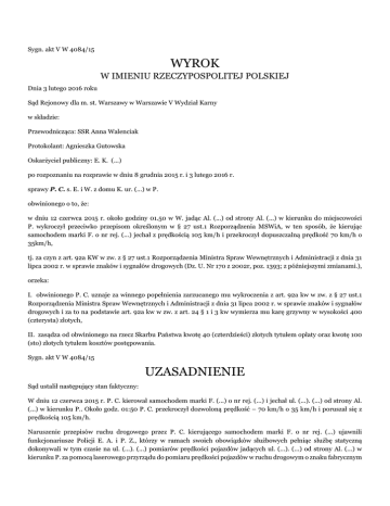 Sygn. akt V W 4084/15 WYROK W IMIENIU RZECZYPOSPOLITEJ POLSKIEJ Dnia 3 lutego 2016 roku Sąd Rejonowy dla m. st. Warszawy w Warszawie V Wydział Karny w składzie: Przewodnicząca: SSR Anna Walenciak Protokolant: Agnieszka Gutowska Oskarżyciel publiczny: E. K. (...) po rozpoznaniu na rozprawie w dniu 8 grudnia 2015 r. i 3 lutego 2016 r. sprawy P. C. s. E. i W. z domu K. ur. (...) w P. obwinionego o to, że: w dniu 12 czerwca 2015 r. około godziny 01.50 w W. jadąc Al. (...) od strony Al. (...) w kierunku do miejscowości P. wykroczył przeciwko przepisom określonym w § 27 ust.1 Rozporządzenia MSWiA, w ten sposób, że kierując samochodem marki F. o nr rej. (...) jechał z prędkością 105 km/h i przekroczył dopuszczalną prędkość 70 km/h o 35km/h, tj. za czyn z art. 92a KW w zw. z § 27 ust.1 Rozporządzenia Ministra Spraw Wewnętrznych i Administracji z dnia 31 lipca 2002 r. w sprawie znaków i sygnałów drogowych (Dz. U. Nr 170 z 2002r, poz. 1393; z późniejszymi zmianami.), orzeka: I. obwinionego P. C. uznaje za winnego popełnienia zarzucanego mu wykroczenia z art. 92a kw w zw. z § 27 ust.1 Rozporządzenia Ministra Spraw Wewnętrznych i Administracji z dnia 31 lipca 2002 r. w sprawie znaków i sygnałów drogowych i za to na podstawie art. 92a kw w zw. z art. 24 § 1 i 3 kw wymierza mu karę grzywny w wysokości 400 (czterysta) złotych, II. zasądza od obwinionego na rzecz Skarbu Państwa kwotę 40 (czterdzieści) złotych tytułem opłaty oraz kwotę 100 (sto) złotych tytułem kosztów postępowania. Sygn. akt V W 4084/15 UZASADNIENIE Sąd ustalił następujący stan faktyczny: W dniu 12 czerwca 2015 r. P. C. kierował samochodem marki F. (...) o nr rej. (...) i jechał ul. (...). (...) od strony Al. (...) w kierunku P.. Około godz. 01:50 P. C. przekroczył dozwoloną prędkość – 70 km/h o 35 km/h i poruszał się z prędkością 105 km/h. Naruszenie przepisów ruchu drogowego przez P. C. kierującego samochodem marki F. o nr rej. (...) ujawnili funkcjonariusze Policji E. A. i P. Z., którzy w ramach swoich obowiązków służbowych pełniąc służbę statyczną dokonywali w tym czasie na ul. (...). (...) pomiarów prędkości pojazdów jadących ul. (...). (...) od strony Al. (...) w kierunku P. za pomocą laserowego przyrządu do pomiaru prędkości pojazdów w ruchu drogowym o znaku fabrycznym (...) 20-20 (...)(...) nr fabryczny (...). Urządzenie to posiadało aktualne świadectwo legalizacji ważne do dnia 31 lipca 2015 roku. Funkcjonariusze Policji zatrzymali pojazd kierowany przez P. C. do kontroli drogowej, odtworzyli na jego prośbę obraz zarejestrowany przez urządzenie do pomiaru prędkości oraz okazali mu świadectwo legalizacji w/w urządzenia. P. C. w trakcie policyjnej kontroli skorzystał z przysługującego mu prawa do odmowy przyjęcia nałożonego na niego mandatu karnego kredytowanego. P. C. ma 41 lat. Jest żonaty, nie ma małoletnich dzieci. Jest doradcą podatkowym, uzyskuje dochód w wysokości 4.000 zł. Nie karany sądownie. Nie był leczony psychiatrycznie ani odwykowo. /e-protokół rozprawy z dnia 8 grudnia 2015 r. od godz. 00:00:40 do godz. 00:02:23 wyjaśnienia obwinionego P. C./ Powyższy stan faktyczny Sąd ustalił na podstawie: wyjaśnień obwinionego P. C. /e-protokół rozprawy z dnia 8 grudnia 2015 r. od godz. 00:03:17 do godz. 00:05:40 oraz od godz. 00:13:21 do godz. 00:13:43/, zeznań świadka E. A. /k. 2-3, e-protokół rozprawy z dnia 8 grudnia 2015 r. od godz. 00:06:03 do godz. 00:13:20 oraz od godz. 00:13:49 do godz. 00:30:36/, zeznań świadka P. Z. /e-protokół rozprawy z dnia 3 lutego 2016 r. od godz. 00:00:57 do godz. 00:04:43/, a także notatki urzędowej /k. 1/, świadectwa legalizacji /k. 9/, danych z Systemu Rejestrów Państwowych /k. 10-11/, fotografii /k. 23/ oraz kserokopii notatnika służbowego /k. 65-67/. Obwiniony P. C. nie przyznał się do popełnienia zarzucanego mu czynu. Odnosząc się do zarzutu wyjaśnił, że w czasie zdarzenia występowało duże natężenie ruchu. Wyjaśnił również, że poruszał się wówczas lewym pasem ruchu. Wskazał nadto, że warunki atmosferyczne były dość dobre i występowała dość dobra widoczność. Obwiniony przyznał, że faktycznie poruszał się wówczas pojazdem marki F. (...). Odnosząc się do zarzuconego mu czynu wyjaśnił, że nie zgadza się z wynikiem przeprowadzonego pomiaru prędkości kierowanego przez niego pojazdu, wskazując, że został on wykonany urządzeniem uniemożliwiającym dokonanie dokładnego pomiaru. Wyjaśnił on także, że nie jest w stanie określić z jaką prędkością wówczas się poruszał. Wskazał on jednak, że była to prędkość niższa niż wskazywało urządzenie do pomiaru prędkości. Wskazał on również, że w czasie policyjnej interwencji miał czas, żeby zastanowić się czy przekroczył on dozwoloną prędkość. /e-protokół rozprawy z dnia 8 grudnia 2015 r. od godz. 00:03:17 do godz. 00:05:40 oraz od godz. 00:13:21 do godz. 00:13:43 wyjaśnienia obwinionego P. C./. Sąd zważył, co następuje: Sąd jako wiarygodne uznał wyjaśnienia obwinionego w zakresie, w jakim potwierdził on, że w czasie zdarzenia faktycznie kierował pojazdem marki F. (...) i poruszał się lewym pasem ruchu. Sąd za wiarygodne uznał również wyjaśnienia obwinionego, w zakresie przedstawionego przez niego opisu warunków atmosferycznych, jakie występowały w czasie zdarzenia. Sąd dał wiarę również tej części wyjaśnień obwinionego, w której potwierdził on, że w czasie policyjnej kontroli drogowej miał czas, aby zastanowić się czy przekroczył dozwoloną prędkość. Wyjaśnienia obwinionego we wskazanym zakresie były logiczne i zgodne z doświadczeniem życiowym, a także spójne z wiarygodnymi zeznaniami funkcjonariuszy Policji, którzy w dniu zdarzenia zatrzymali do kontroli drogowej pojazd kierowany przez obwinionego. Sąd nie dał wiary wyjaśnieniom obwinionego w zakresie, w jakim wskazywał on, 