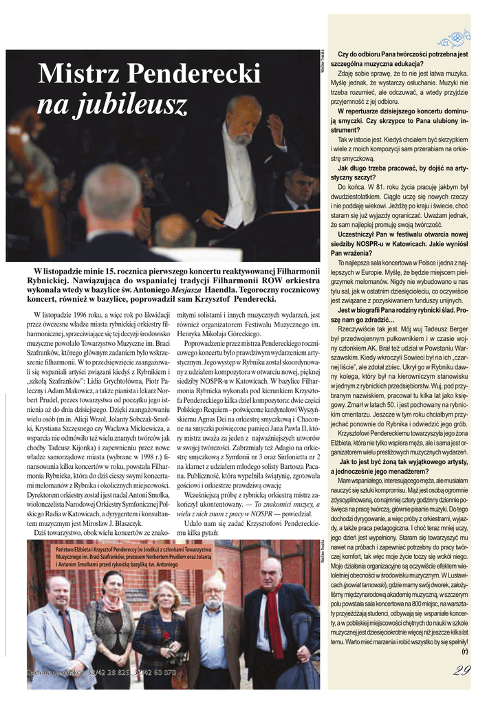 Poprowadzenie przez mistrza Pendereckiego rocznicowego koncertu było prawdziwym wydarzeniem artystycznym. Jego występ w Rybniku został skoordynowany z udziałem kompozytora w otwarciu nowej, pięknej