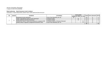 kierunek: Informatyka i Ekonometria II stopień STUDIA STACJONARNE Moduł wybieralny: Rynki finansowe w teorii i praktyce koordynator: dr Iwona Świeczewska, Katedra Teorii i Analiz Systemów Ekonomicznych rok I semestr II przedmiot Modelowanie kursów walutowych Analiza i optymalizacja ryzyka na rynku finansowym Analiza spektralna procesów finansowych Przetwarzanie danych i analiza ekonometryczna w programie SAS Struktury danych i algorytmy w programie Econometric Views prowadzący dr hab. Piotr Wdowiński, prof. UŁ dr Wojciech Zatoń dr Zuzanna Wośko dr Zuzanna Wośko, dr Wojciech Grabowski dr hab. Piotr Wdowiński, prof. UŁ liczba godzin razem forma zaliczenia ECTS wykład ćw. konw. ćw. lab. 30 30 E 4 15 15 Z 2 15 15 Z 2 15 15 Z 1 15 15 Z 1 90 10