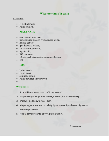 Wieprzowina a’la dzik: Składniki: ½ kg karkówki łyżka smalcu, MARYNATA: sok z jednej cytryny, pół szklanki białego wytrawnego wina, 2 duże cebule, pół łyżeczki cukru, 20 ziarenek jałowca, 3 goździki, liść laurowy, 10 ziarenek pieprzu i ziela angielskiego, sól SOS: łyżka masła łyżka mąki szklanka rosołu łyżka powideł śliwkowych Wykonanie: 1. Składniki marynaty połączyć i zagotować. 2. Mięso włożyć do garnka, obłożyć cebulą i zalać marynatą. 3. Wstawić do lodówki na 3-4 dni. 4. Mięso wyjąć z marynaty, należy ją zachować i podlewać nią mięso podczas pieczenia. 5. Piec w temperaturze 180 ᵒC przez 90 min. Smacznego!