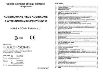 Ogólna instrukcja obsługi, montażu i utrzymania KOMBINOWANE PIECE KOMINKOWE Z WYMIENNIKIEM CIEPŁOWODNYM HAAS + SOHN Rukov s.r.o. PRODUCENT: SNP 474, 408 01 RUMBURK, REPUBLIKA CZESKA IČ: 62740989 DIČ: CZ62740989 Dział zbytu: tel.: 412 332 353 fax: 412 332 345 E-mail: [email protected] tel.: 412 379 999 fax: 412 379 998 www.haassohn-rukov.cz E-mail: [email protected] Serwis: JK 821 20 002 91 g SPIS TREŚCI 1. 1.1. 1.2. 2. 2.1. 2.2. 3. 3.1. 3.2. 3.3. 3.4. 4. 4.1. 4.2. 4.3. 4.4. 4.5. 4.6. 4.7. 4.8. 4.9. 5. 5.1. 5.2. 5.3. 5.4. 5.5. 5.6. 5.7. 6. 6.1. 6.2. 6.3. 6.4. 6.5. 7. 8. 8.1. 8.2. 8.3. 8.4. 8.5. 9. 9.1. 9.2. 9.3. 9.4. 9.5. 9.6. 10. SPECYFIKACJA TECHNICZNA ........................................................................5 Zasada ogrzewania............................................................................................ 5 Wykonanie konstrukcyjne................................................................................... 5 PROCES SPALANIA......................................................................................... 6 Ilość opału i nastawienie procesu spalania ........................................................ 6 Opał ................................................................................................................... 7 BEZPIECZEŃSTWO EKSPLOATACJI ............................................................. 8 Przepisy ogólne.................................................................................................. 8 Bezpieczna odległość pieca w pomieszczeniu od materiałów palnych .............. 8 Bezpieczna odległość przewodu dymnego od materiałów palnych.................... 8 Zalecenia dotyczące bezpiecznej eksploatacji ................................................... 8 INSTALACJA PIECA KOMINKOWEGO I JEGO PODŁĄCZ. DO KOMINA ..... 9 Podłączenie pieca do komina lub do wkładu kominkowego ............................... 9 Podłączenie pieca do przewodu kominowego.................................................... 9 Zalecenia dotyczące instalacji i zabezpieczenia przewodu dymnego ................10 Instalacja (ustawienie) pieca do pomieszczenia ...............................................10 Podłączenie pieca z wymiennikiem do systemu grzewczego.............................10 Zalecenia dotyczące montażu i użytkowania ciśnien. naczyń wzbiorczych .......11 Czyszczenie pieca i komina ...............................................................................12 Pożar w kominie.................................................................................................12 Doprowadzenie powietrza do spalania z zewnątrz.............................................12 INSTRUKCJA OBSŁUGI...................................................................................12 Pierwsze uruchomienie pieca kominkowego......................................................12 Zapalenie i ogrzewanie ......................................................................................13 Dokładanie opału ...............................................................................................13 Czystość szyby ..................................................................................................13 Eksploatacja w okresie przejściowym i w gorszych warunkach klimatycznych ..14 Wymiana wymiennika ciepłowodnego na element zaślepiający.........................14 Usuwanie popiołu...............................................................................................14 CZYSZCZENIE I UTRZYMANIE........................................................................14 Czyszczenie wkładu...........................................................................................14 Czyszczenie ceramiki i kafli................................................................................15 Czyszczenie wymiennika ciepłowodnego ..........................................................15 Sznury i taśmy uszczelniające ...........................................................................15 Części zamienne................................................................................................15 CO ROBIĆ, KIEDY .... „PORADZISZ SOBIE SAM?” .......................................15-16 NAJCZĘŚCIEJ WYSTĘPUJĄCE USTERKI I PYTANIA ...................................16 Pęknięta (wypadnięta) kształtka szamotowa (vermikulit.) w komorze spalania..16 Rozbita szyba.....................................................................................................17 Kierownice do kierowania ciągu .........................................................................17 Pęknięta boczna płytka ......................................................................................17 Wymienny wymiennik (tylko niektóre typy).........................................................18 GWARANCJA I SERWIS ..................................................................................18 Informacje ogólne...............................................................................................18 Warunki gwarancji..............................................................................................18 Serwis gwarancyjny i pogwarancyjny.................................................................18 Przyczyny nie uznania reklamacji ......................................................................18 Jak składać reklamację ......................................................................................19 Zalecenia dotyczące zamawiania części zamiennych........................................19 INNE ..................................................................................................................20 3 10.1. 10.2. 10.3. 10.4. 10.5. 10.6. 11. Akcesoria dostarczane z piecem........................................................................20 Wyposażenie specjalne na zamówienie...................................................