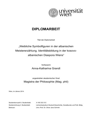DIPLOMARBEIT Titel der Diplomarbeit „Weibliche Symbolfiguren in der albanischen Meistererzählung. Identitätsbildung in der kosovoalbanischen Diaspora Wiens“ Verfasserin Anna-Katharina Grandl angestrebter akademischer Grad Magistra der Philosophie (Mag. phil) Wien, im Jänner 2014 Studienkennzahl lt. Studienblatt: A 190 333 313 Studienrichtung lt. Studienblatt: Lehramtsstudium Deutsch/Geschichte, Sozialkunde und Polit. Bildg. Betreuer: Univ.-Prof. Dr. Oliver Jens Schmitt Danksagung Vielen Menschen gebührt Dank, wenn es um die Realisierung und Fertigstellung dieser Arbeit geht. Zunächst möchte ich meiner Familie - besonders meinen Eltern und meiner Großmutter – für ihre emotionale und materielle Unterstützung danken, die den Grundstock der vorliegenden Arbeit darstellt. Darüber hinaus möchte ich mich bei Patrick bedanken, der den Entstehungsprozess dieser Arbeit von Anfang bis zum Ende begleitet hat und immer ein offenes Ohr für mich hatte. Meinen Freundinnen, Freunden und Frank möchte ich ebenfalls „Danke“ sagen. Die vorliegende Arbeit beruht wesentlich auf der Bereitschaft meiner Interviewpartner, sich Zeit zu nehmen und sich auf Gespräche mit mir einzulassen, wofür ich mich herzlich bedanken möchte! Großer Dank gilt außerdem Elife Krasniqi, MA sowie Stephanie Schwandner-Sievers, PhD und Dr. Jelena Tošić, die mit mir nicht nur über Inhaltliches sprachen, sondern mir auch bei der Konzeption und der Herangehensweise an die vorliegende Arbeit geholfen haben. Zuletzt möchte ich mich besonders bei Prof. Oliver Schmitt bedanken, der mein Vorhaben von Anfang an mit großem Interesse und Engagement betreut und mich mit wertvollen Anregungen und Informationen unterstützt hat: Vielen Dank! Inhaltsverzeichnis 0. Einleitung_______________________________________________S. 1 0.1. Annäherung an das Thema 0.2. Thema und Fragestellung 0.3. Gliederung und Überlegungen zu Theorie und Methodik 0.4. Forschungsstand und Zielsetzung 1. Theoretische Bezüge: Identitätsbildung und die nationale Meistererzählung________________________________________S. 16 1.1. Grundlegende Begriffsdefinitionen: Nation, Nationsbildung, Nationale Identität 1.2. Erinnerungskulturen, Mythen und Historiographie als Werkzeuge der nationalen Meistererzählung 1.3. Symboltheoretische Zugänge: Die ausgewählten Figuren als Symbole innerhalb der nationalen Meistererzählung 1.4. Geschlechterrollenzuschreibungen in der nationalen Meistererzählung 1.5. Zusammenfassung der theoretischen Zugänge mit Blick auf die Forschungsfragen 2. Historische Kontextualisierung______________________________S. 43 2.1. Nationalisierungs- und Identitätsbildungsprozesse in Südosteuropa 2.2. Konstruktion und Inhalte der albanischen Nationalidentität in Kosovo 2.3. Historische Einordnung der Symbolfiguren 3. Methodik_______________________________________________S. 68 3.1. Fallauswahl und Samplingstrategien 3.2. Datenerhebungsmethodik 3.4. Transkription und Speicherung 3.5. Auswertungsmethodik und Analysekategorien I 4. Falldarstellung und Auswertung_____________________________S. 77 4.1. Weibliche Symbolfiguren innerhalb der nationalen Meistererzählung: Eine erste Annäherung 4.2. Die Hyjnesha në fron als Beweismittel und Symbol für den Kampf gegen die Serben 4.2.1. Erste Annäherung an die Figurine anhand der Interviews 4.2.2. Die Reproduktion des Mythos vom illyrischen Ursprung der Albaner 4.2.3. Die Reproduktion des Mythos vom permanenten Kampf der Albaner 4.2.4. Die Figurine und ihr räumlicher Bezug zu Kosovo 4.2.5. Geschlechtsspezifische Interpretationen 4.2.6. Zusammenfassung der Ergebnisse mit Blick auf die Forschungsfragen 4.3. Shote Galica als Symbol: Zwischen Emanzipation und Kampf für die Nation 4.3.1. Erste Annäherung an Shote Galica anhand der Interviews 4.3.2. Shote Galica als Symbol für die Emanzipation der Frauen 4.3.3. Die Reproduktion des Mythos des permanenten Kampfes 4.3.4. Shote Galica: Ein dominantes Symbol innerhalb der nationalen Meistererzählung? 4.3.5. Geschlechtsspezifische Interpretationen: Shote Galica als Modell für unterschiedliche Frauenbilder 4.3.6. Zusammenfassung der Ergebnisse mit Blick auf die Forschungsfragen 4.4. Mutter Teresa: Eine katholische Nonne als „Nationalheldin“ in Kosovo? 4.4.1. Erste Annäherung an Mutter Teresa anhand der Interviews 4.4.2. Mutter Teresa als „pars pro toto“ für die Eigenschaften aller Albaner 4.4.3. Mutter Teresa als Symbol zwischen religiösen und nationalen Deutungsoptionen 4.4.4. Erstes Fazit: Mutter Teresa als Symbol mit zweifachem Adressatenbezug 4.4.5. Geschlechtsspezifische Interpretationen: „Mutter der Albaner“ 1 oder „eine Frau, die so stark ist, wie ein Mann“2? 4.4.6. Zusammenfassung der Ergebnisse mit Blick auf die Forschungsfragen 4.5. Adelina Ismajli und Leonora Jakupi: Nationale Mobilisiererinnen oder unauthentische Geschäftsfrauen? 4.5.1. Annäherung an die beiden Figuren anhand der Interviews 4.5.2. Adelina Ismajli und Leonora Jakupi: Symbolfiguren mit nationaler Mobilisierungskraft? 1 Interview mit J.O., 00:11:39 2 Interview mit F.A., 00:56:52 II 4.5.3. Geschlechtsspezifische Interpretationen: In der „Unterhose“3 auf dem Weg zur Emanzipation? 4.5.4. Zusammenfassung der Ergebnisse mit Blick auf die Forschungsfragen 5. Resümee_____________________________________________S. 155 5.1. Ergebnisse der theoretischen Auseinandersetzung mit den Symbolfiguren und der albanischen Nationalidentität 5.2. Ergebnisse der empirischen Forschung zu den Symbolfiguren und der albanischen Nationalidentität 5.3. Methodenreflexion und Ausblick 5.4. Fazit: Drei Erkenntnisse zur Bedeutung der ausgewählten Symbolfiguren und deren Funktion innerhalb der albanischen Meistererzählung 6. Quellenangaben_______________________________________S. 169 7. Anhang______________________________________________S. 178 a) Biographische Angaben zu den Befragten b) Leitfaden für die narrativen Interviews c) Abkürzungsverzeichnis d) Abstracts e