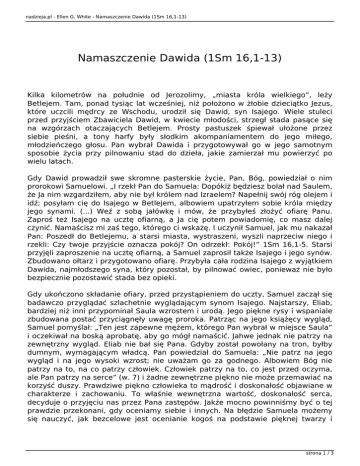 nadzieja.pl - Ellen G. White - Namaszczenie Dawida (1Sm 16,1-13) Namaszczenie Dawida (1Sm 16,1-13) Kilka kilometrów na południe od Jerozolimy, „miasta króla wielkiego”, leży Betlejem. Tam, ponad tysiąc lat wcześniej, niż położono w żłobie dzieciątko Jezus, które uczcili mędrcy ze Wschodu, urodził się Dawid, syn Isajego. Wiele stuleci przed przyjściem Zbawiciela Dawid, w kwiecie młodości, strzegł stada pasące się na wzgórzach otaczających Betlejem. Prosty pastuszek śpiewał ułożone przez siebie pieśni, a tony harfy były słodkim akompaniamentem do jego miłego, młodzieńczego głosu. Pan wybrał Dawida i przygotowywał go w jego samotnym sposobie życia przy pilnowaniu stad do dzieła, jakie zamierzał mu powierzyć po wielu latach. Gdy Dawid prowadził swe skromne pasterskie życie, Pan, Bóg, powiedział o nim prorokowi Samuelowi. „I rzekł Pan do Samuela: Dopókiż będziesz bolał nad Saulem, że Ja nim wzgardziłem, aby nie był królem nad Izraelem? Napełnij swój róg olejem i idź; posyłam cię do Isajego w Betlejem, albowiem upatrzyłem sobie króla między jego synami. (...) Weź z sobą jałówkę i mów, że przybyłeś złożyć ofiarę Panu. Zaproś też Isajego na ucztę ofiarną, a Ja cię potem powiadomię, co masz dalej czynić. Namaścisz mi zaś tego, którego ci wskażę. I uczynił Samuel, jak mu nakazał Pan: Poszedł do Betlejemu, a starsi miasta, wystraszeni, wyszli naprzeciw niego i rzekli: Czy twoje przyjście oznacza pokój? On odrzekł: Pokój!” 1Sm 16,1-5. Starsi przyjęli zaproszenie na ucztę ofiarną, a Samuel zaprosił także Isajego i jego synów. Zbudowano ołtarz i przygotowano ofiarę. Przybyła cała rodzina Isajego z wyjątkiem Dawida, najmłodszego syna, który pozostał, by pilnować owiec, ponieważ nie było bezpiecznie pozostawić stada bez opieki. Gdy ukończono składanie ofiary, przed przystąpieniem do uczty, Samuel zaczął się badawczo przyglądać szlachetnie wyglądającym synom Isajego. Najstarszy, Eliab, bardziej niż inni przypominał Saula wzrostem i urodą. Jego piękne rysy i wspaniale zbudowana postać przyciągnęły uwagę proroka. Patrząc na jego książęcy wygląd, Samuel pomyślał: „Ten jest zapewne mężem, którego Pan wybrał w miejsce Saula” i oczekiwał na boską aprobatę, aby go mógł namaścić. Jahwe jednak nie patrzy na zewnętrzny wygląd. Eliab nie bał się Pana. Gdyby został powołany na tron, byłby dumnym, wymagającym władcą. Pan powiedział do Samuela: „Nie patrz na jego wygląd i na jego wysoki wzrost; nie uważam go za godnego. Albowiem Bóg nie patrzy na to, na co patrzy człowiek. Człowiek patrzy na to, co jest przed oczyma, ale Pan patrzy na serce” (w. 7) i żadne zewnętrzne piękno nie może przemawiać na korzyść duszy. Prawdziwe piękno człowieka to mądrość i doskonałość objawiane w charakterze i zachowaniu. To właśnie wewnętrzna wartość, doskonałość serca, decyduje o przyjęciu nas przez Pana zastępów. Jakże mocno powinniśmy być o tej prawdzie przekonani, gdy oceniamy siebie i innych. Na błędzie Samuela możemy się nauczyć, jak bezcelowe jest ocenianie kogoś na podstawie pięknej twarzy i strona 1 / 3 nadzieja.pl - Ellen G. White - Namaszczenie Dawida (1Sm 16,1-13) sylwetki, i zobaczyć, że bez specjalnego oświecenia z nieba ludzka mądrość nie jest w stanie poznać tajemnice serca czy zrozumieć rady Boże. Myśli i drogi Boże w postępowaniu z Jego stworzeniami przewyższają nasze ograniczone umysły. Możemy jednak być pewni, że Jego dzieci znajdą się w takim miejscu, do którego zostały przygotowane i będą uzdolnione do tego, by wykonać dzieło powierzone ich rękom, jeśli tylko podporządkują się woli Bożej, aby Jego dobroczynne plany nie zostały udaremnione ludzką przewrotnością. Samuel przestał się przyglądać Eliabowi, i zaczął obserwować kolejno każdego z jego sześciu braci, którzy uczestniczyli w nabożeństwie. Pan jednak nie wybrał żadnego z nich. Samuel, z bolesną niepewnością przyjrzał się ostatniemu młodzieńcowi, był zakłopotany i zdezorientowany. Zapytał Isajego: „Czy to już wszyscy młodzieńcy?” Ojciec odrzekł: „Pozostał jeszcze najmłodszy, lecz on pasie trzodę”. Samuel polecił, by go sprowadzono, mówiąc: „Nie zasiądziemy do stołu, aż przyjdzie tutaj” (w. 11). Samotny pasterz był przestraszony nieoczekiwanym wezwaniem posłańca, który oznajmił mu, że prorok przybył do Betlejem i posłał po niego. Zdziwiony zapytał, dlaczego prorok i sędzia Izraela pragnie go widzieć, ale wezwania posłuchał bez wahania. „A on był rumiany i miał piękne oczy i ładny wygląd” (w. 12). Gdy Samuel z przyjemnością patrzył na przystojnego, mężnego, skromnego pasterza, Pan przemówił do proroka: „Wstań, namaść go, gdyż to jest ten” (w. 12). Dawid, wypełniając swoje skromne pasterskie obowiązki udowodnił, że jest odważny i wierny, teraz więc Bóg wybrał go na wodza swego ludu. „Wtedy wziął Samuel róg z olejem i namaścił go w gronie jego braci; i od tego dnia Duch Pański spoczął na Dawidzie i pozostał na nim nadal” (w. 13) Prorok wykonał wyznaczone mu zadanie i z ulgą w sercu wrócił do Ramy. Samuel nie ujawnił swojej misji nawet przed rodziną Isajego, a namaszczenie Dawida zostało dokonane w tajemnicy. Dla młodzieńca był to znak wielkiego powołania, które na niego czekało, aby w przyszłości, w różnych doświadczeniach i niebezpieczeństwach, ta świadomość mogła inspirować go do tego, by pozostał wierny i swym życiem spełnił zamiar Boży. Wielki zaszczyt, jakiego dostąpił Dawid, nie służył jego wywyższeniu. Pomimo wysokiej pozycji, jaką miał zająć, Dawid spokojnie kontynuował swoje zajęcie, i poprzestawał na czekaniu, aż Pan spełni swoje plany w czasie, który sam wyznaczy, i w sposób, który uzna za stosowny. Tak samo pokorny i skromny jak przed namaszczeniem, wró