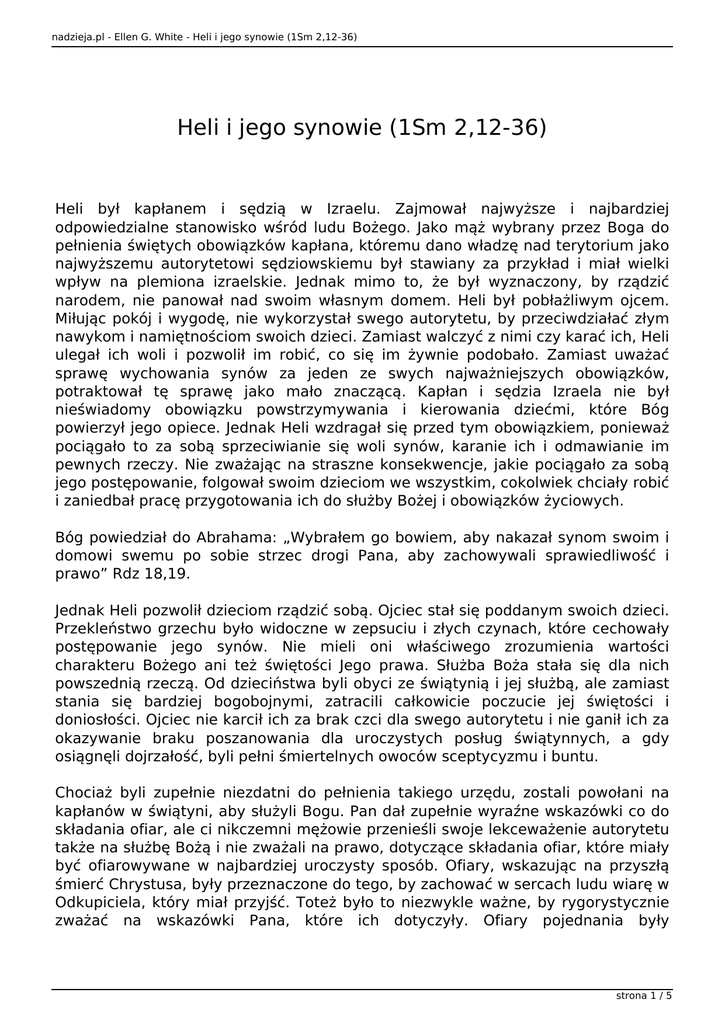 nadzieja.pl - Ellen G. White - Heli i jego synowie (1Sm 2,12-36) Heli i jego synowie (1Sm 2,12-36) Heli był kapłanem i sędzią w Izraelu. Zajmował najwyższe i najbardziej odpowiedzialne stanowisko wśród ludu Bożego. Jako mąż wybrany przez Boga do pełnienia świętych obowiązków kapłana, któremu dano władzę nad terytorium jako najwyższemu autorytetowi sędziowskiemu był stawiany za przykład i miał wielki wpływ na plemiona izraelskie. Jednak mimo to, że był wyznaczony, by rządzić narodem, nie panował nad swoim własnym domem. Heli był pobłażliwym ojcem. Miłując pokój i wygodę, nie wykorzystał swego autorytetu, by przeciwdziałać złym nawykom i namiętnościom swoich dzieci. Zamiast walczyć z nimi czy karać ich, Heli ulegał ich woli i pozwolił im robić, co się im żywnie podobało. Zamiast uważać sprawę wychowania synów za jeden ze swych najważniejszych obowiązków, potraktował tę sprawę jako mało znaczącą. Kapłan i sędzia Izraela nie był nieświadomy obowiązku powstrzymywania i kierowania dziećmi, które Bóg powierzył jego opiece. Jednak Heli wzdragał się przed tym obowiązkiem, ponieważ pociągało to za sobą sprzeciwianie się woli synów, karanie ich i odmawianie im pewnych rzeczy. Nie zważając na straszne konsekwencje, jakie pociągało za sobą jego postępowanie, folgował swoim dzieciom we wszystkim, cokolwiek chciały robić i zaniedbał pracę przygotowania ich do służby Bożej i obowiązków życiowych. Bóg powiedział do Abrahama: „Wybrałem go bowiem, aby nakazał synom swoim i domowi swemu po sobie strzec drogi Pana, aby zachowywali sprawiedliwość i prawo” Rdz 18,19. Jednak Heli pozwolił dzieciom rządzić sobą. Ojciec stał się poddanym swoich dzieci. Przekleństwo grzechu było widoczne w zepsuciu i złych czynach, które cechowały postępowanie jego synów. Nie mieli oni właściwego zrozumienia wartości charakteru Bożego ani też świętości Jego prawa. Służba Boża stała się dla nich powszednią rzeczą. Od dzieciństwa byli obyci ze świątynią i jej służbą, ale zamiast stania się bardziej bogobojnymi, zatracili całkowicie poczucie jej świętości i doniosłości. Ojciec nie karcił ich za brak czci dla swego autorytetu i nie ganił ich za okazywanie braku poszanowania dla uroczystych posług świątynnych, a gdy osiągnęli dojrzałość, byli pełni śmiertelnych owoców sceptycyzmu i buntu. Chociaż byli zupełnie niezdatni do pełnienia takiego urzędu, zostali powołani na kapłanów w świątyni, aby służyli Bogu. Pan dał zupełnie wyraźne wskazówki co do składania ofiar, ale ci nikczemni mężowie przenieśli swoje lekceważenie autorytetu także na służbę Bożą i nie zważali na prawo, dotyczące składania ofiar, które miały być ofiarowywane w najbardziej uroczysty sposób. Ofiary, wskazując na przyszłą śmierć Chrystusa, były przeznaczone do tego, by zachować w sercach ludu wiarę w Odkupiciela, który miał przyjść. Toteż było to niezwykle ważne, by rygorystycznie zważać na wskazówki Pana, które ich dotyczyły. Ofiary pojednania były strona 1 / 5 nadzieja.pl - Ellen G. White - Heli i jego synowie (1Sm 2,12-36) szczególnym wyrazem dziękczynienia dla Boga. Na ołtarzu miał być spalany tylko tłuszcz tych ofiar. Pewna specjalna porcja była przeznaczona dla kapłanów, ale większa część była zwracana ofiarodawcy i spożywana przez niego oraz jego przyjaciół w czasie ofiarnej uczty. W ten sposób wszystkie serca we wdzięczności i wierze miały być kierowane ku wielkiej Ofierze, która gładzi grzechy świata. Synowie Heliego zamiast przestrzegać powagi symbolicznej służby, myśleli jedynie, w jaki sposób mogliby uczynić z niej środek pobłażania samym sobie. Nie zadowalali się przysługującą im częścią ofiary pojednania i żądali dodatkowej porcji. Ogromna liczba tych ofiar, składana podczas dorocznych uroczystości, dawała kapłanom sposobność wzbogacenia się kosztem ludu. Nie tylko żądali więcej niż się im należało, ale nie chcieli nawet czekać, aż spali się tłuszcz ofiarowany Bogu. Natarczywie żądali dla siebie każdej porcji, która im się spodobała, a jeśli sprzeciwiano się, grozili, że wezmą ją sobie gwałtem. Taki brak szacunku ze strony kapłanów ograbił wkrótce służbę z jej świętego i uroczystego znaczenia, a ludzie zaczęli czuć odrazę do składania ofiar Panu. Wielka Ofiara — wypełnienie symbolu — na którą mieli oczekiwać, nie była już rozpoznawana. „I bardzo wielki był grzech tych młodzieńców przed obliczem Pana” 1Sm 2,17. Ci niewierni kapłani przestępowali także Boże prawo i zniesławiali święty urząd swoimi haniebnymi oraz poniżającymi praktykami, a jednak w dalszym ciągu kalali swą obecnością przybytek Boży. Wielu ludzi, przepełnionych oburzeniem na sprzedajne postępowanie Chofniego i Pinechasa, przestało przychodzić na wyznaczone miejsce nabożeństw. Tak więc służba, którą Bóg ustanowił, została wzgardzona i zaniedbana, ponieważ kojarzyła się z grzechami nikczemnych mężów, natomiast ci, których serca skłaniały się ku złemu byli rozzuchwaleni w grzechu. Bezbożność, rozpusta, a nawet bałwochwalstwo rozpanoszyły się w zastraszającym stopniu. Heli popełnił wielki błąd pozwalając swym synom sprawować święty urząd. Pod różnym pretekstem usprawiedliwiając ich postępowanie był zaślepiony co do ich grzechów, ale w końcu przekroczyli wszelkie granice i nie mógł już przymykać oczu na przestępstwa swoich synów. Lud uskarżał się na ich niepohamowane wyczyny, a najwyższy kapłan był zasmucony i zmartwiony. Nie odważył się już w dalszym ciągu milczeć. Jednak jego synowie zwykli byli myśleć jedynie o samych sobie, a nie o kimkolwiek innym, a teraz nie troszczyli się o nikogo więcej. Widzieli smutek ojca, ale ich zatwardziałe serca nie były poruszone. Słuchali jego delikatnych na