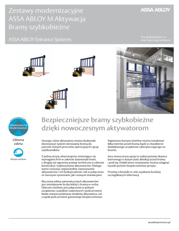 Zestawy modernizacyjne ASSA ABLOY M Aktywacja Bramy szybkobieżne ASSA ABLOY Entrance Systems Bezpieczniejsze bramy szybkobieżne dzięki nowoczesnym aktywatorom Główna zaleta Bezpieczeństwo Stosując różne aktywatory można doskonale dostosować system sterowania bramą do potrzeb różnych procesów operacyjnych i grup użytkowników. Najnowsze kurtyny świetlne można instalować kilka metrów przed bramą bądź w charakterze dodatkowego urządzenia zabezpieczającego na bramie. Z jednej strony obserwujemy zmieniające się wymagania firm w zakresie automatyki bram, z drugiej zaś ogromny postęp techniczny w zakresie konstrukcji i wykorzystania aktywatorów. Dlatego warto rozważyć odpowiednie zastosowanie aktywatorów i ich funkcjonalność, tak w połączeniu ze starszymi systemami, jak i nowymi instalacjami. Inna nowoczesna opcja to wykorzystanie skanera laserowego o dużym polu detekcji przed bramą i pod nią. Dzięki temu rozwiązaniu można osiągnąć wysoki poziom bezpieczeństwa sprzętu. Prosimy o kontakt w celu uzyskania bardziej szczegółowych informacji. Kluczową zaletą automatycznych aktywatorów jest zmniejszenie liczby kolizji z bramą w ruchu. Obecnie możliwe jest połączenie w jednym urządzeniu czujników radarowych i podczerwieni. Radar stanowi podstawę działania aktywatora, zaś czujnik podczerwieni gwarantuje bezpieczeństwo. assaabloyentrance.pl Zestaw produktów ASSA ABLOY M Aktywacja Połączony czujnik podczerwieni i radar Skaner laserowy Article no. Name Type Power Installation / Range Usage D4904V0018 Czujnik ruchu Wszystkie typy 12-24 V AC/DC / < 2 W 3,5 – 7 m Detekcja ruchu D4904R0434 Czujnik ruchu do montażu niskiego Wszystkie typy 12-24 V AC/DC / < 2 W up to 3,5 m Detekcja ruchu D4904R0523 Połączony czujnik podczerwieni i radar Wszystkie typy 12-24 V AC/DC / < 3,5 W 2,5 – 6 m Detekcja ruchu i obecności D8940R0018 Skaner laserowy z uchwytem all types (no coil cable, windbars on crash) 10-35 V DC / < 5 W Różne Detekcja obecności D4904R0005 Uniwersalny pilot na podczerwień Wszystkie typy – – – D8540R0030 Kurtyna świetlna 0,9 m z uchwytem (cynk.) Rozdzielczość 30 mm Wszystkie typy 15-30 V DC / < 5 W 12 m Dodatkowe zabezpieczenie lub aktywator D8540R0031 Kurtyna świetlna 1,8 m z uchwytem (cynk.) Rozdzielczość 30 mm Wszystkie typy 15-30 V DC / < 5 W 12 m Dodatkowe zabezpieczenie lub aktywator D8540R0032 Kurtyna świetlna 2,7 m z uchwytem (cynk.) Rozdzielczość 30 mm Wszystkie typy 15-30 V DC / < 5 W 12 m Dodatkowe zabezpieczenie lub aktywator D8540R0174 Kurtyna świetlna 1,8 m z uchwytem (cynk.) Rozdzielczość 92 mm Wszystkie typy 12-36 V DC / < 4 W 7 m Dodatkowe zabezpieczenie lub aktywator ASSA ABLOY Entrance Systems [email protected] assaabloyentrance.pl ASSA ABLOY, Besam, Crawford, Megadoor i Albany, jako słowa i logotypy, to przykłady znaków towarowych, bedacych własnoscia ASSA ABLOY Entrance Systems lub firm nalezacych do ASSA ABLOY Group. © ASSA ABLOY Entrance Systems AB Numery artykułów i opisy produktów 64 100 350/13/12 /1510 Kurtyna świetlna Radar