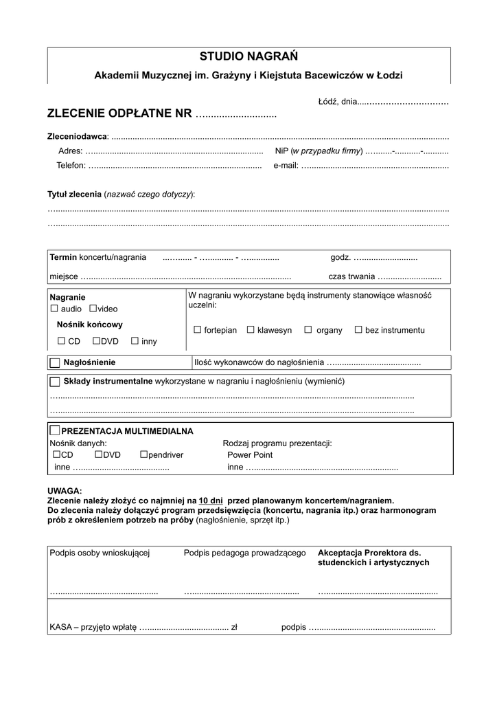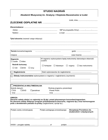 STUDIO NAGRAŃ Akademii Muzycznej im. Grażyny i Kiejstuta Bacewiczów w Łodzi Łódź, dnia.................................. ZLECENIE ODPŁATNE NR ….......................... Zleceniodawca: ................................................................................................................................................. Adres: …......................................................................... NiP (w przypadku firmy) .….......-...........-........... Telefon: …....................................................................... e-mail: …............................................................ Tytuł zlecenia (nazwać czego dotyczy): …......................................................................................................................................................................... …......................................................................................................................................................................... Termin koncertu/nagrania ...…...... - …........... - …............. godz. …........................ miejsce …....................................................................................... Nagranie audio □ czas trwania …........................ W nagraniu wykorzystane będą instrumenty stanowiące własność uczelni: □video Nośnik końcowy □ CD □DVD □ inny □ fortepian □ klawesyn □ organy □ bez instrumentu Nagłośnienie Ilość wykonawców do nagłośnienia …..................................... Składy instrumentalne wykorzystane w nagraniu i nagłośnieniu (wymienić) …......................................................................................................................................................... …......................................................................................................................................................... PREZENTACJA MULTIMEDIALNA Nośnik danych: CD DVD pendriver inne …...................................... □ □ □ Rodzaj programu prezentacji: Power Point inne ….............................................................. UWAGA: Zlecenie należy złożyć co najmniej na 10 dni przed planowanym koncertem/nagraniem. Do zlecenia należy dołączyć program przedsięwzięcia (koncertu, nagrania itp.) oraz harmonogram prób z określeniem potrzeb na próby (nagłośnienie, sprzęt itp.) Podpis osoby wnioskującej Podpis pedagoga prowadzącego Akceptacja Prorektora ds. studenckich i artystycznych …........................................... ….............................................. …................................................ KASA – przyjęto wpłatę …................................... zł podpis …...................................................