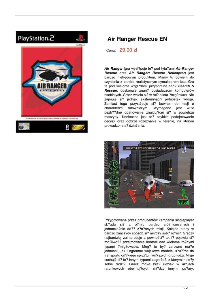 Air Ranger Rescue EN Cena: 29.00 zł Air Ranger (gra wyst?puje te? pod tytu?ami Air Ranger Rescue oraz Air Ranger: Rescue Helicopter) jest bardzo nietypowym produktem. Mamy tu bowiem do czynienia z bardzo realistycznym symulatorem lotu. Gra ta pod wieloma wzgl?dami przypomina seri? Search & Rescue, doskonale znan? posiadaczom komputerów osobistych. Gracz wciela si? w rol? pilota ?mig?owca. Nie zajmuje si? jednak eksterminacj? jednostek wroga. Zamiast tego przyst?puje si? bowiem do misji o charakterze ratowniczym. Wymagane jest wi?c bezb??dne opanowanie znajduj?cej si? w powietrzu maszyny. Konieczne jest te? szybkie podejmowanie decyzji oraz dobrze rozeznanie w terenie, na którym prowadzone s? dzia?ania. Przygotowana przez producentów kampania singleplayer sk?ada si? z o?miu bardzo zró?nicowanych i jednocze?nie do?? z?o?onych misji. Kolejne etapy w bardzo znacz?cy sposób si? mi?dzy sob? ró?ni?. Graczy najbardziej zainteresuje z pewno?ci? to, i? pojawia si? mo?liwo?? przejmowania kontroli nad wieloma ró?nymi typami ?mig?owców. Mog? to by? zarówno ma?e jednostki, jak i ogromne wojskowe modele, s?u??ce do transportu ci??kiego sprz?tu i wi?kszych grup ludzi. Misje cechuj? si? te? innymi typami zagro?e?, z którymi nale?y sobie radzi?. Gracz mo?e bra? udzia? w akcjach ratunkowych obejmuj?cych mi?dzy innymi po?ary, 1/2 zagini?cia, czy karambole na autostradzie. Stopie? trudno?ci ustalony zosta? na do?? wysokim poziomie. Z pomoc? przychodz? widoczne na ekranie wska?niki, informuj?ce mi?dzy innymi o aktualnej wysoko?ci czy pr?dko?ci przemieszczania si?. Air Ranger nie posiada niestety ?adnych trybów multiplayer. Wizualnie gra prezentuje si? do?? przeci?tnie. Najlepiej prezentuj? si? modele ?mig?owców, dzi?ki którym wykonywanie kolejnych zlece? staje si? mo?liwe. Zobacz wideo: 2/2 Powered by TCPDF (www.tcpdf.org)