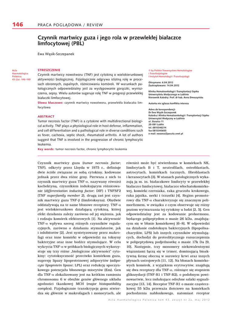 146 praca poglądowa / review Czynnik martwicy guza i jego rola w przewlekłej białaczce limfocytowej (PBL) Ewa Wąsik-Szczepanek Acta Haematologica Polonica; 43 (2a): 146–149 STRESZCZENIE Czynnik martwicy nowotworu (TNF) jest cytokiną o wielokierunkowej aktywności biologicznej. Fizjologicznie odgrywa istotną rolę w procesach obronnych, zapalnych, różnicowaniu komórek. W warunkach patologicznych odpowiedzialny jest za występowanie gorączki, wyniszczenia, sepsy. Wielu autorów sugeruje rolę TNF w progresji przewlekłej białaczki limfocytowej. Słowa kluczowe: czynnik martwicy nowotworu, przewlekła białaczka limfocytowa ABSTRACT Tumor necrosis factor (TNF) is a cytokine with multidirectional biological activity. TNF plays a physiological role in host defense, inflammation, and cell differentiation and a pathological role in diverse conditions such as fever, cachexia, septic shock, rheumatoid arthritis. A lot of authors suggest that TNF is involved in the progression of chronic lymphocytic leukemia. © by Polskie Towarzystwo Hematologów i Transfuzjologów i Instytut Hematologii i Transfuzjologii Otrzymano: 6.04.2012 Zaakceptowano: 14.04.2012 Klinika Hematoonkologii i Transplantacji Szpiku Uniwersytetu Medycznego w Lublinie Kierownik Katedry: Prof. dr hab. Anna Dmoszyńska Autorka nie zgłasza konfliktu interesu Adres do korespondencji: Dr Ewa Wąsik-Szczepanek Katedra i Klinika Hematoonkologii i Transplantacji Szpiku Uniwersytet Medyczny w Lublinie ul. Staszica 11 20-081 Lublin tel. 0815340214 fax 0815345605 e-mail: [email protected] Key words: tumor necrosis factor, chronic lymphocytic leukemia Czynnik martwicy guza (tumor necrosis factor; TNF), odkryty przez Lloyda w 1975 r., definiuje dwie ściśle związane ze sobą cytokiny, kodowane jednak przez dwa różne geny. Pierwsza z nich to czynnik martwicy guza TNF-α, nazywany również kachektyną, czynnikiem indukującym różnicowanie (differentiation inducing factor; DIF) i TNFSF2 (TNF superfamily member 2), drugą zaś jest czynnik martwicy guza TNF-β (limfotoksyna). Obydwie oddziaływają na te same błonowe receptory. TNF-a jest wielokierunkowo działającą cytokiną, której efekt działania zależy zarówno od jej stężenia, jak i rodzaju komórek efektorowych [1]. Na aktywność TNF-a wpływa szereg różnych czynników regulacyjnych, zarówno o działaniu stymulatorów, jak i inhibitorów [2]. Jest syntetyzowany przez makrofagi oraz inne komórki w odpowiedzi na toksyny bakteryjne oraz inne bodźce stymulujące. W celu wykrycia TNF-a w próbkach biologicznych wykorzystuje się trzy różne „biologiczne aktywności” cytokiny: cytotoksyczność przeciwko komórkom guza, supresję lipazy lipoproteinowej adipocytów (adipocyte lipoprotein lipase; LPL) oraz redukcję spoczynkowego potencjału błonowego miocytów (Em). Gen dla TNF-α zlokalizowany jest na krótkim ramieniu chromosomu 6 w obrębie genów głównego układu zgodności tkankowej MCH (major histopatibility complex). Fizjologicznie transkrypcję genu stwierdza się głównie w makrofagach i monocytach, ale również może być stwierdzona w komórkach NK, limfocytach B i T, neutrofilach, osteoblastach, astrocytach, komórkach tucznych, fibroblastach i keranocytach [3]. W stanach patologicznych wykazują ją m. in. białaczkowe limfocyty w przewlekłej białaczce limfocytowej, białaczce włochatokomórkowej, komórki czerniaka, raka gruczołu krokowego, raka jajnika, nerki i trzustki [4]. Region promotorowy dla TNF-a charakteryzuje się znacznym polimorfizmem, w związku z czym obserwuje się różny poziom wytwarzania tej cytokiny u ludzi [2, 5]. Gen odpowiedzialny jest za kodowanie prohormonu, będącego polipeptydem o masie 26 kDa, znajdującym się w błonie komórkowej [6–8]. W odpowiedzi na działanie endotoksyn bakteryjnych (lipopolisacharydów, LPS) lub innych czynników stymulujących, dochodzi do proteolitycznego rozszczepienia w polipeptydową podjednostkę o masie 17k Da [9, 10]. Następnie, trzy monomery niekowalentnymi wiązaniami łączą się w trimer, dominującą bioaktywną formę obecną w surowicy krwi oraz innych płynach ustrojowych [11, 12]. Na błonach komórkowych komórek, z wyjątkiem erytrocytów, znajdują się dwa receptory dla TNF-a, różniące się stopniem glikozydacji (TNF-R1 i TNF-R2), o podobnym powinowactwie, lecz indukujące odrębne szlaki sygnalizacyjne [13, 14]. Receptor TNF-R1 o masie cząsteczkowej 55 kDa przeważa ilościowo na komórkach pochodzenia nabłonkowego, natomiast receptor Ac t a H aemato l og ic a Po l o nic a to m 43, ze s z y t nr 2a , maj 2012 praca poglądowa / review TNF-R2 o masie cząsteczkowej 75 kDa występuje najczęściej na komórkach pochodzenia szpikowego [15, 16]. Białaczkowe limfocyty B wykazują ekspresję obydwu receptorów, z których TNF-R2 wydaje się odgrywać rolę dominującą [17]. W surowicy oraz moczu chorych z różnymi schorzeniami, w tym nowotworowymi, w przebiegu sepsy, AIDS wykrywane są fragmenty obydwu receptorów (TNF-binding proteins; TNF-BPs) [18–20]. Interesująca jest biologiczna rola TNF-BPs. W niektórych przypadkach hamują one aktywność TNF-a poprzez uniemożliwienie interakcji receptor–ligand, w innych zaś mogą wydłużać lub wzmacniać jego aktywność poprzez stabilizację trimerycznej struktury cytokiny, zapobiegając tym samym usunięciu jej z surowicy [21, 22]. Zdaniem niektórych, autorów wydzielanie TNF-BPs występuje podczas nadmiernej produkcji cytokiny, chroniąc tym samym przed wystąpieniem efektów toksyczności. W przebiegu chorób nowotworowych TNF-a odpowiedzialny jest za kacheksję. Wydłużona ekspozycja na TNF-a powoduje utratę białek, tłuszczów, masy krwinek czerwonych oraz insulinooporność [23, 24]. U chorych z PBL obserwuje się wzrost poziomu TNF-a w surowicy krwi [25–28]. Przeprowadzone badania wykazały w warunkach in vitro wydzielanie TNF-a przez komórki białaczkowe, przy jednoczesnym znaczącym wpływ