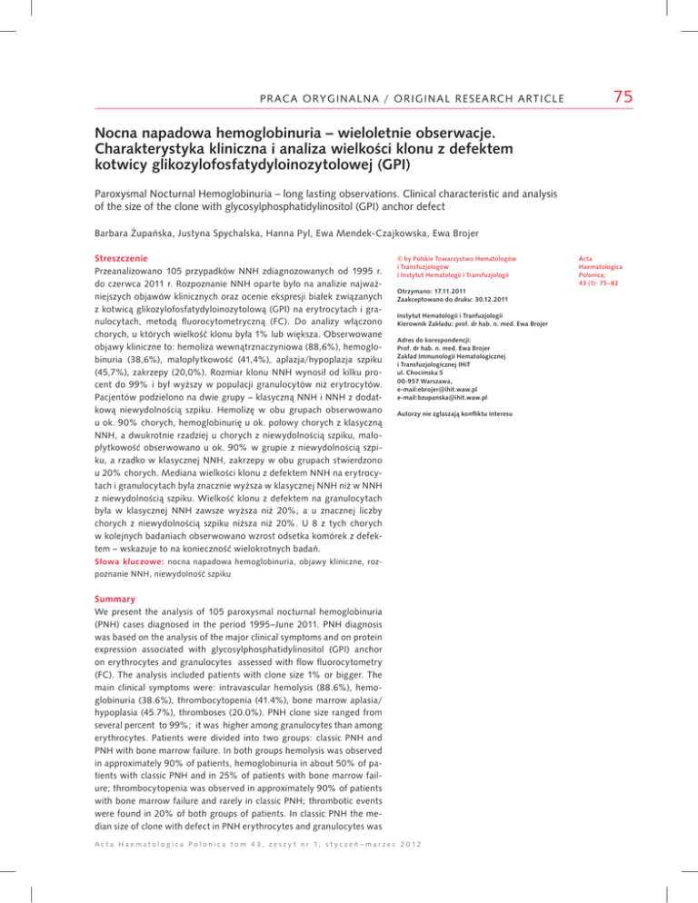PRACA ORYGINALNA / ORIGINAL RESEARCH ARTICLE 75 Nocna napadowa hemoglobinuria – wieloletnie obserwacje. Charakterystyka kliniczna i analiza wielkości klonu z defektem kotwicy glikozylofosfatydyloinozytolowej (GPI) Paroxysmal Nocturnal Hemoglobinuria – long lasting observations. Clinical characteristic and analysis of the size of the clone with glycosylphosphatidylinositol (GPI) anchor defect Barbara Żupańska, Justyna Spychalska, Hanna Pyl, Ewa Mendek-Czajkowska, Ewa Brojer Streszczenie Przeanalizowano 105 przypadków NNH zdiagnozowanych od 1995 r. do czerwca 2011 r. Rozpoznanie NNH oparte było na analizie najważniejszych objawów klinicznych oraz ocenie ekspresji białek związanych z kotwicą glikozylofosfatydyloinozytolową (GPI) na erytrocytach i granulocytach, metodą fluorocytometryczną (FC). Do analizy włączono chorych, u których wielkość klonu była 1% lub większa. Obserwowane objawy kliniczne to: hemoliza wewnątrznaczyniowa (88,6%), hemoglobinuria (38,6%), małopłytkowość (41,4%), aplazja/hypoplazja szpiku (45,7%), zakrzepy (20,0%). Rozmiar klonu NNH wynosił od kilku procent do 99% i był wyższy w populacji granulocytów niż erytrocytów. Pacjentów podzielono na dwie grupy – klasyczną NNH i NNH z dodatkową niewydolnością szpiku. Hemolizę w obu grupach obserwowano u ok. 90% chorych, hemoglobinurię u ok. połowy chorych z klasyczną NNH, a dwukrotnie rzadziej u chorych z niewydolnością szpiku, małopłytkowość obserwowano u ok. 90% w grupie z niewydolnością szpiku, a rzadko w klasycznej NNH, zakrzepy w obu grupach stwierdzono u 20% chorych. Mediana wielkości klonu z defektem NNH na erytrocytach i granulocytach była znacznie wyższa w klasycznej NNH niż w NNH z niewydolnością szpiku. Wielkość klonu z defektem na granulocytach była w klasycznej NNH zawsze wyższa niż 20%, a u znacznej liczby chorych z niewydolnością szpiku niższa niż 20%. U 8 z tych chorych w kolejnych badaniach obserwowano wzrost odsetka komórek z defektem – wskazuje to na konieczność wielokrotnych badań. © by Polskie Towarzystwo Hematologów i Transfuzjologów i Instytut Hematologii i Transfuzjologii Otrzymano: 17.11.2011 Zaakceptowano do druku: 30.12.2011 Instytut Hematologii i Tranfuzjologii Kierownik Zakładu: prof. dr hab. n. med. Ewa Brojer Adres do korespondencji: Prof. dr hab. n. med. Ewa Brojer Zakład Immunologii Hematologicznej i Transfuzjologicznej IHiT ul. Chocimska 5 00-957 Warszawa, e-mail:[email protected] e-mail:[email protected] Autorzy nie zgłaszają konfliktu interesu Słowa kluczowe: nocna napadowa hemoglobinuria, objawy kliniczne, rozpoznanie NNH, niewydolność szpiku Summary We present the analysis of 105 paroxysmal nocturnal hemoglobinuria (PNH) cases diagnosed in the period 1995–June 2011. PNH diagnosis was based on the analysis of the major clinical symptoms and on protein expression associated with glycosylphosphatidylinositol (GPI) anchor on erythrocytes and granulocytes assessed with flow fluorocytometry (FC). The analysis included patients with clone size 1% or bigger. The main clinical symptoms were: intravascular hemolysis (88.6%), hemoglobinuria (38.6%), thrombocytopenia (41.4%), bone marrow aplasia/ hypoplasia (45.7%), thromboses (20.0%). PNH clone size ranged from several percent to 99%; it was higher among granulocytes than among erythrocytes. Patients were divided into two groups: classic PNH and PNH with bone marrow failure. In both groups hemolysis was observed in approximately 90% of patients, hemoglobinuria in about 50% of patients with classic PNH and in 25% of patients with bone marrow failure; thrombocytopenia was observed in approximately 90% of patients with bone marrow failure and rarely in classic PNH; thrombotic events were found in 20% of both groups of patients. In classic PNH the median size of clone with defect in PNH erythrocytes and granulocytes was Ac t a H aemato l og ic a Po l onic a to m 43, ze s z y t nr 1, s t yc ze ń – ma r ze c 2012 Acta Haematologica Polonica; 43 (1): 75–82 76 PRACA ORYGINALNA / ORIGINAL RESEARCH ARTICLE significantly higher than in PNH with bone marrow failure. Clone size with GPI defect on granulocytes in the classic PNH was always >20%, and <20% in a significant number of patients with bone marrow failure. In 8 such patients, subsequent studies revealed increase in the percentage of cells with defect. Follow up investigation of the size of the PNH clone seem therefore warranted. Keywords: Paroxysmal Nocturnal Hemoglobinuria, clinical symptoms, PNH diagnosis, bone marrow failure Niedokrwistość z hemoglobinurią została zauważona w XIX wieku. W latach 1928–1931 opisano kliniczne objawy u chorych i użyto nazwy „nocna napadowa hemoglobinuria” (NNH) (Paroxysmal Nocturnal Hemoglobinuria; PNH). Po kilku latach wprowadzono do diagnostyki test z zakwaszoną surowicą (test Hama). Służył on długie lata, często łącznie z testem sacharozowym [1]. Przez wiele lat NNH kojarzono tylko z objawami klinicznymi, które sugerowała nazwa, wobec tego rozpoznawano ją bardzo rzadko. Nowe spojrzenie na tę chorobę zaczęło się na przełomie lat 80. i 90. po wykryciu, że jest ona następstwem nabytego, klonalnego defektu hematopoetycznej komórki macierzystej, który dotyczy również innych niż erytrocyty komórek krwi. Defekt ten doprowadza do niedoboru białek połączonych z błoną komórkową za pomocą kotwicy glikozylofosfatydyloinozytolowej (GPI). Jest on wynikiem mutacji somatycznej genu PIG-A (phosphatidylinositol glycan class A) odpowiedzialnego za pierwszy etap biosyntezy kotwicy GPI, a zlokalizowanego na chromosomie X. W NNH dochodzi między innymi do niedoboru białek regulujących aktywność dopełniacza: CD59 (membrane inhibitor of reactive lysis; MIRL) i CD55 (decay accelerating factor; DAF). Od lat 90. liczba rozpoznawanych przypadków NNH zaczęła rosnąć, głównie dzięki wprowadzeniu do diagnostyki metody fluorocytometrycznej pozwalającej na 