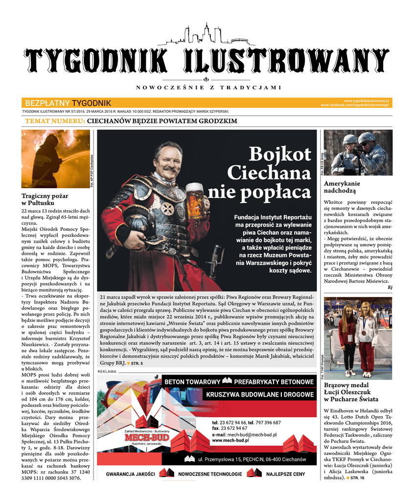 bezpłatny tygodnik www.tygodnikilustrowany.pl www.facebook.com/tygodnikilustrowanypl TYGODNIK ILUSTROWANY NR 57/2016. 29 MARCA 2016 R. NAKŁAD: 10.000 EGZ. REDAKTOR PROWADZĄCY: MAREK SZYPERSKI. TEMAT NUMERU: Ciechanów będzie powiatem grodzkim Bojkot Ciechana nie popłaca Tragiczny pożar w Pułtusku 22 marca 13 rodzin straciło dach nad głową. Zginął 65-letni mężczyzna. Miejski Ośrodek Pomocy Społecznej wypłacił poszkodowanym zasiłek celowy z budżetu gminy na każde dziecko i osobę dorosłą w rodzinie. Zapewnił także pomoc psychologa. Pracownicy MOPS, Towarzystwa Budownictwa Społecznego i Urzędu Miejskiego są do dyspozycji poszkodowanych i na bieżąco monitorują sytuację. - Trwa oczekiwanie na ekspertyzy Inspektora Nadzoru Budowlanego oraz biegłego powołanego przez policję. Po nich będzie możliwe podjęcie decyzji o zakresie prac remontowych w spalonej części budynku – informuje burmistrz Krzysztof Nuszkiewicz. - Zostały przyznane dwa lokale zastępcze. Pozostałe rodziny zadeklarowały, że tymczasowo mogą przebywać u bliskich. MOPS prosi ludzi dobrej woli o możliwość bezpłatnego przekazania: odzieży dla dzieci i osób dorosłych w rozmiarze od 104 cm do 176 cm, kołder, poduszek oraz bielizny pościelowej, koców, ręczników, środków czystości. Dary można przekazywać do siedziby Ośrodka Wsparcia Środowiskowego Miejskiego Ośrodka Pomocy Społecznej, ul. 13 Pułku Piechoty 1, w godz. 8-18. Darowizny pieniężne dla osób poszkodowanych w pożarze można przekazać na rachunek bankowy MOPS: nr rachunku 37 1240 5309 1111 0000 5043 3076. Fundacja Instytut Reportażu ma przeprosić za wylewanie piwa Ciechan oraz namawianie do bojkotu tej marki, a także wpłacić pieniądze na rzecz Muzeum Powstania Warszawskiego i pokryć koszty sądowe. Amerykanie nadchodzą Wkrótce powinny rozpocząć się remonty w dawnych ciechanowskich koszarach związane z bardzo prawdopodobnym stacjonowaniem w nich wojsk amerykańskich. - Mogę potwierdzić, że obecnie podpisywane są umowy pomiędzy stroną polska, amerykańską i miastem, żeby móc prowadzić prace i przetargi związane z bazą w Ciechanowie – powiedział rzecznik Ministerstwa Obrony Narodowej Bartosz Misiewicz. Ej 21 marca zapadł wyrok w sprawie założonej przez spółki: Piwa Regionów oraz Browary Regionalne Jakubiak przeciwko Fundacji Instytut Reportażu. Sąd Okręgowy w Warszawie uznał, że Fundacja w całości przegrała sprawę. Publiczne wylewanie piwa Ciechan w obecności ogólnopolskich mediów, które miało miejsce 22 września 2014 r., publikowanie wpisów promujących akcję na stronie internetowej kawiarni „Wrzenie Świata” oraz publicznie nawoływanie innych podmiotów gospodarczych i klientów indywidualnych do bojkotu piwa produkowanego przez spółkę Browary Regionalne Jakubiak i dystrybuowanego przez spółkę Piwa Regionów były czynami nieuczciwej konkurencji oraz stanowiły naruszenie art. 3, art. 14 i art. 15 ustawy o zwalczaniu nieuczciwej konkurencji. - Wygraliśmy, sąd podzielił naszą opinię, że nie można bezprawnie obrażać przedsiębiorców i demonstracyjnie niszczyć polskich produktów – komentuje Marek Jakubiak, właściciel Grupy BRJ. str. 5 reklama • Brązowy medal Łucji Oleszczuk w Pucharze Świata W Eindhoven w Holandii odbył się 43. Lotto Dutch Open Taekwondo Championships 2016, turniej rankingowy Światowej Federacji Taekwondo , zaliczany do Pucharu Świata. W zawodach wystartowały dwie zawodniczki Miejskiego Ogniska TKKF Promyk w Ciechanowie: Łucja Oleszczuk (juniorka) i Alicja Laskowska (juniorka młodsza). str. 16 • 2 | TEMAT NUMERU 29 marca 2016 | www.tygodnikilustrowany.pl | TYGODNIK ILUSTROWANY Ciechanów będzie powiatem grodzkim Wraca sprawa sprzed kilkunastu lat – Ciechanów będzie jednak powiatem grodzkim. Dla miasta to niewątpliwe korzystne rozwiązanie, czy jednak także dla okolicznych gmin tworzących dziś powiat ciechanowski ziemski. Bo Buzek prosił Gdy w 1999 r. przestawało istnieć 49 „gierkowskich” województw, w tym ciechanowskie – przed jego stolicą stał wybór: powiat grodzki, czy ziemski. Pierwsza opcja oznaczała wiele plusów: np. jeden zarządca dróg w mieście, oświata – od przedszkoli po szkoły ponadgimnazjalne skupiona w jednym „ręku”, więcej etatów w komendzie policji. Ówczesny premier Jerzy Buzek z rządzącej Polską koalicji Akcji Wyborczej „Solidarność” i Unii Wolności dwoił się i troił, by jak najwięcej miast tracących rangę stolicy województwa wybrało powiaty ziemskie. Obiet- nic nie szczędził. Ze skutkiem raczej mizernym, bo „ziemskość” wybrały tylko Piła, Sieradz i właśnie Ciechanów. Piszący te słowa był świadkiem spotkania, na jakie do ciechanowskiego ratusza zaprosił okolicznych wójtów ówczesny prezydent miasta. Wszyscy zgodnie oświadczyli, że „bycie” w powiecie ciechanowskim ziemskim – bez Ciechanowa ich nie interesuje. Wszystkie gminy (poza chyba tylko gminą wiejską Ciechanów) miały alternatywne wizje przynależności w takim układzie do innych, sąsiednich powiatów: mławskiego, przasnyskiego, czy też płońskiego. Opowiedziano się więc za powiatem ziemskim złożonym z Ciechanowa, miasta i gminy Glinojeck oraz gmin: Ciechanów, Glinojeck, Gołymin, Grudusk, Ojrzeń, Opinogóra, Regimin i Sońsk. Związana historycznie z powiatem ciechanowskim gmina Krasne wybrała powiat przasnyski. Temat na fali Dylemat: grodzki czy ziemski co jakiś czas powracał, ale przez ostatnie lata wszyscy chyba pogodzili się już z istniejącym stanem rzeczy. Jednak po zwycięstwie w ostatnich wyborach parlamentarnych Prawa i Sprawiedliwości okazało się, że nic nie trwa wiecznie. Pojawiły się pomysły na utworzenie nowych województw, takich jak środkowopomorskie czy częstochowskie. Na Mazowszu gorącym tematem stało się wydzielenie Warszawy i utworzenie dwóch województw. Nic więc dziwnego, że powrócono też do te