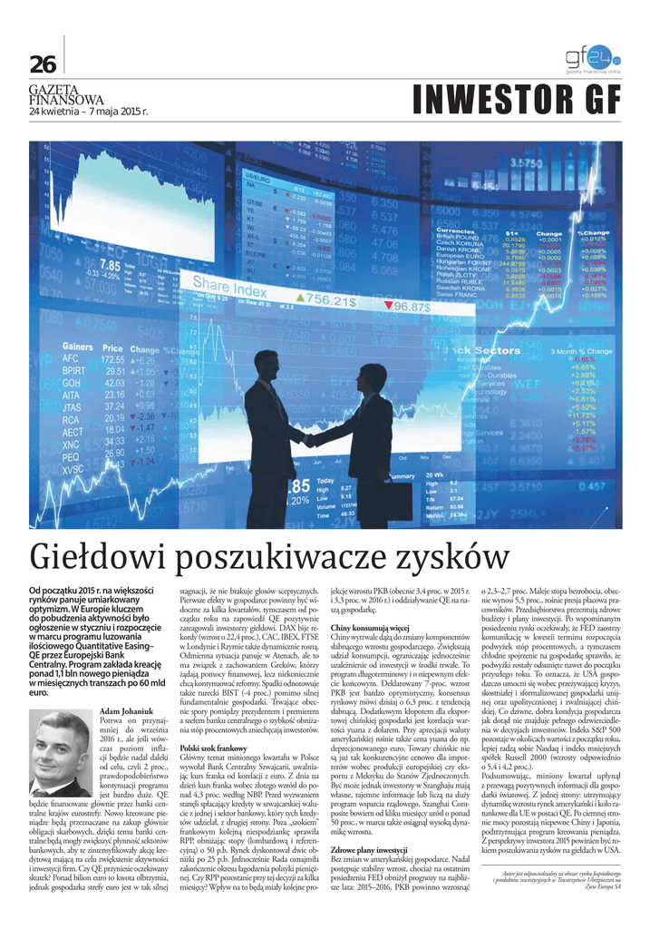 26 INWESTOR GF 24 kwietnia – 7 maja 2015 r. Giełdowi poszukiwacze zysków Od początku 2015 r. na większości rynków panuje umiarkowany optymizm. W Europie kluczem do pobudzenia aktywności było ogłoszenie w styczniu i rozpoczęcie w marcu programu luzowania ilościowego Quantitative Easing– QE przez Europejski Bank Centralny. Program zakłada kreację ponad 1,1 bln nowego pieniądza w miesięcznych transzach po 60 mld euro. Adam Johaniuk Potrwa on przynajmniej do września 2016 r., ale jeśli wówczas poziom inflacji będzie nadal daleki od celu, czyli 2 proc., prawdopodobieństwo kontynuacji programu jest bardzo duże. QE będzie finansowane głównie przez banki centralne krajów eurostrefy. Nowo kreowane pieniądze będą przeznaczane na zakup głównie obligacji skarbowych, dzięki temu banki centralne będą mogły zwiększyć płynność sektorów bankowych, aby te zintensyfikowały akcję kredytową mającą na celu zwiększenie aktywności i inwestycji firm. Czy QE przyniesie oczekiwany skutek? Ponad bilion euro to kwota olbrzymia, jednak gospodarka strefy euro jest w tak silnej stagnacji, że nie brakuje głosów sceptycznych. Pierwsze efekty w gospodarce powinny być widoczne za kilka kwartałów, tymczasem od początku roku na zapowiedź QE pozytywnie zareagowali inwestorzy giełdowi. DAX bije rekordy (wzrost o 22,4 proc.), CAC, IBEX, FTSE w Londynie i Rzymie także dynamicznie rosną. Odmienna sytuacja panuje w Atenach, ale to ma związek z zachowaniem Greków, którzy żądają pomocy finansowej, lecz niekoniecznie chcą kontynuować reformy. Spadki odnotowuje także turecki BIST (-4 proc.) pomimo silnej fundamentalnie gospodarki. Trwające obecnie spory pomiędzy prezydentem i premierem a szefem banku centralnego o szybkość obniżania stóp procentowych zniechęcają inwestorów. Polski szok frankowy Główny temat minionego kwartału w Polsce wywołał Bank Centralny Szwajcarii, uwalniając kurs franka od korelacji z euro. Z dnia na dzień kurs franka wobec złotego wzrósł do ponad 4,3 proc. według NBP. Przed wyzwaniem stanęli spłacający kredyty w szwajcarskiej walucie z jednej i sektor bankowy, który tych kredytów udzielał, z drugiej strony. Poza „szokiem” frankowym kolejną niespodziankę sprawiła RPP, obniżając stopy (lombardową i referencyjną) o 50 p.b. Rynek dyskontował dwie obniżki po 25 p.b. Jednocześnie Rada oznajmiła zakończenie okresu łagodzenia polityki pieniężnej. Czy RPP pozostanie przy tej decyzji za kilka miesięcy? Wpływ na to będą miały kolejne pro- jekcje wzrostu PKB (obecnie 3,4 proc. w 2015 r. i 3,3 proc. w 2016 r.) i oddziaływanie QE na naszą gospodarkę. Chiny konsumują więcej Chiny wytrwale dążą do zmiany komponentów słabnącego wzrostu gospodarczego. Zwiększają udział konsumpcji, ograniczając jednocześnie uzależnienie od inwestycji w środki trwałe. To program długoterminowy i o niepewnym efekcie końcowym. Deklarowany 7-proc. wzrost PKB jest bardzo optymistyczny, konsensus rynkowy mówi dzisiaj o 6,3 proc. z tendencją słabnącą. Dodatkowym kłopotem dla eksportowej chińskiej gospodarki jest korelacja wartości yuana z dolarem. Przy aprecjacji waluty amerykańskiej rośnie także cena yuana do np. deprecjonowanego euro. Towary chińskie nie są już tak konkurencyjne cenowo dla importerów wobec produkcji europejskiej czy eksportu z Meksyku do Stanów Zjednoczonych. Być może jednak inwestorzy w Szanghaju mają własne, tajemne informacje lub liczą na duży program wsparcia rządowego, Szanghai Composite bowiem od kliku miesięcy urósł o ponad 50 proc., w marcu także osiągnął wysoką dynamikę wzrostu. Zdrowe plany inwestycji Bez zmian w amerykańskiej gospodarce. Nadal postępuje stabilny wzrost, chociaż na ostatnim posiedzeniu FED obniżył prognozy na najbliższe lata: 2015–2016, PKB powinno wzrosnąć o 2,3–2,7 proc. Maleje stopa bezrobocia, obecnie wynosi 5,5 proc., rośnie presja płacowa pracowników. Przedsiębiorstwa prezentują zdrowe budżety i plany inwestycji. Po wspominanym posiedzeniu rynki oczekiwały, że FED zaostrzy komunikację w kwestii terminu rozpoczęcia podwyżek stóp procentowych, a tymczasem chłodne spojrzenie na gospodarkę sprawiło, że podwyżki zostały odsunięte nawet do początku przyszłego roku. To oznacza, że USA gospodarczo umocni się wobec przeżywającej kryzys, skostniałej i sformalizowanej gospodarki unijnej oraz upolitycznionej i zwalniającej chińskiej. Co dziwne, dobra kondycja gospodarcza jak dotąd nie znajduje pełnego odzwierciedlenia w decyzjach inwestorów. Indeks S&P 500 pozostaje w okolicach wartości z początku roku, lepiej radzą sobie Nasdaq i indeks mniejszych spółek Russell 2000 (wzrosty odpowiednio o 5,4 i 4,2 proc.). Podsumowując, miniony kwartał upłynął z przewagą pozytywnych informacji dla gospodarki światowej. Z jednej strony: utrzymujący dynamikę wzrostu rynek amerykański i koło ratunkowe dla UE w postaci QE. Po ciemnej stronie mocy pozostają niepewne Chiny i Japonia, podtrzymująca program kreowania pieniądza. Z perspektywy inwestora 2015 powinien być rokiem poszukiwania zysków na giełdach w USA. Autor jest odpowiedzialny za obszar rynku kapitałowego i produktów inwestycyjnych w Towarzystwie Ubezpieczeń na Życie Europa SA INWESTOR GF 27 24 kwietnia – 7 maja 2015 r. Inwestowanie samodzielne kontra fundusz inwestycyjny Inwestorzy zainteresowani zarabianiem na rynkach kapitałowych mają do wyboru dwa podstawowe sposoby inwestowania: samodzielnie lub poprzez fundusz inwestycyjny. Inwestując samodzielnie, mamy całkowitą kontrolę nad dokonywanymi transakcjami, jednak wymaga to dużej wiedzy i poświęcania znacznej ilości czasu. Inwestując poprzez fundusz, powierzamy środki profesjonalistom i nie musimy śledzić sytuacji na rynkach, ale nie mamy też pełnej kontroli i wpływu na to, w jaki sposób są lokowane nasze środki. Artur Honek Ogólnie rzecz biorąc, inwestowanie sa