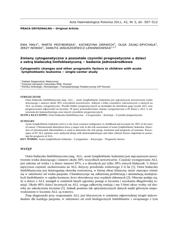 Acta Haematologica Polonica 2011, 42, Nr 3, str. 507–512 PRACA ORYGINALNA – Original Article EWA MAŁY1, MARTA PRZYBORSKA1, KATARZYNA DERWICH3, OLGA ZAJĄC-SPYCHAŁA3, JERZY NOWAK2, DANUTA JANUSZKIEWICZ-LEWANDOWSKA1,2,3 Zmiany cytogenetyczne a pozostałe czynniki prognostyczne u dzieci z ostrą białaczką limfoblastyczną – badanie jednoośrodkowe Cytogenetic changes and other prognostic factors in children with acute lymphoblastic leukemia – single-center study 1 Zakład Diagnostyki Medycznej Instytut Genetyki Człowieka PAN, Poznań 3 Klinika Onkologii, Hematologii i Transplantologii Pediatrycznej UM Poznań 2 STRESZCZENIE Ostra białaczka limfoblastyczna (ang. ALL – acute lymphoblastic leukemia) jest najczęstszym nowotworem wieku dziecięcego i stanowi około 30% wszystkich nowotworów. Jednym z kilku czynników rokowniczych u chorych na ALL są zmiany cytogenetyczne. Wyniki badań cytogenetycznych są niezbędne do określenia grup ryzyka ALL oraz prognozowania odpowiedzi na leczenie. W pracy przeanalizowano zmiany cytogenetyczne u 85 dzieci z ALL w odniesieniu do immunofenotypu oraz innych czynników prognostycznych. SŁOWA KLUCZOWE: Ostra białaczka limfoblastyczna – Cytogenetyka – Kariotyp – Czynniki prognostyczne. SUMMARY Acute lymphoblastic leukemia (ALL) is the most common malignancy in childhood and accounts for 30% of all cases of cancer. Chromosomal aberrations have a major role in the risk assessment of acute lymphoblastic leukemia. Detection of chromosomal abnormalities is used to determine the risk group, treatment and prognosis of outcome. Karyotypes of 85 ALL patients were analyzed along with immunophenotype and other clinical factors important in assessing the prognosis of ALL. KEY WORDS: Acute lymphoblastic leukemia – Cytogenetics – Karyotype – Prognostic factors. WSTĘP Ostra białaczka limfoblastyczna (ang. ALL, acute lymphoblastic leukemia) jest najczęstszym nowotworem wieku dziecięcego i stanowi około 30% wszystkich nowotworów. Częstość występowania ALL jest zaleŜna od wieku i u dzieci stanowi 85%, a u dorosłych juŜ tylko 20% ostrych białaczek. U dzieci najwyŜsza częstość zachorowania na ALL dotyczy przedziału wiekowego 2–6 lat [1]. Ostra białaczka limfoblastyczna jest heterogenną chorobą rozrostową, w której obraz kliniczny moŜe znacząco róŜnić się w zaleŜności od wieku pacjenta. Charakteryzuje się zaburzoną proliferacją i akumulacją niedojrzałych limfoblastów w szpiku kostnym, krwi obwodowej oraz węzłach chłonnych [2]. Obecnie podaje się, Ŝe u dzieci z ALL nastąpił w ostatnich latach ogromny postęp w leczeniu i uzyskaniu długotrwałej remisji. Około 80% dzieci leczonych na ALL osiąga całkowitą remisję i ma 5-letni okres wolny od choroby po zakończeniu leczenia [3]. Jednak pomimo tak optymistycznych danych nadal głównym niepowodzeniem w leczeniu ALL są wznowy. Etap diagnostyki przy rozpoznaniu ALL jest kluczowym w ustaleniu odpowiedniej terapii indywidualnie dla kaŜdego pacjenta, w zaleŜności od cech biologicznych limfoblastów i związanego z tym E. MAŁY i wsp. 508 typu ALL [4]. W Polsce stosuje się obecnie w leczeniu ALL u dzieci powyŜej 1 roku Ŝycia program ALL IC BFM 2002, w którym czynnikami prognostycznymi są: płeć, wiek i liczba leukocytów w momencie diagnozy, cytogenetyczne wskaźniki rokownicze, kariotyp i obecność charakterystycznych translokacji, reakcja na wstępną doustną kortykosterydoterapię i czas uzyskania remisji. Na tej podstawie kwalifikuje się pacjentów do grup ryzyka: standardowego, pośredniego oraz wysokiego [5]. Celem niniejszej pracy była analiza zmian cytogenetycznych u 85 pacjentów z ALL w powiązaniu z pozostałymi czynnikami prognostycznymi. MATERIAŁ I METODY Analizie poddano 85 pacjentów z rozpoznaniem ALL leczonych w Klinice Onkologii, Hematologii i Transplantologii Pediatrycznej UM w Poznaniu w okresie od marca 2006 r. do września 2010 r. Łącznie było 36 dziewczynek oraz 49 chłopców w wieku od 1 roku do 17 lat (średnia wieku: 6,7 lat). Immunofenotyp komórek blastycznych oznaczano stosując standardowy panel przeciwciał monoklonalnych. Cytomorfologię szpiku kostnego analizowano po barwieniu techniką Maya-GrunwaldaGiemsy. SterydowraŜliwość ustalano na podstawie analizy mikroskopowej rozmazu krwi obwodowej w 8 dobie leczenia indukcyjnego. Remisję w dobach 15 i 33 leczenia ustalano wykazując obecność mniej niŜ 5% blastów w preparatach szpiku kostnego. Analiza cytogenetyczna obejmowała 24-godzinną hodowlę szpiku kostnego w celu uzyskania preparatów chromosomów metafazowych i ułoŜenia kariotypu. Ponadto wykonywano standardowo dla kaŜdego pacjenta badanie techniką FISH (fluorescencyjnej hybrydyzacji in situ) z zastosowaniem sond: t(9;22) BCR/ABL, t(12;21) TEL/AML1 oraz MLL (Kreatech). WYNIKI Immunofenotyp skorelowany z wynikami cytogenetycznymi wśród 85 pacjentów przedstawiono w Tabeli 1. W analizowanej grupie 7 pacjentów miało typ T-ALL, co stanowi 8,2%. W pozostałej grupie B-ALL rozkład na podtypy wygląda następująco: 6 pacjentów z pro-B ALL (7,1%), 17 pacjentów z pre-B ALL (20%) oraz 30 pacjentów z common B-ALL (35,3%). Grupa pacjentów z ostrą białaczką bifenotypową (BAL) lub ALL z koekspresją antygenów mieloidalnych liczyła 25 pacjentów – 29,5% (odpowiednio: 6–7,1% i 19 – 22,4%). Tabela 1. Zmiany cytogenetyczne u 85 pacjentów w podtypach immunofenotypowych ALL Table 1. Cytogenetic aberrations of 85 ALL patients according to different immunophenotype Pro-B N=6 Common-B N=30 4/5 (80%) 15/26 (57,7%) Kariotyp Kariotyp dłowy t (12;21) prawi- Pre-B N=17 8/14 (57,3%) T-ALL N=7 4/5 (80%) Ostra białaczka bifenotypowa N=6 1/4 (25%) ALL z koekspresją antygenów mieloidalnych N=19 9/17 (52,9%) 0 4/26 (15,4%) 1/14 (7,1%) 0 2/4 (50%) 5/17 (29,4%) Tetrasomia 21 0 4/26 (15,4%) 2/14 (14,3%) 0 0 1/17 (5,9%) Hiperdiploidia 0 3/26 (11,5%) 1/14 (7,1%) 0 0 1/17 (5,9%) Kariotyp złoŜony 1/5 (20
