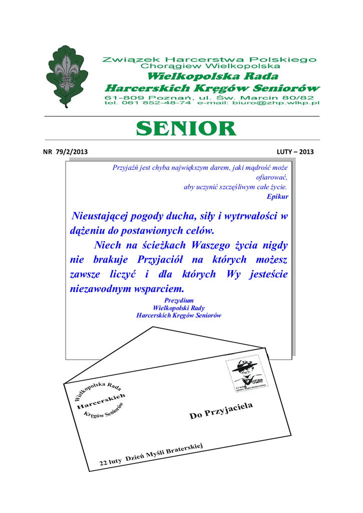 NR 79/2/2013 LUTY – 2013 Przyjaźń jest chyba największym darem, jaki mądrość może ofiarować, aby uczynić szczęśliwym całe życie. Epikur Nieustającej pogody ducha, siły i wytrwałości w dążeniu do postawionych celów. Niech na ścieżkach Waszego życia nigdy nie brakuje Przyjaciół na których możesz zawsze liczyć i dla których Wy jesteście niezawodnym wsparciem. Prezydium Wielkopolski Rady Harcerskich Kręgów Seniorów K rę or ów Wie lk olska Rada op i gów Sen Bra Myśli ń e i z y D 22 lut c ie rzyja P o D ej terski la 4. I N F O R M A C J E : - „B I A Ł A R Ó Ż A – AKCJA FLORIAN ” W DNIU 23 LUTEGO (sobota) ODBĘDZIE SIĘ 4 HARCERSKA GRA MIEJSKA której organizatorem jest 100 PDH im. gen. Maczka pod patronatem Komendy Chorągwi Wlkp. ZHP. O godz. 14.00 pod pomnikiem Paostwa Podziemnego w Alei Niepodległości ( naprzeciwko kościoła o.o. Dominikanów za Operą Poznaoską) odbędzie się UROCZYSTY APEL na który organizatorzy serdecznie zapraszają liczne reprezentacje HARCERSKICH KRĘGÓW SENIORÓW Chorągwi Wielkopolskiej. Zbiórka Kręgów godz.13,30 na zapleczu Opery. - XXIX Harcerski Rajd Rodło, Starogard Gdaoski 24-26.05.2013. XXIX Harcerski Rajd Rodło odbędzie się w dniach 24-26 maja 2013 r. na Kociewiu w Starogardzie Gdaoskim. W programie Trasy Seniorów przewidujemy: W piątek- po południu poznanie centrum Starogardu, historii i zabytków miasta. Wieczorem Ognisko Trasy w Skansenie w Owidzu . W sobotę - wycieczka do Pelplina, miejsca studiów i formacji duchowej bł. Ks. Stefana Wincentego Frelichowskiego, patrona Harcerstwa. Zwiedzanie najstarszego w Polsce Leśnego Ogrodu Dendrologicznego Wirty. Odwiedziny w Harcerskim Ośrodku Wodnym Funka nad j. Charzykowskim. Ognisko Rajdowe w Skansenie w Owidzu. W niedzielę- harcerska, polowa msza św. i tradycyjne zakooczenie rajdu w centrum miasta. Noclegi w pokojach 2 i 3 osobowych oraz wyżywienie zapewniamy w internacie szkolnym w Owidzu w hotelu turystycznym w Starogardzie GD. Limit miejsc noclegowych 140. Uczestnicy rajdu będą odbierani z dworca PKP w Starogardzie Gdaoskim. Całkowity koszt uczestnictwa 190 zł/ osobę. Wstępne zgłoszenia( ilośd osób) z Kręgu, należy zgłaszad do 15 marca 2013. Na adres: hm. Bogdan Radys, ZHP Komenda Chorągwi Gdaoskiej ul. Za Murami 2/10, 80-823 Gdaosk, lub pocztą elektroniczną na adres: [email protected] Imienne zgłoszenia oraz opłatę uczestnictwa na konto Chorągwi Gdaoskiej należy dokonad do 15 kwietnia 2013. ZHP CHORĄGIEW GDAOSKA, 80-823 GDAOSK ul. ZA MURAMI 2-10, nr rach. 51 1160 2202 0000 0000 5248 0766 Ze względu na ograniczenie miejsc noclegowych, proszę o bezwzględne dotrzymanie terminów zgłoszeo i opłat. O przyjęciu uczestników na rajd, zadecyduje kolejnośd zgłoszeo! XXII Złaz Seniorów i Starszyzny Harcerskiej Złaz Seniorów i Starszyzny Harcerskiej czyli Kurs na Szczecin odbędzie się w dniach 31.07 – 04.08. 2013 r. Organizatorem Złazu jest Chorągiew Zachodniopomorska ZHP. Złaz zostanie zorganizowany w terminie finałów regat The Tall Ships Races 2013. Koszt uczestnictwa w złazie: 400,00 zł (słownie: czterysta zł 0/100) I rata: 100,00 zł wraz z wykazem imiennym uczestników – do 31.03.2013 II rata: 100,00 zł – do 30.04.2013 III rata: 200,00 zł – do 31.05.2013 Wpłaty prosimy kierowad na konto Chorągwi Zachodniopomorskiej: Nordea Bank 53 1440 1143 0000 0000 0676 4452 tytułem: „Składka zadaniowa na Złaz Seniorów”