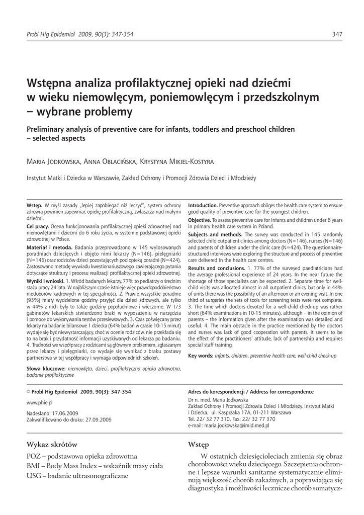 Jodkowska Probl Hig Epidemiol J i wsp. Wstępna 2009, 90(3): analiza 347-354 profilaktycznej opieki nad dziećmi w wieku niemowlęcym, poniemowlęcym ... 347 Wstępna analiza profilaktycznej opieki nad dziećmi w wieku niemowlęcym, poniemowlęcym i przedszkolnym – wybrane problemy Preliminary analysis of preventive care for infants, toddlers and preschool children – selected aspects Maria Jodkowska, Anna Oblacińska, Krystyna Mikiel-Kostyra Instytut Matki i Dziecka w Warszawie, Zakład Ochrony i Promocji Zdrowia Dzieci i Młodzieży Wstęp. W myśl zasady „lepiej zapobiegać niż leczyć”, system ochrony zdrowia powinien zapewniać opiekę profilaktyczną, zwłaszcza nad małymi dziećmi. Cel pracy. Ocena funkcjonowania profilaktycznej opieki zdrowotnej nad niemowlętami i dziećmi do 6 roku życia, w systemie podstawowej opieki zdrowotnej w Polsce. Materiał i metoda. Badania przeprowadzono w 145 wylosowanych poradniach dziecięcych i objęto nimi lekarzy (N=146), pielęgniarki (N=146) oraz rodziców dzieci pozostających pod opieką poradni (N=424). Zastosowano metodę wywiadu kwestionariuszowego, zawierającego pytania dotyczące struktury i procesu realizacji profilaktycznej opieki zdrowotnej. Wyniki i wnioski. 1. Wśród badanych lekarzy, 77% to pediatrzy o średnim stażu pracy 24 lata. W najbliższym czasie istnieje więc prawdopodobieństwo niedoborów kadrowych w tej specjalności, 2. Prawie wszystkie poradnie (93%) miały wydzielone godziny przyjęć dla dzieci zdrowych, ale tylko w 44% z nich były to także godziny popołudniowe i wieczorne. W 1/3 gabinetów lekarskich stwierdzono braki w wyposażeniu w narzędzia i pomoce do wykonywania testów przesiewowych. 3. Czas poświęcany przez lekarzy na badanie bilansowe 1 dziecka (64% badań w czasie 10-15 minut) wydaje się być niewystarczający, choć w ocenie rodziców, nie przekłada się to na brak i przydatność informacji uzyskiwanych od lekarza po badaniu. 4. Trudności we współpracy z rodzicami są głównym problemem, zgłaszanym przez lekarzy i pielęgniarki, co wydaje się wynikać z braku postawy partnerstwa w tej współpracy i wymaga odpowiednich szkoleń. Introduction. Preventive approach obliges the health care system to ensure good quality of preventive care for the youngest children. Objective. To assess preventive care for infants and children under 6 years in primary health care system in Poland. Subjects and methods. The survey was conducted in 145 randomly selected child outpatient clinics among doctors (N=146), nurses (N=146) and parents of children under the clinic care (N=424). The questionnairestructured interviews were exploring the structure and process of preventive care delivered in the health care centres. Results and conclusions. 1. 77% of the surveyed paediatricians had the average professional experience of 24 years. In the near future the shortage of those specialists can be expected. 2. Separate time for wellchild visits was allocated almost in all outpatient clinics, but only in 44% of units there was the possibility of an afternoon or an evening visit. In one third of surgeries the sets of tools for screening tests were not complete. 3. The time which doctors devoted for a well-child check-up was rather short (64% examinations in 10-15 minutes), although – in the opinion of parents – the information given after the examination was detailed and useful. 4. The main obstacle in the practice mentioned by the doctors and nurses was lack of good cooperation with parents. It seems to be the effect of the practitioners’ attitude, lack of partnership and requires special staff training. Key words: infants, children, preventive health care, well-child check-up Słowa kluczowe: niemowlęta, dzieci, profilaktyczna opieka zdrowotna, badanie profilaktyczne © Probl Hig Epidemiol 2009, 90(3): 347-354 www.phie.pl Nadesłano: 17.06.2009 Zakwalifikowano do druku: 27.09.2009 Adres do korespondencji / Address for correspondence Dr n. med. Maria Jodkowska Zakład Ochrony i Promocji Zdrowia Dzieci i Młodzieży, Instytut Matki i Dziecka, ul. Kasprzaka 17A, 01-211 Warszawa Tel. 22/ 32 77 310, Fax: 22/ 32 77 370 e-mail: [email protected] Wykaz skrótów Wstęp POZ – podstawowa opieka zdrowotna BMI – Body Mass Index – wskaźnik masy ciała USG – badanie ultrasonograficzne W ostatnich dziesięcioleciach zmienia się obraz chorobowości wieku dziecięcego. Szczepienia ochronne i lepsze warunki sanitarne systematycznie eliminują większość chorób zakaźnych, a poprawiająca się diagnostyka i możliwości lecznicze chorób somatycz- 348 nych stwarzają większe szanse na przeżycie. Poprawa opieki okołoporodowej i nad dziećmi urodzonymi przedwcześnie powoduje, że rośnie liczba przeżywających - ale zagrożonych różnego typu dysfunkcjami - dzieci urodzonych z małą, a nawet bardzo małą masą. Zwiększa się więc liczba dzieci przewlekle chorych, wymagających jak najwcześniejszego wykrywania zaburzeń. Zmieniający się kontekst ekonomiczny, społeczny i środowiskowy życia rodzinnego (narastające rozwarstwienie ekonomiczne społeczeństw i rosnące ubóstwo, a jednocześnie wzrost zatrudnienia i aspiracji zawodowych kobiet, rozwody, mała liczba dzieci w rodzinie, od najmłodszych lat żyjących w wirtualnym świecie mediów elektronicznych bez pozytywnych wzorców środowiskowych), skutkują wzrostem zaburzeń rozwojowych i problemów emocjonalnych u coraz młodszych dzieci [1-3]. Zjawiska te zwiększają znaczenie i rolę opieki profilaktycznej i wczesnej wykrywalności zaburzeń. W Polsce, poczynając od 1999 r., trwa reforma ochrony zdrowia. Zmiany ogranizacji, zarządzania i finansowania, a także odejście od systemu opieki pediatrycznej nad populacją w wieku rozwojowym, nie sprzyjają wprowadzaniu w życie idei „lepiej zapobiegać niż leczyć”. Wprawdzie sentencja ta nadal „żyje” w wielu środowiskach decyzyjnych, nie ma jednak przełożenia na język prakt