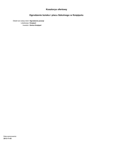 Kosztorys ofertowy Ogrodzenie boiska i placu Szkolnego w Księżpolu Obiekt lub rodzaj robót: Ogrodzenie posesji Lokalizacja: Księżpol Inwestor: Gmina Księżpol Data opracowania: 2013-11-03 Ogrodzenie boiska i placu Szkolnego w Księżpolu ZUZIA11 (C) Datacomp 1994-2013 (lic. 0004E76F) strona nr: 2 Przedmiar robót <-NR-> <-PODST-> Nr <-OPIS-> Podstawa Kosztorys <-JEDN-> Opis robót Element KNR 223/401/1 Piłkochwyty wys. do 4m z siatki ocynkowanej i słupków ocynkowanych 2 Element Ogrodzenie placu Szkolnego z paneli z prętów stalowych cynkowanych ogniowo grub. 5mm i wys, 2,3m ( z fundamentem betonowym systemowym) 2.1 2.2 KNR 201/312/10 Ręczne wykopanie dołów o powierzchni dna do 0.2˙m2, głębokość do 1.0 m, kategoria gruntu III KNR 202/1802/1 Osadzenie słupków do ogrodzeń panelowych o wym. 60x40mm wraz z akcesoriami o wys. 3m (analogia) Wyliczenie ilości robót: 51*3 153,000000 RAZEM: 153,000000 KNR Osadzenie przęseł panelowych z z prętów stalowych cynkowanych ogniowo grub. 5mm (analogia) 202/1805/11 Wyliczenie ilości robót: 127*2 254,000000 RAZEM: 254,000000 KNR 202/1808/1 Brama dwuskrzydłowa wykonana z rury fi 42mm cenkowanej ogniowo wypełniona siatką zgrzewaną fi 5mm szer. 5m i wys.2m kpl z akcesoriami(analogia) KNR 202/1808/4 Furtka z rury fi 42mm cynkowanej ogniowo wypełniona siatką zgrzewana wys.2m i szer. 1,2m kpl z akcesoriami (analogia) 2.4 2.5 Ilość Ogrodzenie boiska i placu Szkolnego w Księżpolu 1 1.1 2.3 <-ILOSC-> Jm Ogrodzenie kortów tenisowych z siatki na słupkach, stalowych o rozstawie 3˙m z rur stalowych wysokości 3˙m R= 0,955 M= 1,000 S= 1,000 m 50 szt 51 m 153,000 m2 254,000 kpl 1 kpl 2 Kosztorys ofertowy <-NR-> <-PODST-> Nr <-OPIS-> Podstawa <-JEDN-> Opis robót Kosztorys Ogrodzenie boiska i placu Szkolnego w Księżpolu 1 Element Piłkochwyty wys. do 4m z siatki ocynkowanej i słupków ocynkowanych 1.1 KNR 223/401/1 Ogrodzenie kortów tenisowych z siatki na słupkach, stalowych o rozstawie 3˙m z rur stalowych wysokości 3˙m R= 0,955 M= 1,000 S= 1,000 Robocizna Betoniarze grupa II Malarze grupa II Robotnicy grupa I Spawacze grupa II Materiały Acetylen techniczny - rozpuszczony Beton zwykły z kruszywa naturalnego B-15 (mieszanka betonowa) Lina stalowa jednozwita z drutu ocynkowanego T1x19 Fi˙5˙mm Rura stalowa bez szwu ocynkowana, 60,3 (Dn˙50) Siatka ogrodzeniowa z drutu ocynkowanego pleciona 50x50˙mm Fi˙2.8˙mm Słupki z rur stalowych Tlen techniczny sprężony Nakłady pomocnicze Materiały inne (Materiały) <-NORMA-> Jm <-CENA-> 50 r-g r-g r-g r-g 2,1533 0,26 1,3619 0,03 2,05640 0,24830 1,30061 0,02865 kg m3 kg kg 0,0015 0,02 0,31 0,28 0,00150 0,02000 0,31000 0,28000 m2 kg m3 3,057 23,97 0,0021 3,05700 23,97000 0,00210 % Element 2.1 KNR 201/312/10 Ręczne wykopanie dołów o powierzchni dna do 0.2˙m2, głębokość do szt 1.0 m, kategoria gruntu III Robocizna Robotnicy grupa I r-g KNR 202/1802/1 Osadzenie słupków do ogrodzeń panelowych o wym. 60x40mm wraz z m akcesoriami o wys. 3m (analogia) Wyliczenie ilości robót: 51*3 <-WARTOSC-> Ilość/ Cena jedn. Wartość Ilość jedn. jedn. m 2 2.2 <-ILOSC-> Norma 1 Ogrodzenie placu Szkolnego z paneli z prętów stalowych cynkowanych ogniowo grub. 5mm i wys, 2,3m ( z fundamentem betonowym systemowym) 51 0,98 0,98000 153,000 RAZEM: 153,000000 153,000 Ogrodzenie boiska i placu Szkolnego w Księżpolu Ogrodzenie boiska i placu Szkolnego w Księżpolu <-NR-> <-PODST-> Nr 2.3 2.4 2.5 ZUZIA11 (C) Datacomp 1994-2013 (lic. 0004E76F) strona nr: 3 <-OPIS-> Podstawa <-JEDN-> Opis robót Robocizna Betoniarze grupa II Malarze grupa II Robotnicy grupa I Spawacze grupa II Materiały Słupki z kształtowników 60x40mm Zaprawa cementowa M15 (m.100) Nakłady pomocnicze Materiały inne (Materiały) Sprzęt Środek transportowy (1) KNR Osadzenie przęseł panelowych z z prętów stalowych cynkowanych 202/1805/11 ogniowo grub. 5mm (analogia) Wyliczenie ilości robót: 127*2 Robocizna Malarze grupa II Murarze grupa II Robotnicy grupa I Spawacze grupa II Materiały przęsło panelowe 2,5 x 2m z prętów stalowych fi 5mm łącznik betonowy przelotowy do paneli ogrodzeniowych Płyta betonowa - podmurówkam systemowa do ogrodzenia z paneli Nakłady pomocnicze Materiały inne (Materiały) Sprzęt Spawarka elektryczna wirująca 300 A KNR 202/1808/1 Brama dwuskrzydłowa wykonana z rury fi 42mm cenkowanej ogniowo wypełniona siatką zgrzewaną fi 5mm - szer. 5m i wys.2m kpl z akcesoriami(analogia) Robocizna Malarze grupa II Monter urządzeń i konstrukcji metalowych II Robotnicy grupa I Materiały Brama dwuskrzydłowa z rury cynkowanej ogniowo fi 42, wypełniona siatką zgrzewaną kpl z zamknięciem Nakłady pomocnicze Materiały inne (Materiały) Sprzęt Środek transportowy (1) KNR 202/1808/4 Furtka z rury fi 42mm cynkowanej ogniowo wypełniona siatką zgrzewana wys.2m i szer. 1,2m kpl z akcesoriami (analogia) Robocizna Malarze grupa II Monter urządzeń i konstrukcji metalowych II Robotnicy grupa I Materiały Furtka z rury fi 42mm cynkowanej ogniowo o wys, 2m i szer. 1,2m kpl z akcesoriami Nakłady pomocnicze Materiały inne (Materiały) Sprzęt Środek transportowy (1) <-NORMA-> Jm <-ILOSC-> Norma <-CENA-> r-g r-g r-g r-g 0,2048 0,3026 0,4298 0,1911 0,20480 0,30260 0,42980 0,19110 mb m3 1 0,0008 1,00000 0,00080 % m-g 1,5 0,0015 m2 0,00150 254,000 RAZEM: 254,000000 254,000 r-g r-g r-g r-g 0,22 0,63 0,39 0,11 0,22000 0,63000 0,39000 0,11000 m2 szt szt 1 0,201 0,2 1,00000 0,20100 0,20000 % m-g 1,5 0,06 kpl 0,06000 1 r-g r-g r-g 7,32 11,59 12,09 7,32000 11,59000 12,09000 kpl 1 1,00000 % m-g 1,5 0,02 kpl 0,02000 2 r-g r-g r-g 3,52 5,83 6,1 3,52000 5,83000 6,10000 szt 1 1,00000 % m-g <-WARTOSC-> Ilość/ Cena jedn. Wartość Ilość jedn. jedn. 1,5 0,02 0,02000 Ogrodzenie boiska i placu Szkolnego w Księżpolu