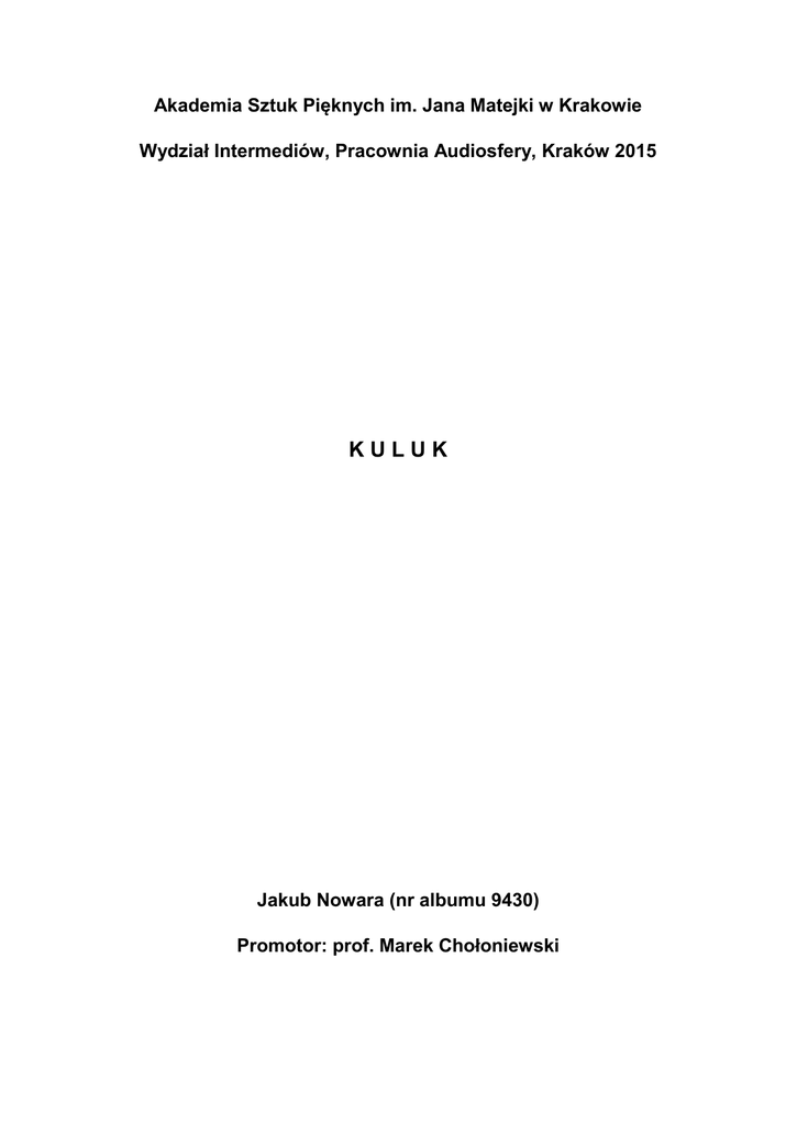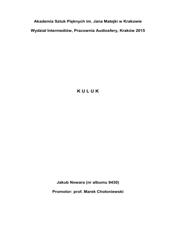 Akademia Sztuk Pięknych im. Jana Matejki w Krakowie Wydział Intermediów, Pracownia Audiosfery, Kraków 2015 KULUK Jakub Nowara (nr albumu 9430) Promotor: prof. Marek Chołoniewski Spis treści: K U L U K 2 K Külük, to słowo pochodzące z języka jakuckiego. Najpopularniejsze znaczenie na jakie można trafić, to "cień". Jakkolwiek jest to szersze pojęcie, definiowane równolegle jako "duch", "człowiek", "ziemia". Dla tubylca słowo to jest czymś więcej. Wszystkie elementy znaczeniowe przeplatają się ze sobą tworząc całościowy sens będący rzeczywistością "magiczną" i odnoszący się do rzeczywistości. Szaman syberyjski. "Człowiek" mający kontakt z "ziemią" i "duchem". Semantyka słowa Külük jest bardzo ciekawa, ponieważ jest ono symetryczne, czyli jest palindromem, a ma to bezpośredni związek ze znaczeniem. 3 U Na potrzeby projektu KULUK zaprojektowałem identyfikację wizualną: Obraz ten przedstawia słowo KULUK, którego zdublowanie (odbicie lustrzane) powoduje dodatkową symetrię znaku. Występują tu zatem cztery kierunki. Cztery kierunki odnoszą się do "ziemi", ale także do "przestrzeni" jako takiej, nie tylko fizycznej, a więc kosmologicznej. Znak skonstruowany jest z prostych linii. Estetyka ta odnosi się do pierwotnej formy ekspresji. W swojej strategii artystycznej odwołuję się, między innymi, do szamanizmu syberyjskiego, który jest prawdopodobnie ostatnią na ziemi enklawą pierwotnej duchowości nieskażonej cywilizacją zachodnią, a co za tym idzie, komercją i postępem naukowym / technologicznym. Dominacja myślenia racjonalnego i uzasadniania, również w obrębie działań artystycznych oraz kultury współczesnej, spowodowała wykluczenie innych dróg poznawczych, stając sie paradygmatem, który w moim rozumieniu jest językiem-mechanizmem kontroli. 4 L KULUK, to nazwa "działania", które rozpocząłem w czasie toku studiów na Wydziale Intermediów, ale poza systemem edukacyjnym. KULUK jest działaniem długofalowym i tymczasowym. KULUK nie jest osobą. KULUKIEM nazywam wszystkie dotychczasowe elementy istniejące w tym zbiorze, a także te, które zaistnieją w tym zbiorze w przyszłości. KULUK: - intencja - słowo / nazwa - identyfikacja wizualna - dźwięk - akcyjność - rzeźba audio / instalacja audio W skrócie nazywam to działanie "audio performansem" 5 U W swojej pracy opieram się głównie na medium dźwięku. Moje zainteresowania oscylują wokół wpływu częstotliwości na świadomość. W tym celu posługuję się niskimi falami dźwiękowymi, które mają długie wybrzmiewanie - drone, szumami, wysokimi częstotliwościami, nieprzyjemnymi dla ucha, sprzężeniami zwrotnymi oraz pętlami czasowymi (z ang. loop). Niskie częstotliwości są poszukiwaniem dźwięków zbliżonych do śpiewu gardłowego. Wykorzystuję efekty typu distortion, reverb oraz delay. Do tej pory używałem nisko kasetowego kontaktowych, (jako nastrojonej gitary instrument - metalowej blachy. elektrycznej, autorska magnetofonu metoda), Poszukiwania mikrofonów nowej doprowadziły mnie do wytworzenia czegoś na kształt formy mandali. Choć trafniejsze wydaje się porównianie do kalaczakry. Kalaczakra dosłownie oznacza "koło czasu" i jest ważnym rytuałem w tradycji buddyzmu tybetańskiego. Poniżej zamieszczam szkice, które wizualizują formę pracy dyplomowej. Na czterech kierunkach świata umieszczona są źródła dźwięku. W środku na zewnętrznym kręgu znajduje się mega pętla wykonana z taśmy i magnetofonu szpulowego, który służy jako looper. Dwa środkowe kręgi to pętle także wykonane z taśmy i magnetofonu szpulowego, ale zawierające nagrania. 6 K 7 8 Bibliografia: - Umysł poza śmiercią, Dzogczen Ponlop Rinpocze, Kraków 2009 - Tybetańska Księga Umarłych, tłum. Ireneusz Kania, Kraków 2007 - Kultura dźwięku. Teksty o muzyce nowoczesnej, red. Christoph Cox, Daniel Warner, Warszawa 2010 9