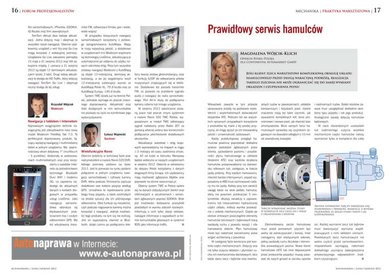 16 | FORUM PROFESJONALISTÓW Nawigacja z tabletem i Internetem Najnowszym osiągnięciem techniki na wigacyjnej jest zdecydowanie nasz nowy model Modecom FreeWay Tab 7.0. To perfekcyjnie dopracowany produkt, łą czący wydajną nawigację i multimedialny tablet w jednym urządzeniu. Ma pojem nościowy ekran dotykowy 7” (multitouch – 5 punktów), doskonały w zastosowa niach multimedialnych oraz przy korzy staniu z zasobów Inter netu za pośrednictwem technologii Bluetooth Dun/ WiFi i modemu 3G, co zapewnia np. dostęp do aktualnych danych o korkach dro gowych w przypadku usługi LiveDrive. Jako nawigacja samocho dowa odznacza się błyskawicznym prze liczaniem tras i czułym odbiornikiem GPS. Ma też wbudowany trans Łukasz Majewski Goclever Wielofunkcyjne Navio Obecnie jesteśmy w końcowej fazie prac nad produktem o nazwie Navio 520 DVR, którego premierę ustalono na lipiec 2012. Jest to pierwsze na rynku polskim połączenie w jednym urządzeniu nawi gacji samochodowej i cyfrowej kamery DVR, która podczas filmowania zapisuje dodatkowo swe kolejne pozycje według GPS. Umożliwia to rejestrowanie prze biegu trasy pojazdu, a także zaistniałych na drodze sytuacji dla ich późniejszego odtworzenia. Obie funkcje są niezależne, czyli podczas nagrywania kamerą można korzystać z nawigacji. Jednak możliwo ści tego produktu na tym się nie kończą. Jest on wyposażony również w Blue tooth, dzięki czemu po podłączeniu tele Autonaprawa w Internecie: Magdalena Wójcik-Klich Opiekun Rynku Polska dla Continental Aftermarket GmbH Jeśli klient zleca warsztatowi kompleksową obsługę układu hamulcowego przed długą wakacyjną podróżą, realizacja takiego zlecenia nie może ograniczać się do samej wymiany okładzin i uzupełnienia płynu fonu tworzy zestaw głośnomówiący, oraz w funkcję A2DP do odtwarzania plików muzycznych znajdujących się w telefo nie. Dodatkowo też posiada transmiter FM, co pozwala na przesłanie sygnału audio z nawigacji do radia samochodo wego. Port AV-in służy do podłączenia kamery cofania lub innego urządzenia. W sierpniu 2012 zakończone zosta ną prace nad jeszcze innym systemem o nazwie Navio 505 TMC Polska, wy posażonym w moduł TMC odbierający sygnał nadawany przez Radio ZET za pomocą własnej anteny bez konieczności podłączania jakichkolwiek dodatkowych akcesoriów. Aktualizacje autostrad i dróg krajo wych wprowadzamy na mapach w ciągu 1-3 miesięcy od czasu zaistnienia zmian, np. A2 od Łodzi w kierunku Warszawy będzie widoczna w naszych urządzeniach w sierpniu 2012. Obecnie w odniesieniu do obszaru Polski korzystamy z danych drogowych firmy Emapa. Ich użytkownicy mają możliwość zgłaszania błędów oraz poprawek na stronie www.emapi.pl. Obecny system TMC w Polsce opiera się na danych statystycznych (korki) oraz informacjach o utrudnieniach i remon tach zgłaszanych poprzez GDDKiA. Brak jest możliwości dodawania przeszkód powstałych w wyniku zdarzeń losowych. Informują o nich tylko stacje radiowe, nadające informacje o wypadkach w for mie komunikatów głosowych w systemie RDS jako informacje traffic. n www.e-autonaprawa.pl Autonaprawa | Lipiec/sierpień 2012 17 Prawidłowy serwis hamulców Fot. Continental Teves Krzysztof Wójciak Modecom miter FM, odtwarzacz filmów, gier i wiele, wiele więcej! W przypadku klasycznych nawigacji samochodowych korzystamy z polskie go oprogramowania AutoMapa. Mapy te mają najwyższą jakość, a dodatkowo w urządzeniach linii Modecom wspierane są technologią LiveDrive, aktualizującą je automatycznie po oddaniu do użytku no wych odcinków dróg. Poza tym wszystkie zestawy nawigacji Modecom z AutoMapą są objęte 12-miesięczną, darmową ak tualizacją, a po jej wygaśnięciu koszt 12-miesięcznej subskrypcji wynosi za AutoMapę Polski XL: 79 zł brutto oraz za AutoMapę Europy: 149 zł brutto. System TMC działa już na terenie Pol ski, jednakże wymaga on jeszcze znacz nego dopracowania. Aktualność oraz ilość dostępnych w nim komunikatów nie pozwala na razie na komfortowe jego wykorzystywanie. Fot. Goclever, Modecom flot samochodowych, iPhonów, GDDKiA, IQ Routes oraz firm zewnętrznych. TomTom oferuje dwa rodzaje aktuali zacji. Jedna dotyczy map i obejmuje to wszystkie nasze nawigacje. Obecnie użyt kownicy urządzeń z serii Via oraz Go Live mogą korzystać z wakacyjnej promocji. Urządzenia Go Live zakupione pomiędzy 15 maja a 31 sierpnia 2012 oraz VIA za kupione między 1 czerwca a 31 sierpnia 2012 są objęte 12 darmowymi aktualiza cjami (przez 3 lata). Drugi rodzaj aktuali zacji to dostęp do HD Traffic, który dotyczy nawigacji TomTom Go Live i obejmuje roczny dostęp do tej usługi. MECHANIKA | PRAKTYKA WARSZTATOWA | Wskazówki zawarte w tym artykule opracowane zostały na podstawie wielo letnich i wszechstronnych doświadczeń ekspertów ATE. Polecam też we wszyst kich opisanych przypadkach korzystanie z produktów tej marki z tej prostej przy czyny, że mogę ręczyć za ich niezawodną jakość i uniwersalność zastosowań. Każdy przedurlopowy przegląd ha mulców powinna poprzedzać dokładna analiza zastrzeżeń zgłaszanych przez klienta, sprawdzenie poziomu i przydat ności płynu hamulcowego w układzie (testerem ATE) oraz kontrola działania hamulców przeprowadzona na stanowi sku rolkowym lub, zastępczo, w trakcie jazdy próbnej. Przy każdym hamowaniu, również bardzo intensywnym, pojazd wy posażony w ABS musi zachowywać nada ny mu tor jazdy. Należy przy tym zwrócić uwagę także na skok pedału hamulca, który nie powinien przekraczać 5 cen tymetrów: dłuższy świadczy o zapowie trzeniu lub nieszczelności hydraulicznej części układu, krótszy wynika przeważ nie z usterek mechanicznych. Często po okresie zimowym poszczególne elementy hamulców tarczowych i bębnowych tracą swobodę ruchu z powodu korozji i siła hamowania słabnie. Płyn hamulcowy może być natomiast rozcieńczony przez wilgoć wchłanianą z powi