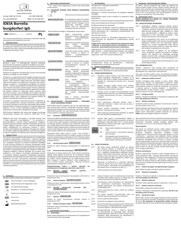 5. ODCZYNNIK DOSTARCZONY 96 - Każdy zestaw diagnostyczny zawiera dość odczynników na 96 oznaczeń. 5.1. ZAWARTOŚĆ ZESTAWU IDEIA BORRELIA BURGDORFERI, IgG TEST Key Code TSMX7841 www.oxoid.com/ifu Europe +800 135 79 135 CA 1 855 805 8539 Jedna broszura instrukcji stosowania US 1 855 2360 190 ROW +31 20 794 7071 K602911-2..........................96 Tests PL 100mL rozcieńczalnika próbek buforowany roztwór z detergentem, środkiem przeciwbakteryjnym, zabarwiony na czerwono 1. P RZEZNACZENIE Test IDEIA™ Borrelia burgdorferi IgG to test immunoenzymatyczny do wykrywania ludzkich przeciwciał klasy IgG przeciwko Borrelia burgdorferi sensu lato. Zestaw jest przewidziany jako pomocniczy w diagnostyce boreliozy z Lyme. 50mL koncentratu buforu płuczącego (x25): roztwór buforowany trisem, zawierający środek przeciwbakteryjny i detergent 2. STRESZCZENIE Borelioza z Lyme to wieloorganowe zakażenie wywołane, przenoszonym przez kleszcze, krętkiem B. burgdorferi sensu lato1,2. Borelioza jest najczęstszym zakażeniem przenoszonym wektorowo w Europie i Ameryce Północnej. Chorobę rozpoznawano w Rosji, Chinach i Japonii. 1,5mL IgG kontrola dodatnia ludzka surowica w buforze ze środkiem przeciwbakteyjnym, barwiona na ciemnozielono. W związku ze szczególnie nikłą liczbą komórek B. burgdorferi w zmianach patologicznych i płynach ustrojowych, próby hodowli ani ostatnio stosowane techniki PCR, wykrywające bezpośrednio krętkowy DNA nie okazały się przydatne w rutynowej diagnostyce boreliozy z Lyme. A zatem najbardziej przydatną metodą jest nadal pomiar swoistych dla B. Burgdorferi przeciwciał. IDEIA Borrelia burgdorferi IgG używa jako antygenu testowego oczyszczonego, natywnej wici szczepu B. afzelii DK1. Ta wić (flagellum) jest silnie immunogenna i wyzwala wczesną, silną i trwałą odpowiedź immunologiczną4,5. W porównaniu z konwencjonalnym i obecnie szeroko stosowanym antygenem testowym, jakim jest ekstrakt z całych komórek krętka, oczyszczony antygen flagellum poprawia czułość i swoistość diagnostyczną testów serologicznych do wykrywania boreliozy z Lyme6,7. Ponadto użycie flagellum jako antygenu testowego jest właściwe we wszystkich regionach geograficznych, ponieważ poszczególne szczepy B. burgdorferi nie wykazują różnic dotyczących flagellum. 3. Z ASADA TESTU Test IDEIA Borrelia burgdorferi IgG wykonuje się w studzienkach mikropłytki opłaszczonych oczyszczonym, natywnym flagellum Borrelia. Przeciwciała obecne w próbkach surowicy ludzkiej wiążą się z antygenem obecnym na ścianach studzienek mikropłytki w czasie pierwszej inkubacji. Po usunięciu niezwiązanych białek surowicy przez wypłukanie, do studzienek dodaje się znakowanego peroksydazą przeciwciała przeciwko ludzkiej IgG. Koniugat wiąże się swoiście z przeciwciałami klasy IgG, związanymi uprzednio z antygenem flagellum. Nadmiar koniugatu jest usuwany przez wypłukanie, a po dodaniu chromogenu peroksydaza zawarta w koniugacie katalizuje powstanie niebieskiego zabarwienia. Reakcję zatrzymuje się dodatkiem kwasu, który zmienia niebieskie zabarwienie na żółte. Intensywność zabarwienia odpowiada stężeniu w próbce swoistych przeciwciał przeciwko B. Burgdorferi. Intensywność tę mierzy się spektrofotometrycznie przy długości fali 450nm, a wartość absorbcji prób badanych jest porównywana z absorbancją kontroli. Standardowe składniki zestawów (Sample Diluent, Wash Buffer Concentrate, Substrate and Stop Solution), i podobna procedura wykonania dotyczą też testów IDEIA Borrelia burgdorferi, IgM ( K603011-2) i IDEIA Lyme Neuroborreliosis ( K602811-2). Można zatem wykonywać te testy równolegle, korzystając z tego samego rozcieńczenia surowicy badanej. 10.1.2 Ocena wiarygodności testu opiera się na podwójnym badaniu każdej próbki. Jeżeli zamierza się badać próbki pojedyńczo, zalecane jest, aby wykonujący badanie zapoznał się z opisem wiarygodności testu. Różnice pomiędzy oznaczeniami (CV%) są o około 50% wyższe, jeśli są oparte na pojedynczym oznaczeniu. 10.1.3 Jeżeli wytrząsarka na 500rpm nie jest dostępna, można zredukować szybkość wytrząsania do 300rpm podczas obu inkubacji, bez wyraźnego ujemnego wpływu na wyniki testu, a dostępny jest także protokół statyczny (bez wytrząsania). Proszę skontaktować się z 8. ŚRODKI OSTROŻNOŚCI - Do diagnostyki in vitro. Osoba wykonująca test musi być przeszkolona i doświadczona w pracy laboratoryjnej 8.1. ŚRODKI BEZPIECZEŃSTWA 8.1.1 Zestaw IDEIA Borrelia burgdorferi IgG jest tak zaprojektowany, aby można go było używać w maksymalnie dziesięciu etapach, podczas trzech miesięcy w okresie ważności. Istotne dla uzyskania optymalnych wyników jest, aby przechowywać niezużyte części zestawu zgodnie z poniższym zaleceniem: Nieużywane paski należy usunąć z ramki i zaraz umieścić z powrotem w zamykanej torebce ze środkiem suszącym, starannie zamknąć i przechowywać w temperaturze 2-8°C. Można je zużyć w ciągu 12 tygodni po pierwszym otwarciu, jeśli są przechowywane w podany sposób. Rozcieńczalnik próbek - Gotowy do użycia. Niezużyty przechowywać w temperaturze 2-8°C. Roztwór hamujący reakcję zawiera kwas siarkowy (0,46mol/L). Unikać kontaktu z oczyma i skórą przez noszenie ochronnej odzieży i okularów. 8.1.3 Nie jeść, nie pić, nie palić, nie przechowywać ani nie przygotowywać żywności, ani nie stosować kosmetyków w miejscu przeznaczonym do pracy z odczynnikami i próbkami. 8.1.4 Nie pipetować ustami. 8.1.5 Nosić jednorazowe rękawiczki podczas pracy z materiałem klinicznym i zawsze myć ręce po pracy z materiałem zakaźnym. 8.1.6 Usuwać wszelkie pozostałości próbek klinicznych zgodnie z miejscowymi przepisami. 8.1.7 Arkusz dotyczący bezpieczeństwa dostępny na żądanie dla osób zawodowo przygotowanych. 8.1.8 Substrat TMB zawiera 1-metylopirolidon (NMP) w stężeniu >5% i <10%, klasyfikowany zgodnie z odnośny