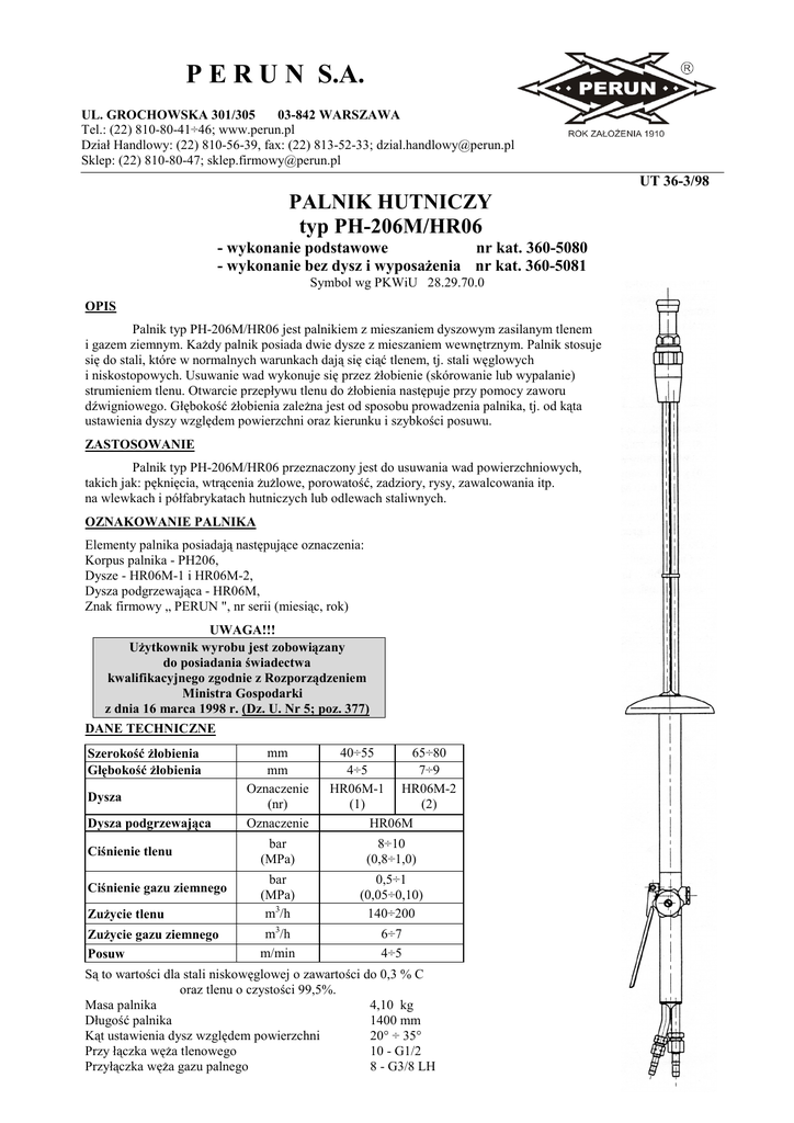P E R U N S.A. UL. GROCHOWSKA 301/305 03-842 WARSZAWA Tel.: (22) 810-80-41÷46; www.perun.pl Dział Handlowy: (22) 810-56-39, fax: (22) 813-52-33; [email protected] Sklep: (22) 810-80-47; [email protected] UT 36-3/98 PALNIK HUTNICZY typ PH-206M/HR06 - wykonanie podstawowe nr kat. 360-5080 - wykonanie bez dysz i wyposażenia nr kat. 360-5081 Symbol wg PKWiU 28.29.70.0 OPIS Palnik typ PH-206M/HR06 jest palnikiem z mieszaniem dyszowym zasilanym tlenem i gazem ziemnym. Każdy palnik posiada dwie dysze z mieszaniem wewnętrznym. Palnik stosuje się do stali, które w normalnych warunkach dają się ciąć tlenem, tj. stali węglowych i niskostopowych. Usuwanie wad wykonuje się przez żłobienie (skórowanie lub wypalanie) strumieniem tlenu. Otwarcie przepływu tlenu do żłobienia następuje przy pomocy zaworu dźwigniowego. Głębokość żłobienia zależna jest od sposobu prowadzenia palnika, tj. od kąta ustawienia dyszy względem powierzchni oraz kierunku i szybkości posuwu. ZASTOSOWANIE Palnik typ PH-206M/HR06 przeznaczony jest do usuwania wad powierzchniowych, takich jak: pęknięcia, wtrącenia żużlowe, porowatość, zadziory, rysy, zawalcowania itp. na wlewkach i półfabrykatach hutniczych lub odlewach staliwnych. OZNAKOWANIE PALNIKA Elementy palnika posiadają następujące oznaczenia: Korpus palnika - PH206, Dysze - HR06M-1 i HR06M-2, Dysza podgrzewająca - HR06M, Znak firmowy „ PERUN ", nr serii (miesiąc, rok) UWAGA!!! Użytkownik wyrobu jest zobowiązany do posiadania świadectwa kwalifikacyjnego zgodnie z Rozporządzeniem Ministra Gospodarki z dnia 16 marca 1998 r. (Dz. U. Nr 5; poz. 377) DANE TECHNICZNE mm mm Oznaczenie (nr) Oznaczenie 40÷55 65÷80 4÷5 7÷9 HR06M-1 HR06M-2 (1) (2) HR06M bar (MPa) 8÷10 (0,8÷1,0) Zużycie tlenu bar (MPa) m3/h 0,5÷1 (0,05÷0,10) 140÷200 Zużycie gazu ziemnego Posuw m3/h m/min 6÷7 4÷5 Szerokość żłobienia Głębokość żłobienia Dysza Dysza podgrzewająca Ciśnienie tlenu Ciśnienie gazu ziemnego Są to wartości dla stali niskowęglowej o zawartości do 0,3 % C oraz tlenu o czystości 99,5%. Masa palnika 4,10 kg Długość palnika 1400 mm Kąt ustawienia dysz względem powierzchni 20° ÷ 35° Przy łączka węża tlenowego 10 - G1/2 Przyłączka węża gazu palnego 8 - G3/8 LH 2 UT 36-3/98 SKŁAD KOMPLETU W skład kompletu palnika PH-206M/HR06 wchodzi (wg nr kat.): - Palnik bez dysz i wyposażenia - Dysza HR06M-1 - Dysza HR06M-2 - Dysza podgrzewająca z ostrogą HR06M - Uszczelki zapasowe - Opakowanie: torba foliowa Poz. 1. 2. 3. 4. 5. Elementy palnika Palnik bez dysz i wyposażenia Dysza HR06M-1 Dysza HR06M-2 Dysza podgrzewająca z ostrogą HR06M Uszczelki zapasowe 360-5080 1 szt. 1 szt. 1 szt. 1 szt. 1 kpl. 1szt. 360-5081 1 szt. 1 szt. Nr kat. 360-5081 050-8800 050-8900 050-8700 100-2180 INFORMACJE DODATKOWE 1. a) Stanowisko do żłobienia palnikiem typ PH-206M/HR06 wymaga zasilania : tlenem z sieci zakładowej lub baterii składającej się co najmniej z 10 butli, wyposażonej w centralny reduktor do tlenu ( np. typ RCT-30S produkcji PERUN S.A.); b) gazem ziemnym z butli lub sieci zakładowej przy zapewnieniu ciśnienia 0,5÷1,0 bar (0,05÷0,10 MPa), przy czym, przy poborze gazu ziemnego z butli wymagany jest centralny reduktor dwustopniowy typ 2RCM-1,5 produkcji PERUN S.A. (na zamówienie specjalne), a na wylocie instalacji gazu ziemnego należy stosować bezpiecznik suchy typ BS-1 produkcji ZDIS GLIWICE; 2. Do kompletu palnika załączane są "Przepisy obsługi palników z mieszaniem dyszowym" wg nr 3D-6/98. 3. Wyrób objęty jest gwarancją w okresie 12 miesięcy od daty sprzedaży (z wyjątkiem dysz i dyszy podgrzewającej), jednak nie dłużej niż 18 miesięcy od daty produkcji.