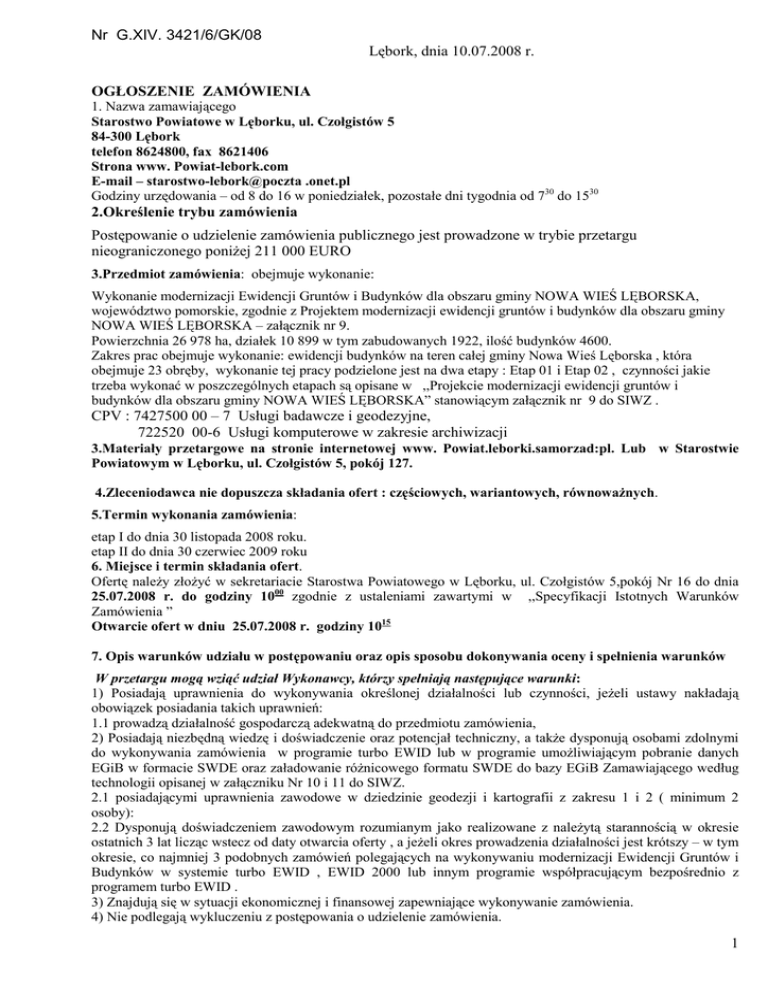 Nr G.XIV. 3421/6/GK/08 Lębork, dnia 10.07.2008 r. OGŁOSZENIE ZAMÓWIENIA 1. Nazwa zamawiającego Starostwo Powiatowe w Lęborku, ul. Czołgistów 5 84-300 Lębork telefon 8624800, fax 8621406 Strona www. Powiat-lebork.com E-mail – starostwo-lebork@poczta .onet.pl Godziny urzędowania – od 8 do 16 w poniedziałek, pozostałe dni tygodnia od 730 do 1530 2.Określenie trybu zamówienia Postępowanie o udzielenie zamówienia publicznego jest prowadzone w trybie przetargu nieograniczonego poniŜej 211 000 EURO 3.Przedmiot zamówienia: obejmuje wykonanie: Wykonanie modernizacji Ewidencji Gruntów i Budynków dla obszaru gminy NOWA WIEŚ LĘBORSKA, województwo pomorskie, zgodnie z Projektem modernizacji ewidencji gruntów i budynków dla obszaru gminy NOWA WIEŚ LĘBORSKA – załącznik nr 9. Powierzchnia 26 978 ha, działek 10 899 w tym zabudowanych 1922, ilość budynków 4600. Zakres prac obejmuje wykonanie: ewidencji budynków na teren całej gminy Nowa Wieś Lęborska , która obejmuje 23 obręby, wykonanie tej pracy podzielone jest na dwa etapy : Etap 01 i Etap 02 , czynności jakie trzeba wykonać w poszczególnych etapach są opisane w ,,Projekcie modernizacji ewidencji gruntów i budynków dla obszaru gminy NOWA WIEŚ LĘBORSKA” stanowiącym załącznik nr 9 do SIWZ . CPV : 7427500 00 – 7 Usługi badawcze i geodezyjne, 722520 00-6 Usługi komputerowe w zakresie archiwizacji 3.Materiały przetargowe na stronie internetowej www. Powiat.leborki.samorzad:pl. Lub w Starostwie Powiatowym w Lęborku, ul. Czołgistów 5, pokój 127. 4.Zleceniodawca nie dopuszcza składania ofert : częściowych, wariantowych, równowaŜnych. 5.Termin wykonania zamówienia: etap I do dnia 30 listopada 2008 roku. etap II do dnia 30 czerwiec 2009 roku 6. Miejsce i termin składania ofert. Ofertę naleŜy złoŜyć w sekretariacie Starostwa Powiatowego w Lęborku, ul. Czołgistów 5,pokój Nr 16 do dnia 25.07.2008 r. do godziny 1000 zgodnie z ustaleniami zawartymi w ,,Specyfikacji Istotnych Warunków Zamówienia ” Otwarcie ofert w dniu 25.07.2008 r. godziny 1015 7. Opis warunków udziału w postępowaniu oraz opis sposobu dokonywania oceny i spełnienia warunków W przetargu mogą wziąć udział Wykonawcy, którzy spełniają następujące warunki: 1) Posiadają uprawnienia do wykonywania określonej działalności lub czynności, jeŜeli ustawy nakładają obowiązek posiadania takich uprawnień: 1.1 prowadzą działalność gospodarczą adekwatną do przedmiotu zamówienia, 2) Posiadają niezbędną wiedzę i doświadczenie oraz potencjał techniczny, a takŜe dysponują osobami zdolnymi do wykonywania zamówienia w programie turbo EWID lub w programie umoŜliwiającym pobranie danych EGiB w formacie SWDE oraz załadowanie róŜnicowego formatu SWDE do bazy EGiB Zamawiającego według technologii opisanej w załączniku Nr 10 i 11 do SIWZ. 2.1 posiadającymi uprawnienia zawodowe w dziedzinie geodezji i kartografii z zakresu 1 i 2 ( minimum 2 osoby): 2.2 Dysponują doświadczeniem zawodowym rozumianym jako realizowane z naleŜytą starannością w okresie ostatnich 3 lat licząc wstecz od daty otwarcia oferty , a jeŜeli okres prowadzenia działalności jest krótszy – w tym okresie, co najmniej 3 podobnych zamówień polegających na wykonywaniu modernizacji Ewidencji Gruntów i Budynków w systemie turbo EWID , EWID 2000 lub innym programie współpracującym bezpośrednio z programem turbo EWID . 3) Znajdują się w sytuacji ekonomicznej i finansowej zapewniające wykonywanie zamówienia. 4) Nie podlegają wykluczeniu z postępowania o udzielenie zamówienia. 1 b/ KaŜdy uczestnik wspólnej oferty musi spełniać warunek określony w pkt 1a/ pakt 1.1 i pakt 4 SWIZ. Przy ocenie spełnienia pozostałych warunków zamawiający weźmie pod uwagę łączny potencjał podmiotów. c/ Ocena spełnienia warunków wymaganych od wykonawców zostanie dokonana wg formy „spełnia – nie spełnia”. Uwaga: Zamawiający wykluczy z postępowania Wykonawcę, który nie spełnia wymaganych warunków oraz jeŜeli stwierdzi, Ŝe dostarczone przez niego informacje istotne dla prowadzonego postępowania są nieprawdziwe. 8. Dokumenty wymagane od wykonawcy na potwierdzenie spełniania warunków: 1) Oświadczenie o spełnieniu warunków art. 22 ust. 1 ustawy PZP i nie podleganiu wykluczeniu na podstawie art. 24 ust. 1 i 2 ustawy PZP – zał. Nr 2. W przypadku wspólnego ubiegania się dwóch lub więcej wykonawców publicznego udzielenie zamówienia publicznego, wyŜej wymieniony dokument musi być złoŜony przez kaŜdego Wykonawcę. 2) Aktualny opis z właściwego rejestru albo aktualne zaświadczenie o wpisie do ewidencji działalności gospodarczej, wystawione nie wcześniej niŜ 6 miesięcy przed upływem terminu składania ofert, przedstawiające aktualny stan faktyczny i prawny. W przypadku wspólnego ubiegania się dwóch lub więcej Wykonawców o udzielenie zamówienia publicznego, wyŜej wymieniony dokument musi być złoŜony przez kaŜdego wykonawcę. 3) Wykaz zawierający, co najmniej 3 prace realizowane przez wykonawcę z naleŜytą starannością w okresie ostatnich 3 lat (licząc wstecz od daty składania ofert), a jeśli okres prowadzenia działalności jest krótszy – w tym okresie, polegających na wykonywaniu modernizacji Ewidencji Gruntów i Budynków w systemie turbo EWID , EWID 2000 lub innym programie współpracującym bezpośrednio z programem turbo EWID + referencje - zał. nr 4. W przypadku wspólnego ubiegania się dwóch lub więcej Wykonawców o udzielenia zamówienia publicznego, wyŜej wymieniony dokument musi być złoŜony przez tego wykonawcę, który dysponuje w/w osobami i podmiotami. 4) Wykaz osób i podmiotów, które będ ą uczestniczyć w wykonaniu zamówienia, wraz z informacjami na temat ich kwalifikacji niezbędnych do wykonania zamówienia, a takŜe zakresu wykonywanych przez nich czynności zał. Nr 5. W przypadku wspólnego ubiegania się dwóch lub więcej Wykon
