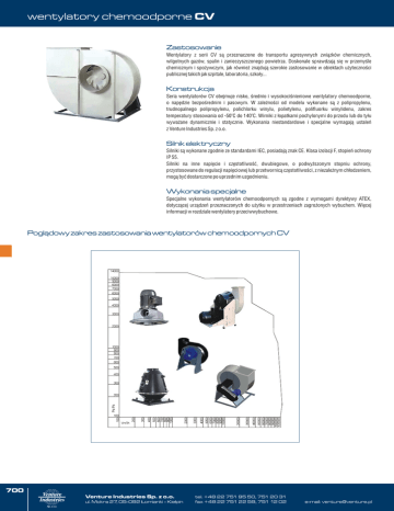 wentylatory chemoodporne CV Zastosowanie Wentylatory z serii CV s¹ przeznaczone do transportu agresywnych zwi¹zków chemicznych, wilgotnych gazów, spalin i zanieczyszczonego powietrza. Doskonale sprawdzaj¹ siê w przemyœle chemicznym i spo¿ywczym, jak równie¿ znajduj¹ szerokie zastosowanie w obiektach u¿ytecznoœci publicznej takich jak szpitale, laboratoria, szko³y... Konstrukcja Seria wentylatorów CV obejmuje nisko, œrednio i wysokociœnieniowe wentylatory chemoodporne, o napêdzie bezpoœrednim i pasowym. W zale¿noœci od modelu wykonane s¹ z polipropylenu, trudnopalnego polipropylenu, polichlorku winylu, polietylenu, polifluorku winylidenu, zakres temperatury stosowania od -50oC do 140oC. Wirniki z ³opatkami pochylonymi do przodu lub do ty³u wywa¿ane dynamicznie i statycznie. Wykonania niestandardowe i specjalne wymagaj¹ ustaleñ z Venture Industries Sp. z o.o. Silnik elektryczny Silniki s¹ wykonane zgodnie ze standardami IEC, posiadaj¹ znak CE. Klasa izolacji F, stopieñ ochrony IP 55. Silniki na inne napiêcie i czêstotliwoœæ, dwubiegowe, o podwy¿szonym stopniu ochrony, przystosowane do regulacji napiêciowej lub przetwornic¹ czêstotliwoœci, z niezale¿nym ch³odzeniem, mog¹ byæ dostarczone po uprzednim uzgodnieniu. Wykonania specjalne Specjalne wykonania wentylatorów chemoodpornych s¹ zgodne z wymogami dyrektywy ATEX, dotycz¹cej urz¹dzeñ przeznaczonych do u¿ytku w przestrzeniach zagro¿onych wybuchem. Wiêcej informacji w rozdziale wentylatory przeciwwybuchowe. Pogl¹dowy zakres zastosowania wentylatorów chemoodpornych CV 700 Venture Industries Sp. z o.o. ul. Mokra 27, 05-092 £omianki - Kie³pin tel. +48 22 751 95 50, 751 20 31 fax +48 22 751 22 59, 751 12 02 e-mail: [email protected]