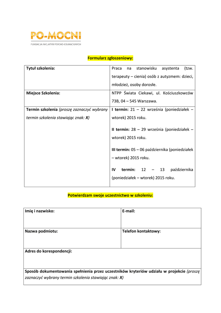 Formularz zgłoszeniowy: Tytuł szkolenia: Praca na stanowisku asystenta (tzw. terapeuty – cienia) osób z autyzmem: dzieci, młodzież, osoby dorosłe. Miejsce Szkolenia: NTPP Świata Ciekawi, ul. Kościuszkowców 73B, 04 – 545 Warszawa. Termin szkolenia (proszę zaznaczyć wybrany I termin: 21 – 22 września (poniedziałek – termin szkolenia stawiając znak: X) wtorek) 2015 roku. II termin: 28 – 29 września (poniedziałek – wtorek) 2015 roku. III termin: 05 – 06 października (poniedziałek – wtorek) 2015 roku. IV termin: 12 – 13 października (poniedziałek – wtorek) 2015 roku. Potwierdzam swoje uczestnictwo w szkoleniu: Imię i nazwisko: E-mail: Nazwa podmiotu: Telefon kontaktowy: Adres do korespondencji: Sposób dokumentowania spełnienia przez uczestników kryteriów udziału w projekcie (proszę zaznaczyć wybrany termin szkolenia stawiając znak: X) Studenci uczelni wyższych (zaświadczenia z uczelni potwierdzające status studenta): Specjaliści & pracownicy etatowi, w tym pracownicy NGO’s (zaświadczenia od pracodawcy potwierdzające zatrudnienie w danej placówce/organizacji, etc): Wolontariusze NGO’s (umowy wolontariackie): Rodzice, rodzina, opiekunowie (zaświadczenie o niepełnosprawności dziecka/członka rodziny): Wszystkie ww. dokumenty muszą zostać dostarczone (w formie skanu) na adres e-mailowy organizatora w terminie: max. 7 dni przed planowaną datą szkolenia! Jak ocenia Pan/Pani swoją wiedzę z proponowanego zakresu szkolenia? (proszę wstawić X w odpowiednią kratkę): Podstawowy Średni (krótki opis): Zaawansowany (krótki opis): Czy ma Pan/Pani doświadczenie w pracy z osobami z zaburzeniami ze spektrum autyzmu? TAK NIE Wysyłając formularz zgłoszenia kandydat/kandydatka zobowiązuje się do pełnego uczestnictwa w szkoleniu w pełnym wymiarze godzin w terminie wskazanym w wykazie szkoleń. W przypadku braku powiadomienia o rezygnacji z potwierdzonego udziału, organizator zastrzega sobie prawo obciążenia instytucji delegującej kosztami organizacji szkolenia i materiałów szkoleniowych. Prosimy o przesłanie swojego zgłoszenia na adres e-mail: [email protected] Administratorem zebranych danych osobowych jest Minister Infrastruktury i Rozwoju z siedzibą w Warszawie, przy ul. Wspólnej 2/4. Zebrane dane zostały powierzone Fundacji Inicjatyw Psycho – Edukacyjnych Po – Mocni z siedzibą w Wyszogrodzie (ul. Płocka 29) w celu realizacji działań edukacyjnych w ramach projektu Zarządu Województwa Mazowieckiego pt: Organizowanie i prowadzenie szkoleń, kursów i warsztatów dla członków rodzin osób niepełnosprawnych, opiekunów, kadry i wolontariuszy bezpośrednio zaangażowanych w proces rehabilitacji zawodowej lub społecznej osób niepełnosprawnych, ze szczególnym uwzględnieniem zagadnień dotyczących procesu integracji osób niepełnosprawnych w najbliższym środowisku i społeczności lokalnej, zwiększania ich aktywności życiowej i zaradności osobistej oraz niezależności ekonomicznej, podnoszenia umiejętności pracy z osobami niepełnosprawnymi, w tym sprawowania nad nimi opieki i udzielania pomocy w procesie ich rehabilitacji. Dane są przekazywane dobrowolnie, jednak ich nieprzekazanie uniemożliwia udział w szkoleniach i warsztatach w ramach projektu. Informujemy także o prawie do dostępu oraz możliwości poprawienia danych zgodnie z przepisami ustawy z dnia 29.08.1997 o ochronie danych osobowych (Dz. U. z 2002 r. Nr 101, poz. 926, ze zm.) Data, Podpis: