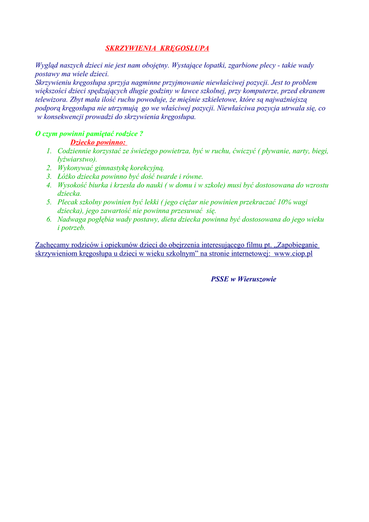 SKRZYWIENIA KRĘGOSŁUPA Wygląd naszych dzieci nie jest nam obojętny. Wystające łopatki, zgarbione plecy - takie wady postawy ma wiele dzieci. Skrzywieniu kręgosłupa sprzyja nagminne przyjmowanie niewłaściwej pozycji. Jest to problem większości dzieci spędzających długie godziny w ławce szkolnej, przy komputerze, przed ekranem telewizora. Zbyt mała ilość ruchu powoduje, że mięśnie szkieletowe, które są najważniejszą podporą kręgosłupa nie utrzymują go we właściwej pozycji. Niewłaściwa pozycja utrwala się, co w konsekwencji prowadzi do skrzywienia kręgosłupa. O czym powinni pamiętać rodzice ? Dziecko powinno: 1. Codziennie korzystać ze świeżego powietrza, być w ruchu, ćwiczyć ( pływanie, narty, biegi, łyżwiarstwo). 2. Wykonywać gimnastykę korekcyjną. 3. Łóżko dziecka powinno być dość twarde i równe. 4. Wysokość biurka i krzesła do nauki ( w domu i w szkole) musi być dostosowana do wzrostu dziecka. 5. Plecak szkolny powinien być lekki ( jego ciężar nie powinien przekraczać 10% wagi dziecka), jego zawartość nie powinna przesuwać się. 6. Nadwaga pogłębia wady postawy, dieta dziecka powinna być dostosowana do jego wieku i potrzeb. Zachęcamy rodziców i opiekunów dzieci do obejrzenia interesującego filmu pt. „Zapobieganie skrzywieniom kręgosłupa u dzieci w wieku szkolnym” na stronie internetowej: www.ciop.pl PSSE w Wieruszowie