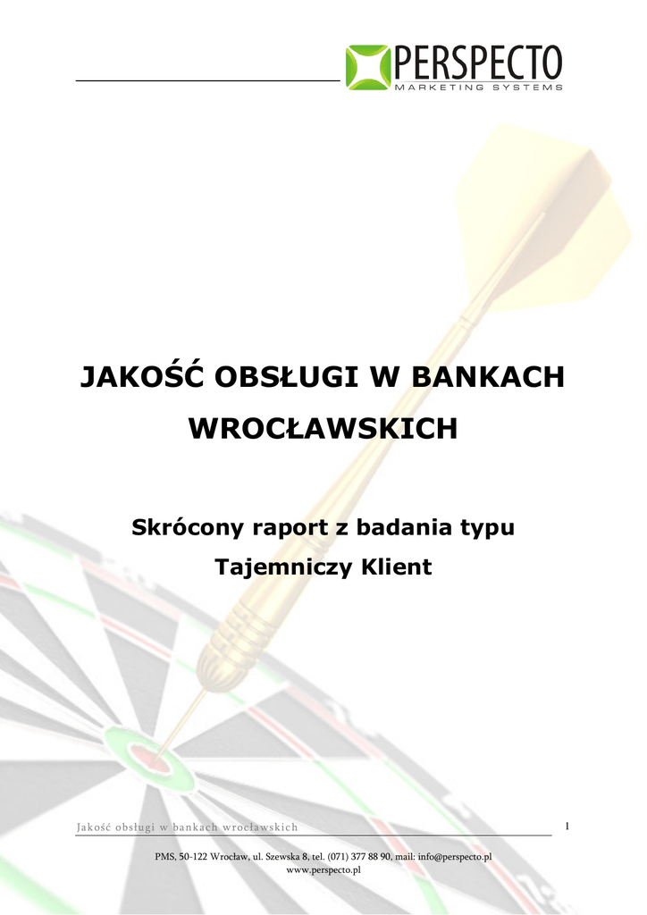 JAKOŚĆ OBSŁUGI W BANKACH WROCŁAWSKICH Skrócony raport z badania typu Tajemniczy Klient Jak ość ob sług i w b a nk a ch wr o cła wski c h PMS, 50-122 Wrocław, ul. Szewska 8, tel. (071) 377 88 90, mail: [email protected] www.perspecto.pl 1 Pozyskanie klienta i doprowadzenie do zawarcia z nim transakcji finansowej pozostaje ważnym elementem strategii sprzedażowej banków, ale o wiele ważniejsze w dobie kryzysu jest utrzymanie dotychczasowych klientów oraz budowanie z nimi korzystnych i długoterminowych relacji. Na wysoko konkurencyjnym rynku, gdzie klient ma do wyboru produkty i usługi najrozmaitszych firm, jednym ze sposobów zapewnienia sobie dobrej pozycji rynkowej, obok korzystnych cen, jest jakość obsługi klienta. Skomplikowana natura produktów i usług bankowych niewątpliwie predestynuje klientów do poszukiwania fachowego doradztwa w tej dziedzinie. Chiński filozof już w VI w p.n.e. zauważył, iż „jakość to doskonałość, której nie da się osiągnąć, lecz do której trzeba uporczywie zdążać” (Lao Tsu, Złota Księga). Zgodnie z tymi słowami wiele banków postawiło na doskonalenie jakości obsługi klienta, dostrzegając w niej klucz do sukcesu. Okazuje się jednak, iż zaufanie Polaków do instytucji świadczących usługi finansowe jest, co najmniej, na niskim poziomie. Idąc tym śladem firma ISSP, dział Perspecto Marketing Systems, postanowiła przeprowadzić badanie mające na celu ocenę poziomu jakości obsługi klienta w poszczególnych bankach. Pomiar został przeprowadzony za pomocą metody „Tajemniczy Klient” według zestandaryzowanego scenariusza wizyty przez odpowiednio przeszkolonych, obiektywnych Audytorów. Po odwiedzeniu wskazanej placówki Audytorzy wypełnili ankietę, w której odpowiadali na pytania kwestionariusza obserwacji. Badanie zostało przeprowadzone w sierpniu i wrześniu 2009 roku, a objęto nim 24 banki we Wrocławiu. Do wyłonienia próby badawczej zastosowano dobór losowy proporcjonalny. W zależności od ilości oddziałów danego banku we Wrocławiu, przeprowadzono proporcjonalną ilość wizyty w danej liczbie placówek, (1-5 oddziałów – 2 placówki, 6-15 oddziałów – 3 placówki, 16-25 oddziałów – 4 placówki, 26 i więcej oddziałów – 5 placówek). Głównym celem badania była ocena poziomu wszystkich faz procesu obsługi a także ocena strony wizualnej placówek. W sumie przeprowadzono 73 obserwacje, które pozwoliły ocenić jakość obsługi klienta prezentowaną na rynku banków wrocławskich. Jak ość ob sług i w b a nk a ch wr o cła wski c h PMS, 50-122 Wrocław, ul. Szewska 8, tel. (071) 377 88 90, mail: [email protected] www.perspecto.pl 2 Placówki badane były pod kątem takich cech, jak: • wygląd placówki (czystość w bezpośrednim otoczeniu oddziału i wewnątrz, dostępność i estetyka materiałów reklamowych), • prezencja pracowników i ich stanowiska pracy (ubiór, porządek stanowiska pracy, dostępność wizytówek), • bezpieczeństwo (np. brak sytuacji zagrażających poufności danych, pozostawionych bez opieki dokumentów), • wejście klienta (zauważenie i nawiązanie pierwszego kontaktu, czas oczekiwania na obsługę), • nawiązanie rozmowy (powitanie, uśmiech, zaproszenie do zajęcia miejsca siedzącego), • rozmowa (inicjatywa, zbadanie potrzeb, proponowanie produktów dodatkowych, stworzenie i wydrukowanie symulacji), • ocena sprzedawcy (kompetencje i uprzejmość), • zakończenie rozmowy (pożegnanie, zachęcenie do ponownej wizyty). Dla każdej z kategorii ustalono następujące wagi: WYGLĄD PLACÓWKI I PRACOWNIKÓW Wygląd placówki Prezencja pracowników i ich stanowiska Bezpieczeństwo OBSŁUGA KLIENTA Wejście Nawiązanie rozmowy Rozmowa Ocena sprzedawcy Zakończenie rozmowy 100% 36% 16% 14% 6% 64% 12% 9% 14% 19% 10% Jak ość ob sług i w b a nk a ch wr o cła wski c h PMS, 50-122 Wrocław, ul. Szewska 8, tel. (071) 377 88 90, mail: [email protected] www.perspecto.pl 3 Wnioski audytorów pozwoliły na sporządzenie ogólnego rankingu banków we Wrocławiu: Jakość obsługi w bankach wrocławskich - ranking ogólny 0% 20% 40% 60% 80% 100% Alior Bank 87% ING Bank Śląski 87% Millennium 86% Raiffeisen Bank Polska 86% Polbank EFG 83% Kredyt Bank 83% GE Money 82% BZ WBK 82% BPS 79% Citibank Handlowy 79% 78% Nordea 77% Eurobank 75% BGŻ Multibank 74% AIGO 74% Deutsche Bank Polska 74% Pekao 72% PKO BP 72% Invest Bank 70% Getin Bank 70% Lukas Bank 66% BPH 66% Fortis Bank (Dominet) 62% BOŚ 62% Jak ość ob sług i w b a nk a ch wr o cła wski c h PMS, 50-122 Wrocław, ul. Szewska 8, tel. (071) 377 88 90, mail: [email protected] www.perspecto.pl 4 WYGLĄD PLACÓWKI I PRACOWNIKÓW „Wygląd placówki” Pierwszym elementem branym pod uwagę przy ocenie jakości usług bankowych, był ogólny wygląd placówek, zarówno otoczenia jak i wnętrza. Ponadto audytorzy sprawdzali czy oznaczenia, gdzie można załatwić daną sprawę, były jasne/czytelne, czy materiały reklamowe były dostępne dla klienta i czy były nieuszkodzone, czy witryny i drzwi (powierzchnie szklane) były czyste oraz czy meble (stoły, biurka, krzesła) były nieuszkodzone. Najwięcej punktów w tej kategorii otrzymały Alior Bank, ING Bank Śląski, Reiffeisen Bank, BGŻ i Aigo (100%). Najniższe wartości w rankingu zanotował Deutsche Bank (82%), Multibank (85%), Pekao SA (87%), Eurobank (88%). Na pytanie, czy 94,5% wnętrze placówki sprawiało wrażenie ogólnie uporządkowanego, Tajemniczych Klientów odpowiedziało pozytywnie. W czterech przypadkach odnotowano nieprawidłowości (BOŚ, BZ WBK, Deutsche Bank i Eurobank), np. „Wnętrze placówki prezentowało się niezbyt schludnie, wszędzie było widać stosy dokumentów, wystające kable, drzwi otwarte na zaplecze, generalnie wrażenie chaosu i nieporządku”. Czystość witryn, drzwi i powierzchni szklanych nie budziła w większości zastrzeżeń (93,2%). Sporadycznie zauważono niedociągnięcia, głów