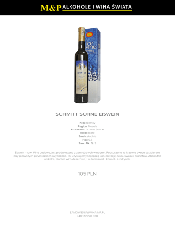 SCHMITT SOHNE EISWEIN Kraj: Niemcy Region: Mozela Producent: Schmitt Sohne Kolor: białe Smak: słodkie Poj.: 0,5 Zaw. Alk. %: 9 Eiswein – tzw. Wino Lodowe, jest produkowane z zamrożonych winogron. Podsuszone na krzewie owoce są zbierane przy pierwszych przymrozkach i wyciskane, tak uzyskujemy najlepszą koncentrację cukru, kwasu i aromatów. Absolutnie unikalne, słodkie wino deserowe, z nutami miodu, karmelu i rodzynek. 105 PLN [email protected] +48 512 270 830