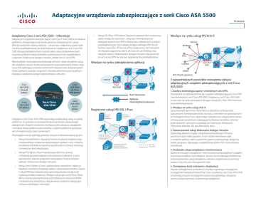 Adaptacyjne urządzenia zabezpieczające z serii Cisco ASA 5500 W skrócie Urządzenia Cisco z serii ASA 5500 – Informacje • Adaptacyjne urządzenia zabezpieczające z serii Cisco® ASA 5500 to modularna platforma udostępniająca najnowszej generacji zabezpieczenia i usługi VPN dla środowisk o różnej wielkości – od domów i małych biur, przez małe i średnie przedsiębiorstwa, po duże korporacje. Urządzenia z serii Cisco ASA 5500 oferują przedsiębiorstwom szeroki zakres usług, dostosowywanych za pomocą różnych wersji produktów przeznaczonych do współdziałania z zaporami, blokowania dostępu intruzów, działań anti-X i sieci VPN. Różnorodność wersji zapewnia doskonałą ochronę i właściwe pakiety usług dla wszystkich sytuacji. Każda wersja zawiera wyspecjalizowany zestaw usług Cisco ASA spełniający potrzeby konkretnych obszarów sieci korporacyjnych. Dzięki spełnieniu potrzeb związanych z bezpieczeństwem poszczególnych lokalizacji, zwiększone zostaje bezpieczeństwo całej sieci. Wersja SSL/IPsec VPN Edition: Zapewnia użytkownikom bezpieczny, zdalny dostęp do systemów i usług sieci wewnętrznej oraz obsługuje łączenie sieci VPN w klastry przy wdrożeniach w dużych przedsiębiorstwach. Technologie dostępu zdalnego VPN Secure Sockets Layer (SSL) i IP Security (IPsec) połączone z technologiami zmniejszania zagrożenia, takimi jak Cisco Secure Desktop, oraz usługami zapory i blokowaniem dostępu intruzów dają pewność, że ruch w sieci VPN nie stanowi zagrożenia dla przedsiębiorstwa. Wiodące na rynku zabezpieczenia aplikacji Cisco ASA 5500 IPS Edition Cisco ASA 5500 Anti-X Edition Urządzenia z serii Cisco ASA 5500 zapewniają standaryzację usług na jednej platformie, co pozwala na zmniejszenie łącznego kosztu operacyjnego zabezpieczeń. Wspólne środowisko konfiguracyjne upraszcza zarządzanie i zmniejsza koszty szkolenia pracowników, a wspólna platforma sprzętowa serii zmniejsza koszty części zamiennych. Poszczególne wersje spełniają potrzeby różnych środowisk korporacyjnych: • Wersja Firewall Edition: Zapewnia firmom możliwość bezpiecznego i niezawodnego wdrażania najważniejszych aplikacji i sieci. Unikalna, modularna architektura zapewnia wysoki poziom ochrony inwestycji i zmniejszony koszt eksploatacji. • Wersja IPS Edition: Chroni najważniejsze dla firmy serwery i infrastrukturę przed robakami internetowymi, hakerami i innymi zagrożeniami poprzez połączenie usług zapory, bezpieczeństwa aplikacji i blokowania dostępu intruzów. • Wersja Anti-X Edition: Chroni użytkowników niewielkich i zdalnych lokalizacji za pomocą bogatego pakietu usług bezpieczeństwa. Zapora i usługi VPN klasy korporacyjnej zapewniają bezpieczną łączność z główną siedziba korporacji. Wiodące usługi typu anti-X firmy Trend Micro chronią systemy klienckie przed złośliwymi witrynami WWW i niebezpieczną zawartością, taką jak wirusy, programy szpiegujące i witryny wyłudzające informacje. Witty Cisco ASA 5500 NIMDA W32. Przyszłe zagrożenia Cisco ASA 5500 SSL/IPsec VPN Edition Seria Cisco ASA 5500 Slammer MS Blaster Code Red 5 najważniejszych powodów rozważenia zakupu adaptacyjnych urządzeń zabezpieczających z serii Cisco ASA 5500 Internet Cisco ASA 5500 Firewall Edition Wiodące na rynku usługi IPS/Anti-X Cisco ASA 5500 1. Zaufana technologia zapory i chronionych sieci VPN. Ruch biznesowy Aplikacje równorzędne/tunelowane 2. Wiodące na rynku usługi Anti-X Bezpieczne usługi VPN SSL i IPsec Łączność między oddziałami Zbudowane na zaufanej technologii urządzeń zabezpieczających Cisco PIX® i koncentratorów z serii Cisco VPN 3000. Urządzenia z serii Cisco ASA 5500 to pierwsze na rynku rozwiązanie oferujące usługi SSL i IPsec VPN chronione przez doskonałą zaporę. Łączą doświadczenie firmy Trend Micro w dziedzinie ochrony przez zagrożeniami i kontrolowania treści na styku z Internetem ze sprawdzonymi technologiami firmy Cisco, zapewniając rozbudowane usługi antywirusowe, ochronę przed programami szpiegującymi, blokowanie plików, ochronę przed spamem i witrynami wyłudzającymi informacje, blokowanie i filtrowanie adresów URL oraz filtrowanie treści. Ekstranet partnerów 3. Zaawansowane usługi blokowania dostępu intruzów Mobilny dostęp za pomocą kiosków multimedialnych Cisco ASA 5500 Komputer domowy pracownika bez potrzeby zarządzania SSL VPN IPsec VPN Zapewniają aktywne, bogate usługi blokowania dostępu intruzów powstrzymujące wiele zagrożeń, w tym robaki internetowe, ataki w warstwie aplikacji, ataki na poziomie systemu operacyjnego, programy rootkit, programy szpiegujące, współdzielenie plików P2P i komunikatory internetowe. 4. Doskonałe usługi zarządzania i monitorowania Zapewnia intuicyjne zarządzanie i monitorowanie poszczególnych urządzeń za pomocą narzędzia Cisco Adaptive Security Device Manager (ASDM) oraz korporacyjnej klasy usługi zarządzania wieloma urządzeniami za pomocą zestawu Cisco Security Management Suite. 5. Zmniejszony koszt wdrożenia i eksploatacji Poprzez udostępnienie architektury i interfejsu zgodnego z dostępnymi rozwiązaniami bezpieczeństwa firmy Cisco, urządzenia z serii Cisco ASA 5500 umożliwiają znaczne zmniejszenie kosztów początkowego wdrożenia systemu bezpieczeństwa i codziennego zarządzania. Adaptacyjne urządzenia zabezpieczające z serii Cisco ASA 5500 W skrócie SKRÓTY SSC: Security Services Card (Karta usług bezpieczeństwa), SSM: Security Services Module (Moduł usług bezpieczeństwa), AIP-SSM: Advanced Inspection and Prevention Security Services Module (Zaawansowany moduł usług badania i zapobiegania), CSC-SSM: Content Security and Control Security Services Module (Moduł usług bezpieczeństwa i kontroli treści), 4GE-SSM: 4 Gigabit Ethernet Security Services Module (Moduł usług bezpieczeństwa sieci Ethernet 4Gb) Model/licencja z serii Cisco ASA 5500 Cisco ASA 5505 Base/Sec