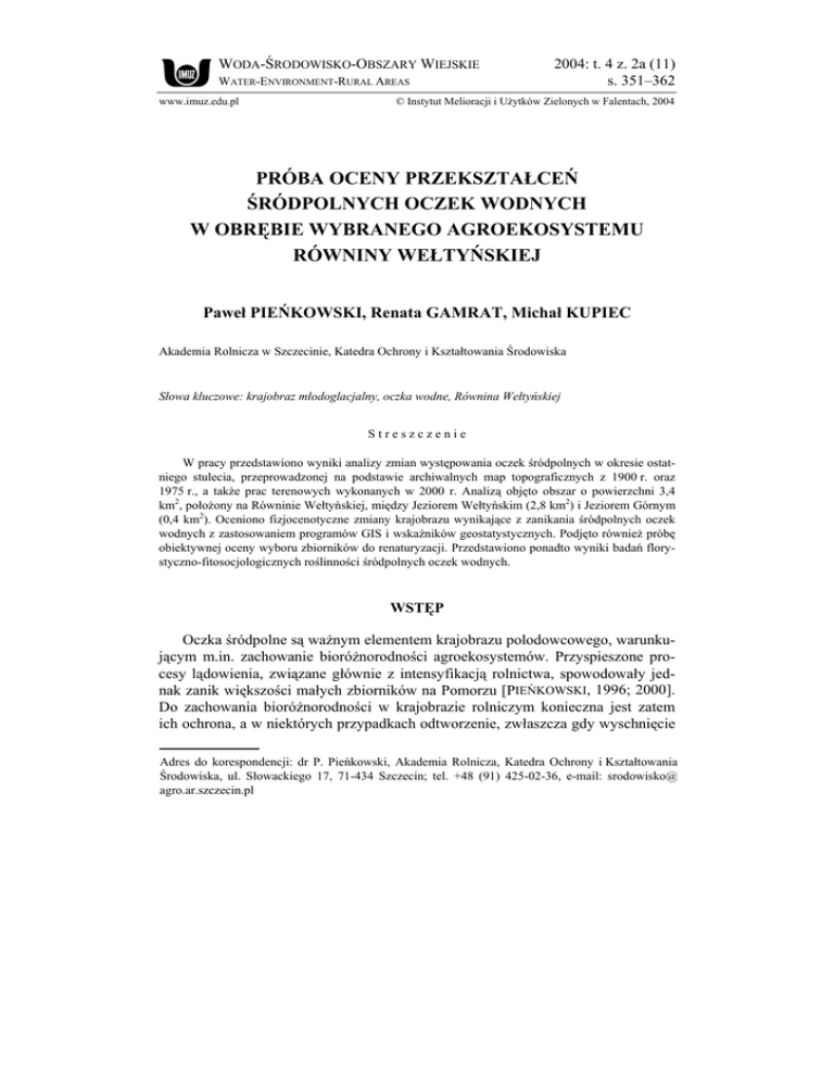 WODA-ŚRODOWISKO-OBSZARY WIEJSKIE WATER-ENVIRONMENT-RURAL AREAS www.imuz.edu.pl 2004: t. 4 z. 2a (11) s. 351–362 © Instytut Melioracji i Użytków Zielonych w Falentach, 2004 PRÓBA OCENY PRZEKSZTAŁCEŃ ŚRÓDPOLNYCH OCZEK WODNYCH W OBRĘBIE WYBRANEGO AGROEKOSYSTEMU RÓWNINY WEŁTYŃSKIEJ Paweł PIEŃKOWSKI, Renata GAMRAT, Michał KUPIEC Akademia Rolnicza w Szczecinie, Katedra Ochrony i Kształtowania Środowiska Słowa kluczowe: krajobraz młodoglacjalny, oczka wodne, Równina Wełtyńskiej Streszczenie W pracy przedstawiono wyniki analizy zmian występowania oczek śródpolnych w okresie ostatniego stulecia, przeprowadzonej na podstawie archiwalnych map topograficznych z 1900 r. oraz 1975 r., a także prac terenowych wykonanych w 2000 r. Analizą objęto obszar o powierzchni 3,4 km2, położony na Równinie Wełtyńskiej, między Jeziorem Wełtyńskim (2,8 km2) i Jeziorem Górnym (0,4 km2). Oceniono fizjocenotyczne zmiany krajobrazu wynikające z zanikania śródpolnych oczek wodnych z zastosowaniem programów GIS i wskaźników geostatystycznych. Podjęto również próbę obiektywnej oceny wyboru zbiorników do renaturyzacji. Przedstawiono ponadto wyniki badań florystyczno-fitosocjologicznych roślinności śródpolnych oczek wodnych. WSTĘP Oczka śródpolne są ważnym elementem krajobrazu polodowcowego, warunkującym m.in. zachowanie bioróżnorodności agroekosystemów. Przyspieszone procesy lądowienia, związane głównie z intensyfikacją rolnictwa, spowodowały jednak zanik większości małych zbiorników na Pomorzu [PIEŃKOWSKI, 1996; 2000]. Do zachowania bioróżnorodności w krajobrazie rolniczym konieczna jest zatem ich ochrona, a w niektórych przypadkach odtworzenie, zwłaszcza gdy wyschnięcie Adres do korespondencji: dr P. Pieńkowski, Akademia Rolnicza, Katedra Ochrony i Kształtowania Środowiska, ul. Słowackiego 17, 71-434 Szczecin; tel. +48 (91) 425-02-36, e-mail: srodowisko@ agro.ar.szczecin.pl 352 Woda-Środowisko-Obszary Wiejskie t. 4 z. 2a (11) obiektu spowodowało przerwanie łączności między sąsiednimi, większymi biotopami otwartych wód powierzchniowych. Małe zbiorniki wodne pełnią rolę tzw. „wysp przystankowych” w obrębie obszarów ubogich w wody powierzchniowe, które mogą tworzyć korytarze ekologiczne między większymi zespołami otwartych wód powierzchniowych. Należy im przypisać znacznie większe znaczenie fizjocenotyczne w porównaniu ze zbiornikami położonymi na obszarach obfitujących w inne typy wód powierzchniowych. Typowanie obiektów do restytucji wymaga jednak wielu studiów z zakresu ekologicznych wymagań gatunków flory i fauny, związanych ze środowiskiem wodnym. Zarysowuje się również potrzeba obiektywnej oceny biotopów wodnych pod kątem ich wzajemnego położenia względem innych elementów krajobrazu. Dlatego też celem pracy była próba oceny zmian fizjocenotycznych i biocenotycznych, które zaszły na obszarze analizowanego agroekosystemu w wyniku zmian w rozmieszczeniu małych zbiorników wodnych. Do analizy wykorzystano systemy informacji geograficznej (GIS) oraz programy do obliczeń mierników statystyki przestrzennej (CrimeStat i Fragstats). MATERIAŁ I METODY Analizę występowania oczek przeprowadzono na podstawie materiałów kartograficznych (mapy topograficzne w skali 1:25000 z lat 1900 i 1975) oraz oceny stanu zbiorników, dokonanej w terenie w 2000 r. Kontury wszystkich obiektów wodnych zdigitalizowano w programie ArcInfo, a następnie dokonano analizy buforowania (wyznaczenie obszaru o zadanej odległości od buforowanego obiektu) od brzegów zbiorników wodnych. Powierzchnie buforów w zależności od przyjętej ekwidystanty mogą np. odpowiadać teoretycznej rocznej przestrzeni życiowej poszczególnych gatunków płazów lub symulować możliwe drogi migracyjne [BLASCHKE, 1997; JEDICKE, 1991]. Analizę rozkładu przestrzennego oczek wodnych wykonano za pomocą programu CrimeStat [LEVINE, 2000]. Regularność rozkładu obiektów oceniono na podstawie analizy najbliższego sąsiedztwa (ang. „nearest neighbour analysis”) [EARICKSON, HARLIN, 1994], polegającej na obliczeniu średniej odległości między najbliżej leżącymi punktami pomiarowymi, a następnie jej porównaniu z odległością teoretyczną [MAGNUSZEWSKI, 1999]. Średnią odległość do najbliższego sąsiada (ang. „nearest neighbour distance”) d(NN) obliczono na podstawie wzoru: N ⎛d ⎞ d ( NN ) = ∑ ⎜ i ⎟ i =1 ⎝ N ⎠ (1) P. Pieńkowski, R. Gamrat, M. Kupiec: Próba oceny przekształceń ... 353 gdzie: N – liczba punktów, m; di – odległość kolejnego punktu i do najbliższego sąsiada, m. Wskaźnik najbliższego sąsiedztwa (ang. „nearest neighbour index”) NNI obliczono zgodnie ze wzorem: N NNI = 2 ∑d i i =1 ⎛ A⎞ N ⎜ ⎟ ⎝N⎠ (2) gdzie: A – powierzchnia obszaru, m2; N, di – jak we wzorze (1). Wskaźnik połączeń (ang. „connectance index”) C obliczono z wykorzystaniem programu Fragstats na podstawie map wykonanych w programie Idrisi. ⎡ n ⎤ c ijk ⎥ ⎢ j =k ⎥ 100% C = ⎢⎢ ni (ni − 1) ⎥ ⎢ ⎥ 2 ⎢⎣ ⎥⎦ ∑ (3) gdzie: cijk – połączenie pomiędzy płatem j oraz płatem k, należącymi do tej samej klasy i w podanym przez użytkownika promieniu szukania (0 – brak połączenia, 1 – połączone); ni – liczba płatów danej klasy w obrębie obszaru badań. Na podstawie tego wskaźnika można ocenić możliwość połączeń między płatami należącymi do jednej klasy użytkowania w obrębie określonego bufora [MCGARIGAL i in., 2002]. Przyjmuje on wartości od 0 (gdy klasa składa się tylko z jednego płata lub w szukanej odległości brak „połączeń”) do 100 (gdy wszystkie płaty danej klasy mają między sobą „połączenia”). Przeprowadzono również badania florystyczno-fitosocjologiczne szaty roślinnej oczek. Wykonano 30 spisów florystycznych oraz 45 zdjęć fitosocjologicznych. Nazewnictwo gatunków oraz grup syntaksonomiczn