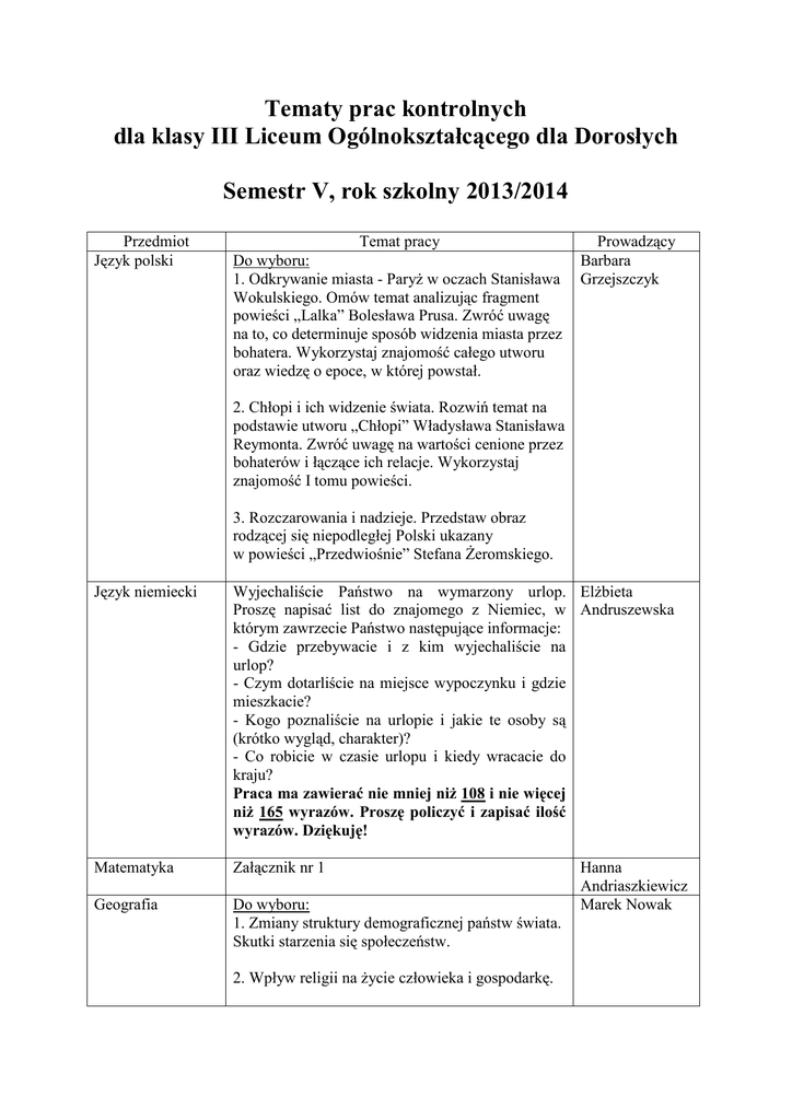 Klasa III LO, semestr V, rok szkolny 2013/2014