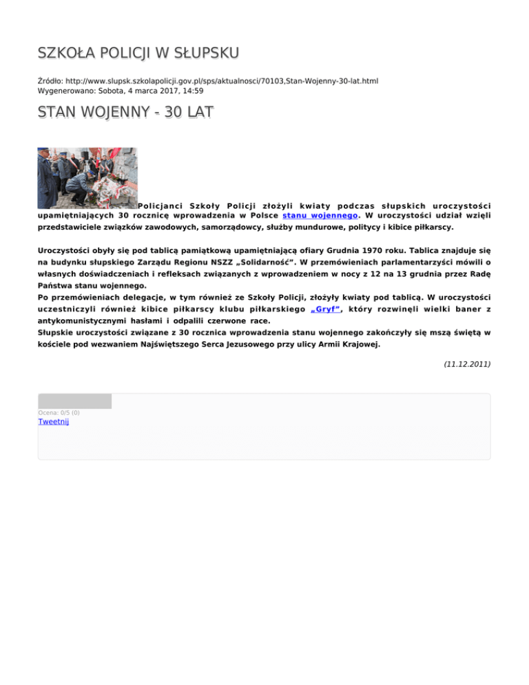 SZKOŁA POLICJI W SŁUPSKU Źródło: http://www.slupsk.szkolapolicji.gov.pl/sps/aktualnosci/70103,Stan-Wojenny-30-lat.html Wygenerowano: Sobota, 4 marca 2017, 14:59 STAN WOJENNY - 30 LAT Policjanci Szkoły Policji złożyli kwiaty podczas słupskich uroczystości upamiętniających 30 rocznicę wprowadzenia w Polsce stanu wojennego. W uroczystości udział wzięli przedstawiciele związków zawodowych, samorządowcy, służby mundurowe, politycy i kibice piłkarscy. Uroczystości obyły się pod tablicą pamiątkową upamiętniającą ofiary Grudnia 1970 roku. Tablica znajduje się na budynku słupskiego Zarządu Regionu NSZZ „Solidarność”. W przemówieniach parlamentarzyści mówili o własnych doświadczeniach i refleksach związanych z wprowadzeniem w nocy z 12 na 13 grudnia przez Radę Państwa stanu wojennego. Po przemówieniach delegacje, w tym również ze Szkoły Policji, złożyły kwiaty pod tablicą. W uroczystości uczestniczyli również kibice piłkarscy klubu piłkarskiego „Gryf”, który rozwinęli wielki baner z antykomunistycznymi hasłami i odpalili czerwone race. Słupskie uroczystości związane z 30 rocznica wprowadzenia stanu wojennego zakończyły się mszą świętą w kościele pod wezwaniem Najświętszego Serca Jezusowego przy ulicy Armii Krajowej. (11.12.2011) Ocena: 0/5 (0) Tweetnij