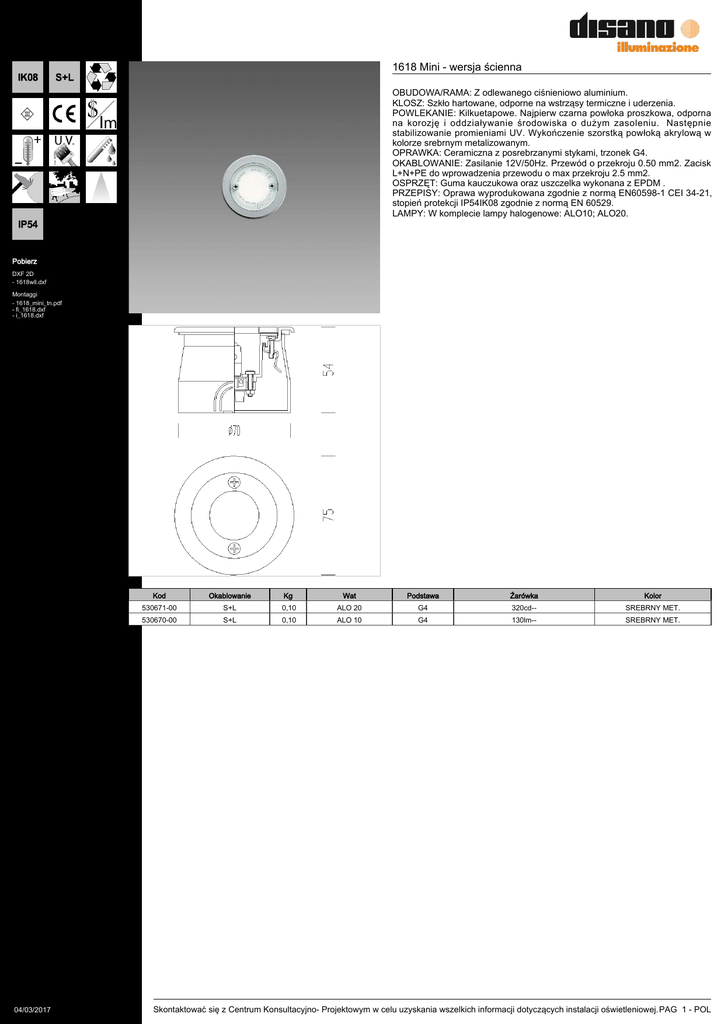 1618 Mini - wersja ścienna OBUDOWA/RAMA: Z odlewanego ciśnieniowo aluminium. KLOSZ: Szkło hartowane, odporne na wstrząsy termiczne i uderzenia. POWLEKANIE: Kilkuetapowe. Najpierw czarna powłoka proszkowa, odporna na korozję i oddziaływanie środowiska o dużym zasoleniu. Następnie stabilizowanie promieniami UV. Wykończenie szorstką powłoką akrylową w kolorze srebrnym metalizowanym. OPRAWKA: Ceramiczna z posrebrzanymi stykami, trzonek G4. OKABLOWANIE: Zasilanie 12V/50Hz. Przewód o przekroju 0.50 mm2. Zacisk L+N+PE do wprowadzenia przewodu o max przekroju 2.5 mm2. OSPRZĘT: Guma kauczukowa oraz uszczelka wykonana z EPDM . PRZEPISY: Oprawa wyprodukowana zgodnie z normą EN60598-1 CEI 34-21, stopień protekcji IP54IK08 zgodnie z normą EN 60529. LAMPY: W komplecie lampy halogenowe: ALO10; ALO20. Pobierz DXF 2D - 1618wll.dxf Montaggi - 1618_mini_tn.pdf - fi_1618.dxf - i_1618.dxf 04/03/2017 Kod Okablowanie Kg Wat Podstawa Źarówka Kolor 530671-00 S+L 0,10 ALO 20 G4 320cd-- SREBRNY MET. 530670-00 S+L 0,10 ALO 10 G4 130lm-- SREBRNY MET. Skontaktować się z Centrum Konsultacyjno- Projektowym w celu uzyskania wszelkich informacji dotyczących instalacji oświetleniowej. PAG 1 - POL