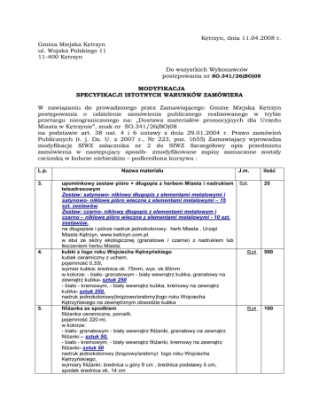 Kętrzyn, dnia 11.04.2008 r. Gmina Miejska Kętrzyn ul. Wojska Polskiego 11 11-400 Kętrzyn Do wszystkich Wykonawców postępowania nr SO.341/26(BO)08 MODYFIKACJA SPECYFIKACJI ISTOTNYCH WARUNKÓW ZAMÓWIENA W nawiązaniu do prowadzonego przez Zamawiającego: Gminę Miejską Kętrzyn postępowania o udzielenie zamówienia publicznego realizowanego w trybie przetargu nieograniczonego na: „Dostawa materiałów promocyjnych dla Urzędu Miasta w Kętrzynie”, znak nr SO.341/26(BO)08 na podstawie art. 38 ust. 4 i 6 ustawy z dnia 29.01.2004 r. Prawo zamówień Publicznych (t. j. Dz. U. z 2007 r., Nr 223, poz. 1655) Zamawiający wprowadza modyfikację SIWZ załącznika nr 2 do SIWZ Szczegółowy opis przedmiotu zamówienia w następujący sposób- zmodyfikowane zapisy zaznaczone zostały czcionką w kolorze niebieskim – podkreślona kursywa : L.p. 3. 4. 5. Nazwa materiału upominkowy zestaw pióro + długopis z herbem Miasta i nadrukiem teleadresowym Zestaw: satynowo- niklowy długopis z elementami metalowymi i satynowo- niklowe pióro wieczne z elementami metalowymi – 15 szt. zestawów. Zestaw: czarno- niklowy długopis z elementami metalowym i czarno – niklowe pióro wieczne z elementami metalowymi - 10 szt. zestawów. na długopisie i piórze nadruk jednokolorowy: herb Miasta , Urząd Miasta Kętrzyn, www.ketrzyn.com.pl w etui ze skóry ekologicznej (granatowe / czarne) z nadrukiem lub tłoczeniem herbu Miasta. kubki z logo roku Wojciecha Kętrzyńskiego kubek ceramiczny z uchem, pojemność 0,33l, wymiar kubka: średnica ok. 75mm, wys. ok.90mm w kolorze: - biało- granatowym - biały wewnątrz kubka, granatowy na zewnątrz kubka- sztuk 250 - biało - kremowym, - biały wewnątrz kubka, kremowy na zewnątrz kubka- sztuk 250, nadruk jednokolorowy(brązowo/srebrny)logo roku Wojciecha Kętrzyńskiego na zewnętrznym obwodzie kubka filiŜanka ze spodkiem filiŜanka ceramiczna, porcelit, pojemność 220 ml, w kolorze: - biało- granatowym - biały wewnątrz filiŜanki, granatowy na zewnątrz filiŜanki – sztuk 50, - biało - kremowym, - biały wewnątrz filiŜanki, kremowy na zewnątrz filiŜanki- sztuk 50 nadruk jednokolorowy (brązowy/srebrny) logo roku Wojciecha Kętrzyńskiego, wymiary filiŜanki: średnica u góry 9 cm , średnica podstawy 5 cm, spodek średnica ok. 14 cm J.m. ilość Szt. 25 Szt. 500 Szt. 100 6. torby papierowe papier powlekany 170g/m² gładki, kolor ecru, wymiar: 33-36cm(W) x 22-25 cm(S) x 9-12 cm (G), uchwyt sznurek w kolorze brązowym, z herbem Miasta, nadrukiem teleadresowym i logo roku Wojciecha Kętrzyńskiego nadruk brąz jedna strona herb miasta i nadruk teleadresowy, druga strona logo roku Wojciecha Kętrzyńskiego na środku- centralnie. Szt. 1000 Pozostałe zapisy Specyfikacji Istotnych Warunków Zamówienia pozostają bez zmian. Wykonawcy są zobowiązani uwzględnić powyŜsze zmiany podczas sporządzania ofert, w tym takŜe podczas wypełniania załączników i druków a w szczególności nanieść zmodyfikowane zapisy przedmiotu zamówienia w formularzu cenowym, stanowiącym zał. nr 4 do SIWZ. Na stronie internetowej Zamawiającego www.ketrzyn.com.pl formularz ofertowy zawierający zmodyfikowane zapisy. do pobrania Oferta złoŜona bez zastosowania się do powyŜszej modyfikacji podlega odrzuceniu jako niezgodna z SIWZ. Zamawiający, w celu zapewnienia Wykonawcom czasu niezbędnego do wprowadzenia w ofertach zmian wynikających z modyfikacji treści Specyfikacji Istotnych Warunków Zamówienia, postanowił przedłuŜyć termin składania ofert. Nowe terminy są następujące: Termin składania ofert: 17.04.2008 r. do godz. 10.00 Termin otwarcia ofert: 17.04.2008 r. o godz. 10.30. Wykonawcy składający ofertę zobowiązani są do dokonania zmiany przy adresowaniu składanych ofert- Nie otwierać przed 17.04.2008 r. godz. 10.30. (zapis pkt 10 ppkt 10 lit. a) SIWZ). ………………………………. podpis kierownika Zamawiającego