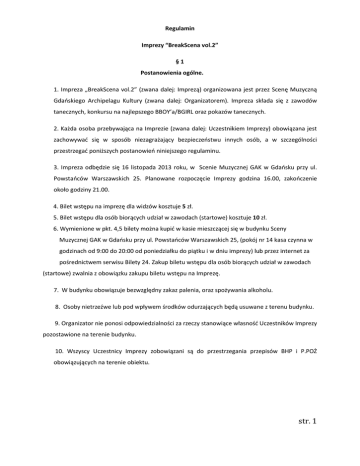 Regulamin Imprezy “BreakScena vol.2” §1 Postanowienia ogólne. 1. Impreza „BreakScena vol.2” (zwana dalej: Imprezą) organizowana jest przez Scenę Muzyczną Gdańskiego Archipelagu Kultury (zwana dalej: Organizatorem). Impreza składa się z zawodów tanecznych, konkursu na najlepszego BBOY’a/BGIRL oraz pokazów tanecznych. 2. Każda osoba przebywająca na Imprezie (zwana dalej: Uczestnikiem Imprezy) obowiązana jest zachowywać się w sposób niezagrażający bezpieczeństwu innych osób, a w szczególności przestrzegać poniższych postanowień niniejszego regulaminu. 3. Impreza odbędzie się 16 listopada 2013 roku, w Scenie Muzycznej GAK w Gdańsku przy ul. Powstańców Warszawskich 25. Planowane rozpoczęcie Imprezy godzina 16.00, zakończenie około godziny 21.00. 4. Bilet wstępu na imprezę dla widzów kosztuje 5 zł. 5. Bilet wstępu dla osób biorących udział w zawodach (startowe) kosztuje 10 zł. 6. Wymienione w pkt. 4,5 bilety można kupić w kasie mieszczącej się w budynku Sceny Muzycznej GAK w Gdańsku przy ul. Powstańców Warszawskich 25, (pokój nr 14 kasa czynna w godzinach od 9:00 do 20:00 od poniedziałku do piątku i w dniu imprezy) lub przez internet za pośrednictwem serwisu Bilety 24. Zakup biletu wstępu dla osób biorących udział w zawodach (startowe) zwalnia z obowiązku zakupu biletu wstępu na Imprezę. 7. W budynku obowiązuje bezwzględny zakaz palenia, oraz spożywania alkoholu. 8. Osoby nietrzeźwe lub pod wpływem środków odurzających będą usuwane z terenu budynku. 9. Organizator nie ponosi odpowiedzialności za rzeczy stanowiące własność Uczestników Imprezy pozostawione na terenie budynku. 10. Wszyscy Uczestnicy Imprezy zobowiązani są do przestrzegania przepisów BHP i P.POŻ obowiązujących na terenie obiektu. str. 1 11. Uczestnicy Imprezy zobowiązani są do zapoznania się i przestrzegania poza niniejszym regulaminem również regulaminów szczegółowych: regulaminu budynku Sceny Muzycznej GAK oraz regulaminu korzystania z pomieszczeń znajdujących się w budynku Sceny Muzycznej GAK. W/w regulaminy znajdują się w widocznym miejscu w budynku Sceny Muzycznej GAK. 12. Uczestnicy Imprezy przyjmują do wiadomości i zgadzają się na to, że ich wizerunek może zostać utrwalony poprzez fotografowanie, filmowanie lub dokonywanie innego rodzaju zapisu, a także na transmitowanie, rozpowszechnianie lub przekazywanie głosu i wizerunku w jakimkolwiek materiale przedstawiającym Imprezę. 13. Organizator może utrwalić przebieg Imprezy dla celów dokumentacji oraz promocji lub reklamy Imprezy i imprez w przyszłych latach. 14. Organizator zastrzega sobie prawo do zmian w programie Imprezy - godziny mogą ulec zmianie. 15. Organizator zastrzega sobie prawa autorskie do nazwy, loga, grafik i całej Imprezy. 16. Osoby, które chcą wziąć udział w zawodach, a nie ukończyli 18 roku życia zobowiązani są do przedstawienia Organizatorowi Imprezy formularza (zgody rodziców/opiekunów na uczestnictwo w zawodach). W/w Formularz oraz regulamin imprezy można pobrać ze strony www.scenamuzyczna.pl 17. Uczestnicy Imprezy, którzy nie mają ukończonych 18 lat uczestniczą w Imprezie na wyłączną odpowiedzialność osób, którzy sprawują nad nimi opiekę prawną. 18. Organizator zastrzega sobie możliwość wprowadzenia zmian w regulaminie. 19. Organizator zastrzega sobie prawo do wprowadzenia zmian w przebiegu Imprezy z uzasadnionych powodów, np. siłę wyższą, itp., a ponadto prawo do zmiany programu pod względem artystycznym i czasowym bez uprzedniej konsultacji i rekompensaty. 20. Niniejszy regulamin znajduje się w widocznym miejscu w budynku Sceny Muzycznej GAK oraz na stronie www.scenamuzyczna.pl 21. W sprawach nieuregulowanych w niniejszym regulaminie Imprezy stosuje się przepisy określone w odpowiednich ustawach i przepisach wykonawczych do tych ustaw. str. 2 §2 Zawody 1. Warunkiem uczestnictwa w zawodach jest przesłanie do 15.11 br. zgłoszeń na adres e-mailowy: [email protected] 2. Zgłoszenie na zawody powinno zawierać następujące informacje: imię i nazwisko, wiek, ewentualnie pseudonim, miasto, kategoria/kategorie. 3. Zawody taneczne, będące integralną częścią Imprezy, odbywają się w jednej kategorii: 2 vs 2. 4. Eliminacje przeprowadzane są na zasadzie walk tanecznych po jednym wyjściu do muzyki granej przez Dj’a. Walki odbędą się w systemie pucharowym, gdzie z każdej pary walczącej, do kolejnej rundy przechodzi zwycięzca wskazany przez skład sędziowski. 5. Ustępstwem jest sytuacja w której przeciwnik nie stawi się do walki, zrezygnuje lub wystąpi nieparzysta liczba uczestników. W takim wypadku uczestnik (uczestnicy), którzy stawią się do walki przechodzą do kolejnej rundy. 6. W przypadku nieparzystej liczby zawodników startujących w danej walce w ostatniej rundzie w eliminacjach biorą udział trzy ekipy. 7. Walki odbywają się do muzyki granej przez Dj,a. 8. W zawodach tanecznych walczą soliści freestyle’ując, wychodząc jeden po drugim – zabronione jest przeszkadzanie, przerywanie przeciwnikowi. Istotna jest znajomość kroków, technik, tricków, kreatywność, wyczucie muzyki. 9. Wszyscy uczestnicy zawodów zobowiązani są do potwierdzenia uczestnictwa na zawodach – odnaleźć punkt rejestracyjny i potwierdzić uczestnictwo. 10. Każdy uczestnik zawodów zobowiązany jest do przestrzegania kolejności startowych wyznaczanych na bieżąco przez przedstawicieli Organizatora. Każdy uczestnik zawodów zobowiązany jest do przestrzegania zasad fair play. 11. Zawody oceniać będą sędziowie zaproszeni przez Organizatora. Skład sędziowski oraz jego decyzje są niepodważalne. Organizator nie ma wpływu na werdykty, zaś wszelkie wątpliwości, skargi, zażalenia należy kierować bezpośrednio do składu sędziowskiego. 12. Organizatorzy nie odpowiadają za prawa autorskie do utworów naruszone przez uczestników zawodów. str. 3 13. Każdy uczestnik zawod