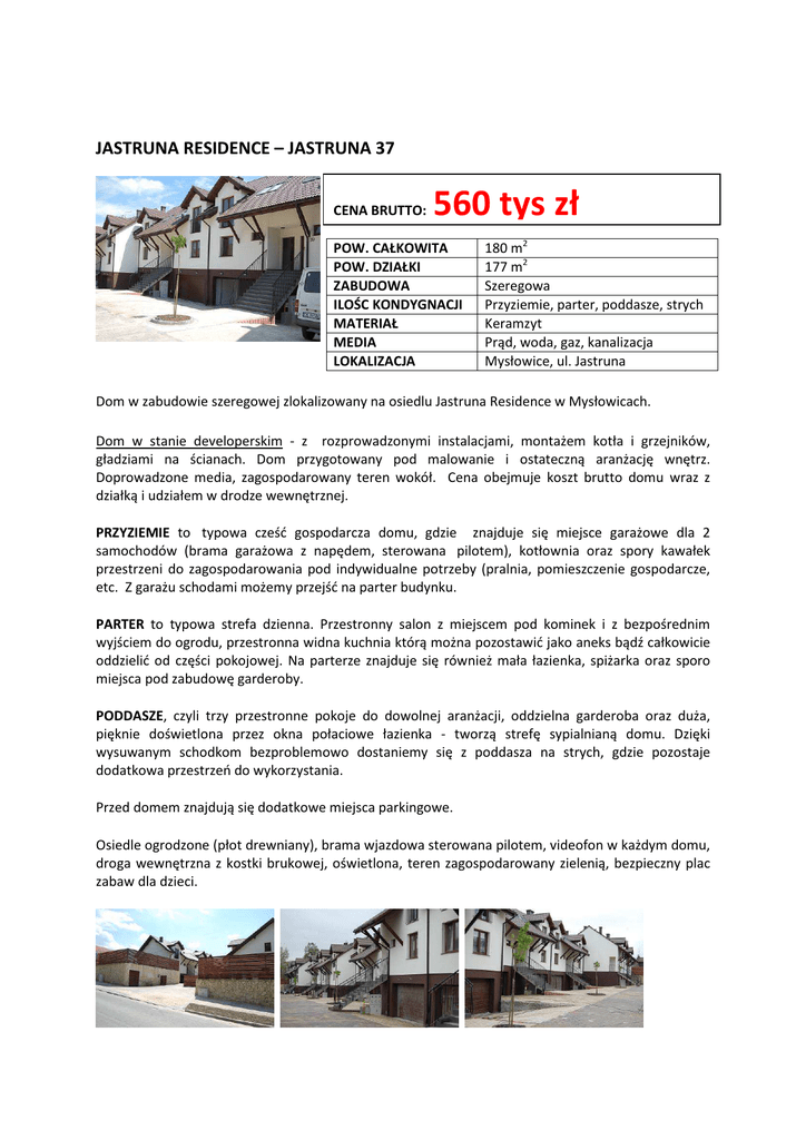 JASTRUNA RESIDENCE – JASTRUNA 37 CENA BRUTTO: 560 tys zł POW. CAŁKOWITA POW. DZIAŁKI ZABUDOWA ILOŚC KONDYGNACJI MATERIAŁ MEDIA LOKALIZACJA 180 m2 177 m2 Szeregowa Przyziemie, parter, poddasze, strych Keramzyt Prąd, woda, gaz, kanalizacja Mysłowice, ul. Jastruna Dom w zabudowie szeregowej zlokalizowany na osiedlu Jastruna Residence w Mysłowicach. Dom w stanie developerskim - z rozprowadzonymi instalacjami, montażem kotła i grzejników, gładziami na ścianach. Dom przygotowany pod malowanie i ostateczną aranżację wnętrz. Doprowadzone media, zagospodarowany teren wokół. Cena obejmuje koszt brutto domu wraz z działką i udziałem w drodze wewnętrznej. PRZYZIEMIE to typowa cześć gospodarcza domu, gdzie znajduje się miejsce garażowe dla 2 samochodów (brama garażowa z napędem, sterowana pilotem), kotłownia oraz spory kawałek przestrzeni do zagospodarowania pod indywidualne potrzeby (pralnia, pomieszczenie gospodarcze, etc. Z garażu schodami możemy przejść na parter budynku. PARTER to typowa strefa dzienna. Przestronny salon z miejscem pod kominek i z bezpośrednim wyjściem do ogrodu, przestronna widna kuchnia którą można pozostawić jako aneks bądź całkowicie oddzielić od części pokojowej. Na parterze znajduje się również mała łazienka, spiżarka oraz sporo miejsca pod zabudowę garderoby. PODDASZE, czyli trzy przestronne pokoje do dowolnej aranżacji, oddzielna garderoba oraz duża, pięknie doświetlona przez okna połaciowe łazienka - tworzą strefę sypialnianą domu. Dzięki wysuwanym schodkom bezproblemowo dostaniemy się z poddasza na strych, gdzie pozostaje dodatkowa przestrzeń do wykorzystania. Przed domem znajdują się dodatkowe miejsca parkingowe. Osiedle ogrodzone (płot drewniany), brama wjazdowa sterowana pilotem, videofon w każdym domu, droga wewnętrzna z kostki brukowej, oświetlona, teren zagospodarowany zielenią, bezpieczny plac zabaw dla dzieci. Jastruna Residende to godny szczególnej uwagi punkt na mapie inwestycji mieszkaniowych w Aglomeracji Śląskiej. Zlokalizowane w cichej i spokojnej, sąsiadującej z Katowicami dzielnicy Mysłowic osiedle domów w zabudowie szeregowej wyróżnia z jednej strony tak pożądana w dzisiejszych czasach kameralność i możliwość odpoczynku od wielkomiejskiego zgiełku, z drugiej bliskość do najważniejszych arterii komunikacyjnych regionu, co pozwala w dosłownie kilka minut przemieścić się do centrum Katowic, Mysłowic i miast ościennych. Wybór lokalizacji Osiedla Jastruna Residence nie był przypadkowy. Ulica Jastruna, w niezwykle spokojnej dzielnicy Mysłowic, to miejsce stwarzające idealne warunki do wypoczynku po trudach dnia codziennego. Otoczenie to głównie zabudowa jednorodzinna z dużą ilością zieleni. W pobliżu kilkuset metrów znajdują się między innymi przedszkole, szkoła, przychodnia, apteka, nowoczesna hala sportowa, centrum handlowe, kilkanaście sklepów, korty tenisowe, fitness club, w najbliższym czasie powstanie również kryta pływalnia, czyli praktycznie wszystko co potrzebne w codziennym życiu - na wyciągnięcie ręki. Dzielnica jest bardzo dobrze skomunikowana - w pobliżu przystanki autobusowe, z których można bezproblemowo dojechać komunikacją miejską zarówno do centrum Katowic jak i pozostałych ościennych miast. Dla zmotoryzowanych mieszkańców osiedla Katowickie Rondo to cel osiągalny w ciągu kilku minut drogi. MOŻLIWOŚC WYKOŃCZENIA DOMU „POD KLUCZ” CENA BRUTTO: 670 tys zł Oferujemy Państwu również możliwość kompleksowego wykończenia domu w wysokim standardzie do stanu „pod klucz”. W celu uzyskania szczegółowego zakresu prac i specyfikacji materiałów uprzejmie prosimy o kontakt z naszym biurem handlowym. Kontakt: 32 / 222 59 05, 507-040-451 [email protected], [email protected]