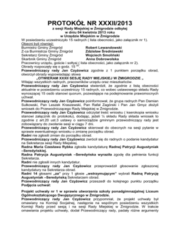 PROTOKÓŁ NR XXXII/2013 z sesji Rady Miejskiej w Żmigrodzie odbytej w dniu 04 kwietnia 2013 roku w Urzędzie Miejskim w Żmigrodzie W posiedzeniu uczestniczyło 15 radnych ( lista obecności, jako załącznik nr 1). Obecni byli również: Burmistrz Gminy Żmigród Robert Lewandowski Z-ca Burmistrza Gminy Żmigród Zdzisław Średniawski Sekretarz Gminy Żmigród Wojciech Smoliński Skarbnik Gminy Żmigród Anna Dobrowolska Pracownicy urzędu, goście i sołtysi ( lista obecności, jako załącznik nr 2). Obrady rozpoczęły się o godz. 15 00. Przewodniczący rady Jan Czyżowicz zgodnie z 1 punktem porządku obrad, otworzył obrady wypowiadając słowa „OTWIERAM XXXII SESJĘ RADY MIEJSKIEJ W ŻMIGRODZIE „ Witając wszystkich radnych, pracowników urzędu oraz mieszkańców. Przewodniczący rady Jan Czyżowicz stwierdził, że zgodnie z listą obecności aktualnie w posiedzeniu uczestniczy 15 radnych, co wobec ustawowego składu Rady wynoszącej 15 osób stanowi quorum, pozwalające na podejmowanie prawomocnych uchwał. Przewodniczący rady Jan Czyżowicz poinformował, że grupa radnych Pan Damian Sułkowski, Pan Leszek Kraszewski, Pan Rafał Zagórski i Pan Jan Gmyz złożyli wniosek do Przewodniczącego Rady Miejskiej w Żmigrodzie. Przewodniczący rady Jan Czyżowicz odczytał treść wniosku ( kserokopia wniosku stanowi załącznik do protokołu), dodając, jeżeli ¼ składu Rady składa wniosek to zgodnie z art.20 ust.3 ustawy o samorządzie gminnym przewodniczący rady jest zobowiązany do zwołanie sesji w ciągu 7 dni. Przewodniczący rady Jan Czyżowicz skierował do obecnych na sesji pytanie w sprawie ewentualnego wniosku o zmianę porządku obrad. Radni nie zgłosili zmian do porządku obrad. Przewodniczący rady Jan Czyżowicz zwrócił się do radnych o podanie kandydatur na Sekretarza sesji Rady Miejskiej. Radna Maria Czesława Rybka zgłosiła kandydaturę Radnej Patrycji Augustyniak –Seredyńskiej. Radna Patrycja Augustyniak –Seredyńska wyraziła zgodę dla pełnienia funkcji Sekretarza. Radni nie zgłosili innych kandydatur. Przewodniczący rady Jan Czyżowicz przeprowadził głosowanie zgłoszonej kandydatury na Sekretarza obrad. Radni 14 głosami „za” przy 1 głosie „wstrzymującym” wybrali Radną Patrycję Augustyniak –Seredyńską Sekretarzem obrad. Przewodniczący rady Jan Czyżowicz przeszedł do kolejnego punktu porządku Podjęcia uchwał: Projekt uchwały nr 1 w sprawie utworzenia szkoły ponadgimnazjalnej Liceum Ogólnokształcącego Dwujęzycznego w Żmigrodzie. Przewodniczący rady Jan Czyżowicz przypomniał, że projekt uchwały był omawiany na Komisji Socjalnej, następnie na wspólnym posiedzeniu wszystkich Komisji Rady przed sesją i na sesji Rady Miejskiej w Żmigrodzie. W trakcie omawiania projektu uchwały, dodał Przewodniczący rady, padały różne argumenty za utworzeniem liceum i taki był wniosek Pana Burmistrza. Padały również argumenty, aby odłożyć podjęcie uchwały do roku następnego. Pan Robert Lewandowski Burmistrz Gminy Żmigród poinformował, że w imieniu organu prowadzącego głos zabierze Pan Zdzisław Średniawski Z-ca Burmistrza Gminy Żmigród, któremu podlega oświata. Pan Zdzisław Średniawski Z-ca Burmistrza Gminy Żmigród powiedział, że do zabrania głosu sprowokowały jego dwie osoby. W dniu sesji, dodał burmistrz, w jego gabinecie była Pani, które powiedziała cytat; „…no i co przegraliście…”Dzisiaj, powiedział burmistrz, odwiedził mnie jeden z radnych i powiedział, że czuje się zastraszany, ponieważ zarzuca się jemu brak lojalności w stosunku do klubu, i to było tą kropką nad „i”. Stanowisko organu prowadzącego, co do utworzenia liceum nie uległo zmianie. Kontynuując temat Pan burmistrz powiedział, że wielką nieodpowiedzialnością byłoby powiedzenie ”nie” dla tej inicjatywy, ponieważ „nie” mówi tylko parę osób. Burmistrz dodał, że odpowiadając Pani, która powiedziała jemu ”przegraliście” nie czuje się przegrany, ponieważ organ prowadzący realizuje uchwały Rady i każdą decyzję Rady będzie realizować i szanować. Natomiast przegranymi powinni czuć się Radni, Przewodniczący rady, który jest dyrektorem szkoły, ale największym przegranym byli rodzice i młodzież. Burmistrz powiedział, iż uważa, że obecność młodzieży na sesji w dniu 28,.03.2013 i włączanie ich do polityki było niestosowne. Burmistrz zwrócił się do Radnych, że jest daleki od pouczanie, ale jest zdziwiony, że odwaga tak staniała lub inaczej drogo kosztuje, dodając cytat „..czego się boicie…”. Radni w tej sytuacji powinni odwagę okazać i mieć odwagę być odważnymi. Kontynuując temat Burmistrz Średniawski powiedział, że Radni są winni to swoim wyborcom, ponieważ bycie Radny to jest służba i myślenie nie przez pryzmat własnego JA, ale przez pryzmat potrzeb drugiego człowieka. Burmistrz dodał, iż zaangażowanie dyrektorów odbiera negatywnie, ponieważ im więcej zaangażowania od strony dyrektorów tym więcej szkody. Ponadto oczekiwanie lojalność od niektórych radnych, dodał Burmistrz, też uważa za niestosowne. Burmistrz Średniawski podziękował radnym, którzy złożyli wniosek o zwołanie sesji, a przewodniczącemu rady za zwołanie sesji. Pan Burmistrz zwrócił się do radnych, aby głosowali, a głosując Radni podejmują ważną i istotną decyzję dla gminy, powiatu i województwa, zgodnie z własnym sumieniem i w poczuciu odpowiedzialności. Radny Henryk Bagiński powiedział, że stara się głosować odpowiedzialnie. Radny dodał, że jego decyzja była na nie. Radny argumentował swoją decyzję tym, że nauczyciele, którzy pracują w PZS im. Jana Pawła II pod kątem matur mają doświadczenie. Ponadto nic nie stało na przeszkodzie, aby przy Powiatowym Zespole Szkół w Żmigrodzie utworzyć dwujęzyczne liceum tam też jest kadra cytat: „… i spróbujemy to zrobić”. Będzie to konkurencja, 