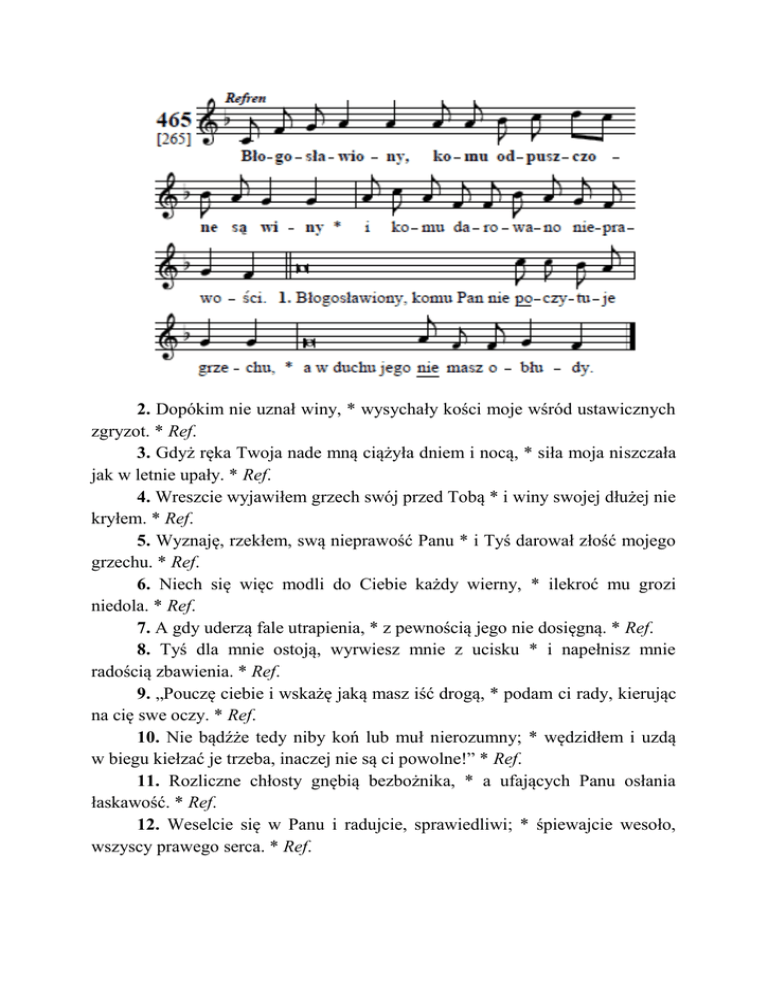 2. Dopókim nie uznał winy, * wysychały kości moje wśród ustawicznych zgryzot. * Ref. 3. Gdyż ręka Twoja nade mną ciążyła dniem i nocą, * siła moja niszczała jak w letnie upały. * Ref. 4. Wreszcie wyjawiłem grzech swój przed Tobą * i winy swojej dłużej nie kryłem. * Ref. 5. Wyznaję, rzekłem, swą nieprawość Panu * i Tyś darował złość mojego grzechu. * Ref. 6. Niech się więc modli do Ciebie każdy wierny, * ilekroć mu grozi niedola. * Ref. 7. A gdy uderzą fale utrapienia, * z pewnością jego nie dosięgną. * Ref. 8. Tyś dla mnie ostoją, wyrwiesz mnie z ucisku * i napełnisz mnie radością zbawienia. * Ref. 9. „Pouczę ciebie i wskażę jaką masz iść drogą, * podam ci rady, kierując na cię swe oczy. * Ref. 10. Nie bądźże tedy niby koń lub muł nierozumny; * wędzidłem i uzdą w biegu kiełzać je trzeba, inaczej nie są ci powolne!” * Ref. 11. Rozliczne chłosty gnębią bezbożnika, * a ufających Panu osłania łaskawość. * Ref. 12. Weselcie się w Panu i radujcie, sprawiedliwi; * śpiewajcie wesoło, wszyscy prawego serca. * Ref.