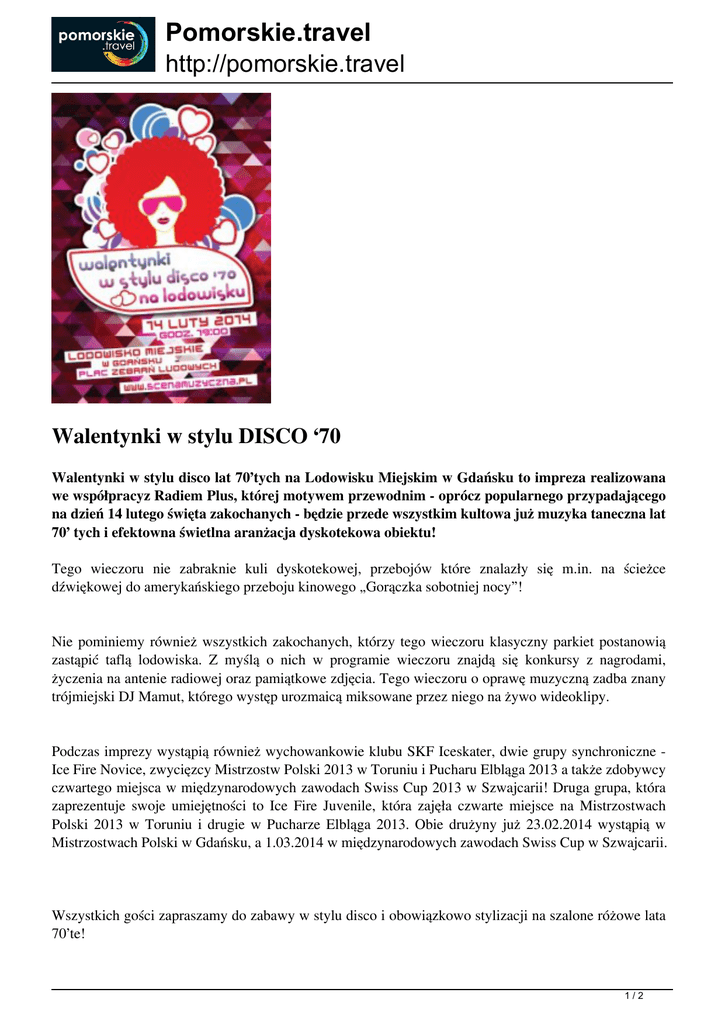 Pomorskie.travel http://pomorskie.travel Walentynki w stylu DISCO ‘70 Walentynki w stylu disco lat 70’tych na Lodowisku Miejskim w Gdańsku to impreza realizowana we współpracyz Radiem Plus, której motywem przewodnim - oprócz popularnego przypadającego na dzień 14 lutego święta zakochanych - będzie przede wszystkim kultowa już muzyka taneczna lat 70’ tych i efektowna świetlna aranżacja dyskotekowa obiektu! Tego wieczoru nie zabraknie kuli dyskotekowej, przebojów które znalazły się m.in. na ścieżce dźwiękowej do amerykańskiego przeboju kinowego „Gorączka sobotniej nocy”! Nie pominiemy również wszystkich zakochanych, którzy tego wieczoru klasyczny parkiet postanowią zastąpić taflą lodowiska. Z myślą o nich w programie wieczoru znajdą się konkursy z nagrodami, życzenia na antenie radiowej oraz pamiątkowe zdjęcia. Tego wieczoru o oprawę muzyczną zadba znany trójmiejski DJ Mamut, którego występ urozmaicą miksowane przez niego na żywo wideoklipy. Podczas imprezy wystąpią również wychowankowie klubu SKF Iceskater, dwie grupy synchroniczne Ice Fire Novice, zwycięzcy Mistrzostw Polski 2013 w Toruniu i Pucharu Elbląga 2013 a także zdobywcy czwartego miejsca w międzynarodowych zawodach Swiss Cup 2013 w Szwajcarii! Druga grupa, która zaprezentuje swoje umiejętności to Ice Fire Juvenile, która zajęła czwarte miejsce na Mistrzostwach Polski 2013 w Toruniu i drugie w Pucharze Elbląga 2013. Obie drużyny już 23.02.2014 wystąpią w Mistrzostwach Polski w Gdańsku, a 1.03.2014 w międzynarodowych zawodach Swiss Cup w Szwajcarii. Wszystkich gości zapraszamy do zabawy w stylu disco i obowiązkowo stylizacji na szalone różowe lata 70’te! 1/2 Pomorskie.travel http://pomorskie.travel DJ Mamut - już w dzieciństwie kasetowy walkman wielkości i ciężaru cegły był jego przyjacielem - tak zaczęła się przygoda z muzyką. Z czasem zaczął kolekcjonować stare winyle a walkmana zamienił na mikser i deki. I tak przypadek sprawił, że jego zainteresowanie przerodziło się w pasję, którą już od jedenastu lat dzieli się z innymi. Obecnie rozpoczął nową - do tej pory unikalną formę oprawy imprez, jaką jest miksowanie videoclipów. Można nie tylko słuchać, ale i oglądać to, co prezentuje. Wychowywał się na muzyce lat 70tych i 80tych i po dziś dzień to temat przewodni jego imprez. Zapraszamy 14 lutego o godz. 19:00 na lodowisko miejskie w Gdańsku (Plac Zebrań Ludowych). Regulamin_Imprezy_Walentynki_w_Stylu_Disco'70.pdf Regulamin_Walentynki_w_Stylu_Disco'70_studio_foto.pdf Źródło: www.scenamuzyczna.pl Paula Mazanowicz 2/2 Powered by TCPDF (www.tcpdf.org)