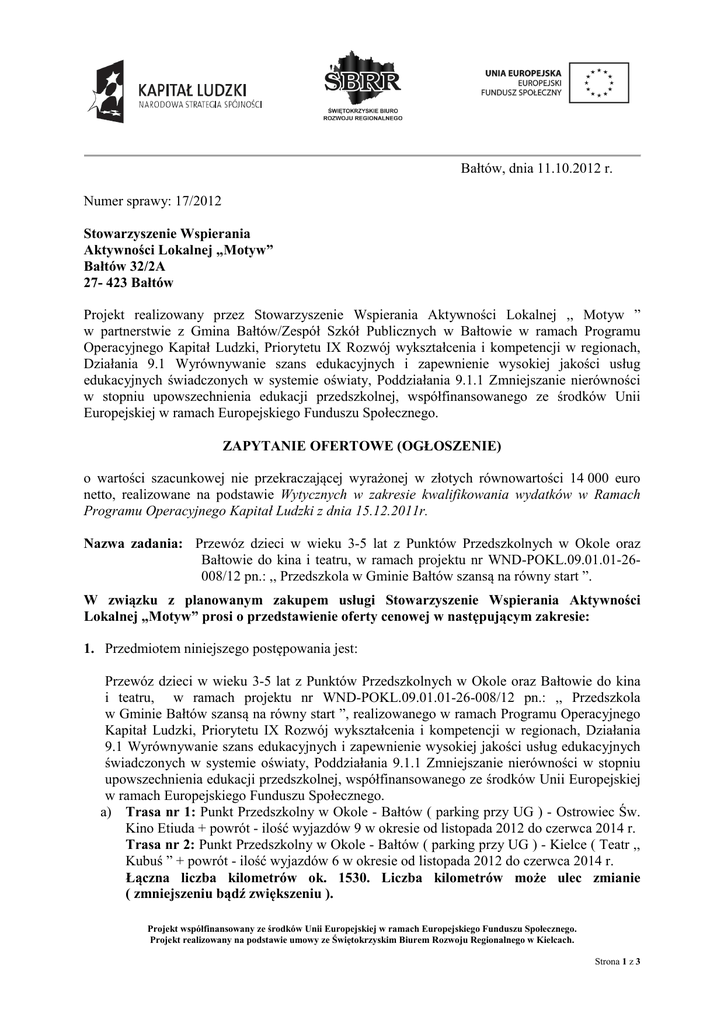 Bałtów, dnia 11.10.2012 r. Numer sprawy: 17/2012 Stowarzyszenie Wspierania Aktywności Lokalnej „Motyw” Bałtów 32/2A 27- 423 Bałtów Projekt realizowany przez Stowarzyszenie Wspierania Aktywności Lokalnej ,, Motyw ” w partnerstwie z Gmina Bałtów/Zespół Szkół Publicznych w Bałtowie w ramach Programu Operacyjnego Kapitał Ludzki, Priorytetu IX Rozwój wykształcenia i kompetencji w regionach, Działania 9.1 Wyrównywanie szans edukacyjnych i zapewnienie wysokiej jakości usług edukacyjnych świadczonych w systemie oświaty, Poddziałania 9.1.1 Zmniejszanie nierówności w stopniu upowszechnienia edukacji przedszkolnej, współfinansowanego ze środków Unii Europejskiej w ramach Europejskiego Funduszu Społecznego. ZAPYTANIE OFERTOWE (OGŁOSZENIE) o wartości szacunkowej nie przekraczającej wyrażonej w złotych równowartości 14 000 euro netto, realizowane na podstawie Wytycznych w zakresie kwalifikowania wydatków w Ramach Programu Operacyjnego Kapitał Ludzki z dnia 15.12.2011r. Nazwa zadania: Przewóz dzieci w wieku 3-5 lat z Punktów Przedszkolnych w Okole oraz Bałtowie do kina i teatru, w ramach projektu nr WND-POKL.09.01.01-26008/12 pn.: ,, Przedszkola w Gminie Bałtów szansą na równy start ”. W związku z planowanym zakupem usługi Stowarzyszenie Wspierania Aktywności Lokalnej „Motyw” prosi o przedstawienie oferty cenowej w następującym zakresie: 1. Przedmiotem niniejszego postępowania jest: Przewóz dzieci w wieku 3-5 lat z Punktów Przedszkolnych w Okole oraz Bałtowie do kina i teatru, w ramach projektu nr WND-POKL.09.01.01-26-008/12 pn.: ,, Przedszkola w Gminie Bałtów szansą na równy start ”, realizowanego w ramach Programu Operacyjnego Kapitał Ludzki, Priorytetu IX Rozwój wykształcenia i kompetencji w regionach, Działania 9.1 Wyrównywanie szans edukacyjnych i zapewnienie wysokiej jakości usług edukacyjnych świadczonych w systemie oświaty, Poddziałania 9.1.1 Zmniejszanie nierówności w stopniu upowszechnienia edukacji przedszkolnej, współfinansowanego ze środków Unii Europejskiej w ramach Europejskiego Funduszu Społecznego. a) Trasa nr 1: Punkt Przedszkolny w Okole - Bałtów ( parking przy UG ) - Ostrowiec Św. Kino Etiuda + powrót - ilość wyjazdów 9 w okresie od listopada 2012 do czerwca 2014 r. Trasa nr 2: Punkt Przedszkolny w Okole - Bałtów ( parking przy UG ) - Kielce ( Teatr ,, Kubuś ” + powrót - ilość wyjazdów 6 w okresie od listopada 2012 do czerwca 2014 r. Łączna liczba kilometrów ok. 1530. Liczba kilometrów może ulec zmianie ( zmniejszeniu bądź zwiększeniu ). Projekt współfinansowany ze środków Unii Europejskiej w ramach Europejskiego Funduszu Społecznego. Projekt realizowany na podstawie umowy ze Świętokrzyskim Biurem Rozwoju Regionalnego w Kielcach. Strona 1 z 3 b) Liczba dzieci: 44 + 6 opiekunów, liczba ta może ulec zmianie. Zamawiający na 5 dni przed planowanym wyjazdem powiadomi Wykonawcę o liczbie uczestników. c) W cenie należy uwzględnić ewentualny koszt parkingu. d) O terminie i miejscu wyjazdu Wykonawca zostanie poinformowany na min. 7 dni przed planowanym wyjazdem. e) Ceny podane w formularzu cenowym obowiązują przez cały okres realizacji zamówienia tj. od listopada 2012 do czerwca 2014 r. i nie podlegają zmianom. f) Do każdej faktury Wykonawca zobowiązuje się dołączyć kartę przewozu z wyszczególnieniem ilości przejechanych kilometrów. g) Rozliczenie pomiędzy Zamawiającym a Wykonawcą nastąpi po każdym zrealizowanym wyjeździe na podstawie cen jednostkowych uwzględnionych w formularzu cenowym. Zapłata w terminie 14 dni od dnia otrzymania prawidłowo wystawionej faktury, przelewem na rachunek bankowy wskazany w treści faktury. 2. Wspólny Słownik Zamówień: 60172000-4 - Wynajem autobusów i autokarów wraz z kierowcą 60170000 - 0 - Wynajem pojazdów przeznaczonych do transportu osób wraz z kierowcą 3. Termin wykonania zamówienia: listopad 2012 do czerwiec 2014 r. 4. Cenę za zrealizowanie niniejszego zamówienia należy obliczyć zgodnie z Formularzem cenowym - stanowiącym Załącznik Nr 1 do niniejszego zapytania ofertowego. 5. Informuję, że zaproponowane ceny będą porównane z innymi ofertami. Z firmą, która przedstawi najkorzystniejszą ofertę zostanie podpisana umowa. Od decyzji zamawiającego nie przysługują środki odwoławcze. 6. Opis warunków udziału w postępowaniu oraz opis sposobu dokonywania oceny spełniania tych warunków: I. Stowarzyszenie Wspierania Aktywności Lokalnej „Motyw” nie może udzielić zamówienia podmiotom powiązanym z nim osobowo lub kapitałowo. Przez powiązania kapitałowe lub osobowe rozumie się wzajemne powiązania między Stowarzyszeniem lub osobami upoważnionymi do zaciągania zobowiązań w imieniu Stowarzyszenia lub osobami wykonującymi w imieniu Stowarzyszenia czynności związane z przygotowaniem i przeprowadzeniem procedury wyboru wykonawcy a wykonawcą, polegające w szczególności na: a) uczestniczeniu w spółce jako wspólnik spółki cywilnej lub spółki osobowej, b) posiadaniu co najmniej 10 % udziałów lub akcji, c) pełnieniu funkcji członka organu nadzorczego lub zarządzającego, prokurenta, pełnomocnika, d) pozostawaniu w związku małżeńskim, w stosunku pokrewieństwa lub powinowactwa w linii prostej, pokrewieństwa lub powinowactwa w linii bocznej do drugiego stopnia lub w stosunku przysposobienia, opieki lub kurateli. II. a) uprawnienia do wykonywania określonej działalności lub czynności, jeżeli przepisy prawa nakładają obowiązek ich posiadania; Projekt współfinansowany ze środków Unii Europejskiej w ramach Europejskiego Funduszu Społecznego. Projekt realizowany na podstawie umowy ze Świętokrzyskim Biurem Rozwoju Regionalnego w Kielcach. Strona 2 z 3 b) dysponowania wiedzą, doświadczeniem oraz odpowiednim potencjałem technicznym i osobami zdolnymi do wykonywania zamówienia; c) sytuacji ekonomicznej i finansowej zapewniającej prawidłową