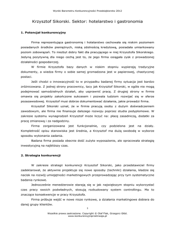 Wyniki Barometru Konkurencyjności Przedsiębiorstw 2012 Krzysztof Sikorski. Sektor: hotelarstwo i gastronomia 1. Potencjał konkurencyjny Firma reprezentująca gastronomię i hotelarstwo cechowała się niskim poziomem posiadanych środków pieniężnych, niską zdolnością kredytową, posiadała umiarkowany poziom zobowiązań. To niezbyt dobry fakt dla pracującego w niej Krzysztofa Sikorskiego. Jedyną pozytywną dla niego cechą jest to, że jego firma osiągała zysk z prowadzonej działalności gospodarczej. W firmie Krzysztofa bazy danych w niskim stopniu wypierają tradycyjne dokumenty, a wiedza firmy o sobie samej gromadzona jest w papierowej, chaotycznej postaci. Jeśli chodzi o innowacyjność to w przypadku badanej firmy sytuacja jest bardzo zróżnicowana. Z jednej strony pracownicy, tacy jak Krzysztof Sikorski, w ogóle nie mogą podejmować samodzielnych działań, aby usprawnić pracę. Z drugiej strony w firmie omawia się projekty zakończone sukcesem i pozwala ludziom rozwijać się w sferze pozazawodowej. Krzysztof musi dobrze dokumentować działania, jakie prowadzi firma. Krzysztof Sikorski uznał, że w firmie pracują osoby z dużym doświadczeniem zawodowym, ale firma nie finansuje dalszego rozwoju poprzez studia podyplomowe. W zakresie systemu wynagrodzeń Krzysztof może liczyć na: płacę zasadniczą, dodatki za pracę zmianową i za nadgodziny. Firma zorganizowana jest funkcjonalnie, czy podzielona jest na działy. Kompletność opisu stanowiska jest średnia, a Krzysztof ma dużą swobodę w wyborze sposobu wykonania zadania. Badana firma posiada obecnie dość zużyte wyposażenie, ale opracowała strategię inwestycyjną na najbliższy czas. 2. Strategia konkurencji W zakresie strategii konkurencji Krzysztof Sikorski, jako przedstawiciel firmy zadeklarował, że aktywnie projektuje się nowe sposoby (techniki) działania, kładzie się nacisk na rozwój umiejętności marketingowych przeprowadzając przy tym systematyczne badania rynkowe. Jednocześnie menedżerowie starają się w jak największym stopniu wykorzystać czas pracy swoich podwładnych, stosują rozbudowany system controllingu. Ma to znaczące konsekwencje w pracy Krzysztofa. Firma próbuje wejść w nowe nisze rynkowe, a działania marketingowe dobiera do danej grupy klientów. 1 Wszelkie prawa zastrzeżone. Copyright © Olaf Flak, Grzegorz Głód. www.konkurencyjniprzetrwaja.pl Wyniki Barometru Konkurencyjności Przedsiębiorstw 2012 3. Przewaga konkurencyjna Celem strategii cenowej firmy Krzysztofa jest obecnie maksymalizacja udziału w sektorze rynku. Klienci dość często mogą negocjować cenę, choć takie działania jedynie w sposób umiarkowany wpływają na wielkość sprzedaży. Krzysztof Sikorski uznał, że mocną stroną jest system dystrybucji, który cechuje się terminowością, dogodnym miejscem dystrybucji usług (co w tym konkretnym przypadku oznacza dobrym położeniem geograficznym) oraz dogodnym czasem otwarcia dla klienta. Tylko czasami klient może przetestować usługi firmy przed zakupem, a firma w umiarkowanym stopniu podejmuje działania proekologiczne. W zakresie promotion-mix firma stosuje głównie reklamę. Nikt z klientów nie jest objęty programem lojalnościowym! Firma też dość rzadko zaprasza klientów do tworzenia swojej oferty usługowej. 2 Wszelkie prawa zastrzeżone. Copyright © Olaf Flak, Grzegorz Głód. www.konkurencyjniprzetrwaja.pl