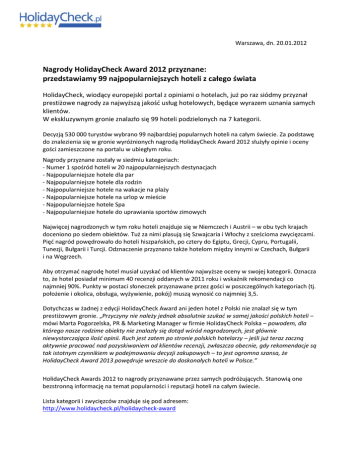 Warszawa, dn. 20.01.2012 Nagrody HolidayCheck Award 2012 przyznane: przedstawiamy 99 najpopularniejszych hoteli z całego świata HolidayCheck, wiodący europejski portal z opiniami o hotelach, już po raz siódmy przyznał prestiżowe nagrody za najwyższą jakość usług hotelowych, będące wyrazem uznania samych klientów. W ekskluzywnym gronie znalazło się 99 hoteli podzielonych na 7 kategorii. Decyzją 530 000 turystów wybrano 99 najbardziej popularnych hoteli na całym świecie. Za podstawę do znalezienia się w gronie wyróżnionych nagrodą HolidayCheck Award 2012 służyły opinie i oceny gości zamieszczone na portalu w ubiegłym roku. Nagrody przyznane zostały w siedmiu kategoriach: - Numer 1 spośród hoteli w 20 najpopularniejszych destynacjach - Najpopularniejsze hotele dla par - Najpopularniejsze hotele dla rodzin - Najpopularniejsze hotele na wakacje na plaży - Najpopularniejsze hotele na urlop w mieście - Najpopularniejsze hotele Spa - Najpopularniejsze hotele do uprawiania sportów zimowych Najwięcej nagrodzonych w tym roku hoteli znajduje się w Niemczech i Austrii – w obu tych krajach doceniono po siedem obiektów. Tuż za nimi plasują się Szwajcaria i Włochy z sześcioma zwycięzcami. Pięć nagród powędrowało do hoteli hiszpańskich, po cztery do Egiptu, Grecji, Cypru, Portugalii, Tunezji, Bułgarii i Turcji. Odznaczenie przyznano także hotelom między innymi w Czechach, Bułgarii i na Węgrzech. Aby otrzymać nagrodę hotel musiał uzyskać od klientów najwyższe oceny w swojej kategorii. Oznacza to, że hotel posiadał minimum 40 recenzji oddanych w 2011 roku i wskaźnik rekomendacji co najmniej 90%. Punkty w postaci słoneczek przyznawane przez gości w poszczególnych kategoriach (tj. położenie i okolica, obsługa, wyżywienie, pokój) muszą wynosić co najmniej 3,5. Dotychczas w żadnej z edycji HolidayCheck Award ani jeden hotel z Polski nie znalazł się w tym prestiżowym gronie. „Przyczyny nie należy jednak absolutnie szukać w samej jakości polskich hoteli – mówi Marta Pogorzelska, PR & Marketing Manager w firmie HolidayCheck Polska – powodem, dla którego nasze rodzime obiekty nie znalazły się dotąd wśród nagrodzonych, jest głównie niewystarczająca ilość opinii. Ruch jest zatem po stronie polskich hotelarzy – jeśli już teraz zaczną aktywnie pracować nad pozyskiwaniem od klientów recenzji, zwłaszcza obecnie, gdy rekomendacje są tak istotnym czynnikiem w podejmowaniu decyzji zakupowych – to jest ogromna szansa, że HolidayCheck Award 2013 powędruje wreszcie do doskonałych hoteli w Polsce.” HolidayCheck Awards 2012 to nagrody przyznawane przez samych podróżujących. Stanowią one bezstronną informację na temat popularności i reputacji hoteli na całym świecie. Lista kategorii i zwycięzców znajduje się pod adresem: http://www.holidaycheck.pl/holidaycheck-award O HolidayCheck HolidayCheck jest największą europejską niezależną platformą społecznościową dotyczącą podróży. HolidayCheck pomaga użytkownikom znaleźć najodpowiedniejszy hotel, umożliwia kontakt z innymi podróżnymi, a także oferuje bezpośrednią rezerwację. Baza portalu to ponad 7 milionów opinii, zdjęć oraz materiałów video zamieszczonych przez użytkowników. Ponad 130 000 hoteli w 220 krajach zostało do tej pory ocenionych przez turystów. Portal dostępny jest w 10 językach, w tym po polsku. Kontakt dla prasy: Marta Pogorzelska-Gałach PR & Marketing Manager HolidayCheck Polska Sp. z o.o. ul. Topiel 23 00-342 Warszawa e-mail: [email protected] tel. +48.22.5615062 fax +48.22.8393122 HolidayCheck na Facebooku: www.facebook.com/HolidayCheck.Polska