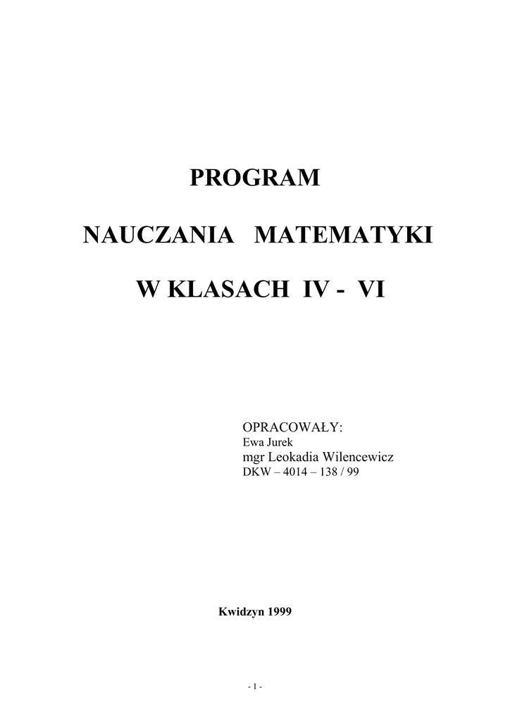 PROGRAM NAUCZANIA MATEMATYKI W KLASACH IV - VI OPRACOWAŁY: Ewa Jurek mgr Leokadia Wilencewicz DKW – 4014 – 138 / 99 Kwidzyn 1999 -1- Cele ogólne: 1. Dostrzeganie i formułowanie problemów teoretycznych, rozwijanie pamięci. 2. Kształtowanie pozytywnego nastawienia do podejmowania wysiłku intelektualnego, wyrobienie systematyczności, pracowitości i wytrwałości. 3. Rozwijanie zainteresowań matematycznych. 4. Umiejętność czytania tekstu ze zrozumieniem i mówienie o problemach matematycznych. 5. Kształtowanie umiejętności stosowania schematów, symboli literowych i rysunków przy rozwiązywaniu zadań matematycznych i w sytuacjach związanych z życiem codziennym. 6.Wyrabianie odpowiedzi, błędów. nawyków szacowanie, sprawdzania sprawdzanie i -2- otrzymanych korygowanie K L A S A IV ARYTMETYKA Materiał kształcenia. Osiągnięcia. Uczeń umie. Przykłady. Uczniowie mogliby. Dodawać i odejmować w pamięci liczby dwucyfrowe. Mnożyć i dzielić w pamięci liczby dwucyfrowe; a) przez 2 i 3 b) przez liczby jednocyfrowe Rozwiązywać i układać zadania tekstowe. Obliczać w pamięci o ile pewien przedmiot jest cięższy od innego, który waży 38 kg Rozwiązać równanie: x + 12 = 75; 5 * x = 45 Obliczać wartość wyrażeń arytmetycznych, w których występują liczby naturalne jednocyfrowe i dwucyfrowe. Obliczać ile trzeba autobusów aby zabrać 150 osób z IV kl. na wycieczkę, jeżeli mają 45 miejsc. Kwadraty i sześciany liczb. Przykłady obliczania drugiej i trzeciej potęgi liczb naturalnych. Obliczyć kwadrat i sześcian liczb naturalnych. Prostokątną kartkę papieru złóż trzykrotnie na pół. Ile prostokątów tej samej wielkości otrzymasz po złożeniu kartki. System dziesiątkowy. Zapisywanie i odczytywanie liczb (do miliarda) zapisywanie liczb słowami. Zapisywać i odczytywać liczby do miliarda. Liczby naturalne. Rachunek pamięciowy. Dodawanie i odejmowanie w pamięci liczb dwucyfrowych. Mnożenie i dzielenie przez liczby jednocyfrowe. Dzielenie z resztą. Rozwiązywanie równań jednodziałaniowych. Kolejność wykonywania działań. Porównanie ilorazowe i różnicowe. Obliczanie wartości prostych wyrażeń arytmetycznych. Rozwiązywanie i układanie prostych zadań tekstowych. System rzymski. Zapisywanie liczb naturalnych w systemie rzymskim. Odczytywanie liczb zapisanych w systemie rzymskim. Oś liczbowa . Zaznaczenia na osi liczbowej (także liczb wielocyfrowych typu 100, 200, 350, czy 500, 1000). Odczytywanie współrzędnych punktów na osi. Zapisywać i odczytywać liczby naturalne w systemie rzymskim od 100 do 4000. Zapisać za pomocą znaków rzymskich swoją datę urodzenia. Zaznaczać punkty na osi liczbowej i odczytywać współrzędne punktów na osi. Określić współrzędne punktów zaznaczonych na osi liczbowej. A B C D 0 2 -3- 10 Dodawanie i odejmowanie liczb wielocyfrowych systemem pisemnym Dodawać i odejmować liczby Za długopisy zapłacono 57 zł. 60 gr. Ile kupisz długopisów naturalne systemem jeżeli cena długopisów była pisemnym. równa 4 zł. 80 gr. ? Mnożenie i dzielenie systemem pisemnym. Mnożenie i dzielenie liczb wielocyfrowych przez liczby jednocyfrowe i dwucyfrowe oraz mnożenie i dzielenie typu2580,4500,144000,1800. Mnożyć i dzielić liczby naturalne systemem pisemnym przez liczby jednocyfrowe, przez liczby dwucyfrowe. 45 * 2; 49 : 7; Zastosowanie algorytmów, działań pisemnych. Obliczanie wartości prostych wyrażeń arytmetycznych. Obliczać wartość wyrażeń arytmetycznych, w których występują liczby naturalne. 125 * 8 + 4284 * 7 Wielokrotności i dzielniki liczb. Podzielność liczb. Zapisywanie wielokrotności i dzielników danej liczby naturalnej. Rozpoznanie czy dana liczba jest podzielna przez: 2,3,4,5,9,10,25, i 100 (wspólne wielokrotności i wspólne dzielniki). Liczby pierwsze i złożone. Przykłady liczb pierwszych i złożonych. Rozkład liczby złożonej na czynniki pierwsze. Ułamki zwykłe. Ułamek jako część całości. Opisywanie części figury za pomocą ułamka. 55 * 18; 121 : 11; Rozpoznać, czy liczby : 92, 49, 50, 144, i 125 są podzielne przez 2. Rozkładać liczby na czynniki pierwsze. Dane liczby rozłożyć na czynniki pierwsze: 36, 68, 144 Opisywanie części figury za pomocą ułamka. Jak równo rozdzielić trzy tabliczki czekolady między czworo dzieci? -4- Ułamki właściwe i niewłaściwe. Liczby mieszane. Interpretacja ułamków niewłaściwych i liczb mieszanych za pomocą rysunków. Zaznaczanie liczb mieszanych na osi liczbowej. Zamiana liczb mieszanych na ułamki niewłaściwe. Zaznaczać ułamki zwykłe na osi liczbowej. A 0 Ułamek jako iloraz liczb naturalnych. Zapisywać ułamki. Zapisywanie ułamków w postaci ilorazu i odwrotnie. Zamiana ułamka niewłaściwego na liczby mieszane. Skracanie i rozszerzanie ułamków. Ułamki nieskracalne. Proste przykłady skracania i rozszerzania ułamków. Zapisywanie ułamków w postaci nieskracalnej. Porównywanie ułamków. Przykłady porównywania ułamków (typu ½ i 1/3 oraz 2/7 i 5/7). Porównywanie ułamków o jednakowych mianownikach i ułamków o jednakowych licznikach. Dodawanie i odejmowanie ułamków o jednakowych mianownikach. Dodawanie i odejmowanie dwóch ułamków o jednakowych mianownikach (przykłady typu 2/5+1/5; 7/8-1/8; 3 5/7-1/7 ; 1 1/3+2 1/7 ) Nad każdą literą napisz odpowiedni ułamek. B CD 1 E 2 3 1 ½ = 3/2 ; 9/4 = 2 ½; Skracać i rozszerzać proste przykłady ułamków. Skróć ułamki: 4/8 = ½ 42/18 = 7/3 Porównywać dwa ułamki o jednakowym liczniku oraz dwa ułamki o jednakowym mianowniku. Narysuj dwa jednakowe prostokąty. W pierwszym zamaluj 6/9, a drugim 2/3 prostokąta. Co zauważyłeś ? Dodawać i odejmować dwa ułamki o jednakowych licznikach i jednakowych mianownikach. W sklepie kupił 6/10 kg szynki i 4/10kg baleronu. Ile kilogramów ważyły zakupy ? -5- Mnożenie ułamków przez liczby naturalne. Obliczanie iloczynu ułamka danej liczby naturalnej. Obliczanie ułam