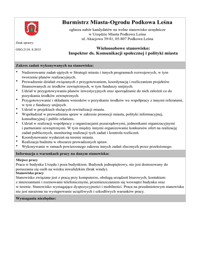 Burmistrz Miasta-Ogrodu Podkowa Leśna ' ogłasza nabór kandydatów na wolne stanowisko urzędnicze w Urzędzie Miasta Podkowa Leśna ul. Akacjowa 39/41, 05-807 Podkowa Leśna Znak sprawy: OSO.2110. 8.2015 Wieloosobowe stanowisko: Inspektor ds. Komunikacji społecznej i polityki miasta Zakres zadań wykonywanych na stanowisku: • • • • • • • • • • Nadzorowanie zadań ujętych w Strategii miasta i innych programach rozwojowych, w tym tworzenie planów realizacyjnych. Prowadzenie działań związanych z przygotowaniem, koordynacją i rozliczaniem projektów finansowanych ze środków zewnętrznych, w tym funduszy unijnych. Udział w przygotowywaniu planów inwestycyjnych oraz sporządzanie do nich założeń co do pozyskania środków zewnętrznych. Przygotowywanie i składanie wniosków o pozyskanie środków we współpracy z innymi referatami, w tym z funduszy unijnych. Udział w projektach służących rewitalizacji miasta. Współudział w prowadzeniu spraw w zakresie promocji miasta, polityki informacyjnej, konsultacyjnej i public relations. Udział w realizacji współpracy z organizacjami pozarządowymi, jednostkami organizacyjnymi i partnerami zewnętrznymi. W tym między innymi organizowanie konkursów ofert na realizację zadań publicznych, monitoring realizacji tych zadań i kontrola rozliczeń. Koordynowanie wydarzeń na terenie miasta. Realizacja budżetu w obszarze prowadzonych spraw. Wykonywanie w ramach powierzonego zakresu innych zadań zleconych przez przełożonego. Informacja o warunkach pracy na danym stanowisku: Miejsce pracy Praca w budynku Urzędu i poza budynkiem. Budynek jednopiętrowy, nie jest dostosowany do poruszania się osób na wózku inwalidzkim (brak windy). Stanowisko pracy Stanowisko związane jest z pracą przy komputerze, obsługą urządzeń biurowych, kontaktem z interesantami i rozmowami telefonicznymi, przemieszczaniem się wewnątrz budynku oraz w terenie. Stanowisko wymagające dyspozycyjności i mobilności. Praca na przedmiotowym stanowisku nie jest narażona na występowanie uciążliwych i szkodliwych warunków pracy. Wymagania niezbędne: Obywatelstwo polskie. Pełna zdolność do czynności prawnych oraz korzystanie z pełni praw publicznych. Niekaralność za umyślne przestępstwo ścigane z oskarżenia publicznego lub umyślne przestępstwo skarbowe. • Nieposzlakowana opinia. • Wykształcenie wyższe magisterskie. • Udokumentowany co najmniej trzyletni staż pracy. • Minimum roczny staż pracy związanej z przygotowaniem i rozliczaniem projektów finansowanych przy udziale środków zewnętrznych (udokumentowany). Uwaga: Kandydaci, którzy nie spełniają wszystkich wymagań niezbędnych nie zostaną dopuszczeni do udziału w naborze. • • • Wymagania dodatkowe: • • • • • • • • • • • • • Studia podyplomowe w zakresie przydatnym na ww. stanowisku. Doświadczenie w pozyskiwaniu środków zewnętrznych. Doświadczenie w procesie tworzenia i realizowania planów strategicznych i rozwojowych . Znajomość co najmniej języka angielskiego. Znajomość obsługi komputera, w tym zarządzania stronami WWW. Znajomość przepisów prawa w zakresie: samorządu gminnego, finansów publicznych, kodeksu postępowania administracyjnego, ustawy o dostępie do informacji publicznej, prawa zamówień publicznych, instrukcji kancelaryjnej. Umiejętność redagowania tekstów, w tym informacji prasowych oraz artykułów informacyjnych. Ogólna wiedza o strukturze i organizacji Urzędu Miasta Podkowa Leśna oraz jednostek organizacyjnych miasta. Ogólna orientacja w bieżących wydarzeniach w mieście oraz znajomość zawartości serwisu internetowego www.podkowalesna.pl oraz Biuletynu Miasta-Ogrodu Podkowy Leśnej. Komunikatywność i łatwość nawiązywania kontaktów interpersonalnych. Wysoka kultura osobista. Samodzielność, dobra organizacja pracy zapewniająca terminową realizację zadań. Pożądane kompetencje: dążenie do rezultatów, rozwiązywanie problemów, umiejętności analityczne, otwartość na zmiany, radzenie sobie ze stresem, współpraca w zespole. Wskaźnik zatrudnienia osób niepełnosprawnych: W miesiącu poprzedzającym datę upublicznienia ogłoszenia wskaźnik zatrudnienia osób niepełnosprawnych w jednostce, w rozumieniu przepisów o rehabilitacji zawodowej i społecznej oraz zatrudnianiu osób niepełnosprawnych, jest niższy niż 6%. Wymagane dokumenty i oświadczenia: List motywacyjny. CV z informacjami o wykształceniu i opisem dotychczasowego przebiegu pracy zawodowej. Oświadczenie o niekaralności za przestępstwo popełnione umyślnie lub przestępstwo skarbowe umyślne. • Oświadczenie o pełnej zdolności do czynności prawnych i korzystaniu z pełni praw publicznych. • Oświadczenie o wyrażeniu zgody na przetwarzanie danych osobowych do celów rekrutacji. • Kopie świadectw pracy i inne dokumenty potwierdzające staż pracy. • Kopie dokumentów potwierdzających wykształcenie i dodatkowe kwalifikacje. • Kandydat, który zamierza skorzystać z uprawnienia, o którym mowa w art.13a ust.2 ustawy o pracownikach samorządowych jest obowiązany do złożenia wraz z dokumentami kopii dokumentu potwierdzającego niepełnosprawność. Uwaga: Niezłożeni wymaganych dokumentów powoduje odrzucenie aplikacji. • • • Wymagane dokumenty rekrutacyjne mogą być składane wyłącznie w formie pisemnej, osobiście w siedzibie Urzędu lub przesłane pocztą na adres Urzędu z dopiskiem: „Dotyczy naboru na stanowisko urzędnicze Inspektor ds. Komunikacji społecznej i polityki miasta” w terminie do 2 listopada 2015 r. do godz.12.00. Dokumenty składane przez osoby ubiegające się o zatrudnienie po terminie podanym w ogłoszeniu lub nieoznaczone do jakiego naboru zostały złożone nie będą rozpatrywane. W razie przesłania przez kandydata dokumentów drogą pocztową, za datę ich doręczenia do Urzędu uważa się datę wpływu do Sekretariatu Urz