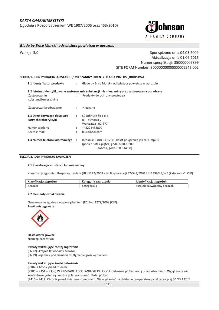 KARTA CHARAKTERYSTYKI (zgodnie z Rozporządzeniem WE 1907/2006 oraz 453/2010) Glade by Brise Morski- odświeżacz powietrza w aerozolu Wersja 3.0 Sporządzono dnia 04.03.2009 Aktualizacja dnia 01.06.2015 Numer specyfikacji: 350000007899 SITE FORM Number: 30000000000000006942.002 SEKCJA 1. IDENTYFIKACJA SUBSTANCJI/ MIESZANINY I IDENTYFIKACJA PRZEDSIĘBIORSTWA 1.1 Identyfikator produktu : Glade by Brise Morski- odświeżacz powietrza w aerozolu 1.2 Istotne zidentyfikowane zastosowania substancji lub mieszaniny oraz zastosowania odradzane Zastosowanie : Produkty do ochrony powietrza substancji/mieszaniny Zastosowania odradzane : Nieznane 1.3 Dane dotyczące dostawcy karty charakterystyki : Numer telefonu Adres e-mail : : SC Johnson Sp z o.o. ul. Taśmowa 7 Warszawa 02-677 +48224458800 [email protected] 1.4 Numer telefonu alarmowego : Infolinia: 0-801 11 12 11, koszt połączenia jak za 1 impuls. (poniedziałek-piątek, godz. 8:00-18:00 sobota, godz. 8:00-14:00) SEKCJA 2. IDENTYFIKACJA ZAGROŻEŃ 2.1 Klasyfikacja substancji lub mieszaniny Klasyfikacja zgodnie z Rozporządzeniem (UE) 1272/2008 z tablicą korelacji 67/548/EWG lub 1999/45/WE (Załącznik VII CLP) Klasyfikacja zagrożeń Aerozol Kategoria zagrożenia Kategoria 1 Identyfikacja zagrożeń Skrajnie łatwopalny aerozol. 2.2 Elementy oznakowania Oznakowanie zgodne z rozporządzeniem (EC) No. 1272/2008 (CLP) Znaki ostrzegawcze Hasło ostrzegawcze Niebezpieczeństwo Zwroty wskazujące rodzaj zagrożenia (H222) Skrajnie łatwopalny aerozol. (H229) Pojemnik pod ciśnieniem: Ogrzanie grozi wybuchem. Zwroty wskazujące środki ostrożności (P102) Chronić przed dziećmi. (P305 + P351 + P338) W PRZYPADKU DOSTANIA SIĘ DO OCZU: Ostrożnie płukać wodą przez kilka minut. Wyjąć soczewki kontaktowe, jeżeli są i można je łatwo usunąć. Nadal płukać. (P410 + P412) Chronić przed światłem słonecznym. Nie wystawiać na działanie temperatury przekraczającej 50 °C/ 122 °F. 1/11 KARTA CHARAKTERYSTYKI (zgodnie z Rozporządzeniem WE 1907/2006 oraz 453/2010) Glade by Brise Morski- odświeżacz powietrza w aerozolu Wersja 3.0 Sporządzono dnia 04.03.2009 Aktualizacja dnia 01.06.2015 Numer specyfikacji: 350000007899 SITE FORM Number: 30000000000000006942.002 (P210) Przechowywać z dala od źródeł ciepła, gorących powierzchni, źródeł iskrzenia, otwartego ognia i innych źródeł zapłonu. Nie palić. (P211) Nie rozpylać nad otwartym ogniem lub innym źródłem zapłonu. (P251) Nie przekłuwać ani nie spalać, nawet po zużyciu. (P260) Nie wdychać rozpylonej cieczy. Dodatkowe oznakowanie Używać zgodnie ze sposobem użycia. Stosować wyłącznie w dobrze wentylowanych pomieszczeniach. Osoby cierpiące na nadwrażliwość zapachową powinny zachować ostrożność przy stosowaniu tego produktu. Odświeżacze powietrza nie mogą zwolnić z przestrzegania zasad postępowania w zakresie higieny. 2.3 Inne zagrożenia : Niewłaściwe użycie produktu [np. celowe wdychanie zawartości] może być szkodliwe lub śmiertelne. Nadmierne narażenie na rozpyloną ciecz może powodować podrażnienie układu oddechowego. SEKCJA 3. SKŁAD/ INFORMACJA O SKŁADNIKACH 3.2 Mieszaniny Składniki niebezpieczne Nazwa Chemiczna Nr CAS/EC No Izobutan 75-28-5/200-857-2 01-2119485395-27 Wodoroortofosforan disodu Chlorek trimetylooktadecyloamoniowy 7558-79-4/231448-7 7778-77-0/231913-4 112-03-8/203-929- 1 Substancja NDS Propan 74-98-6/200-827-9 01-2119486944-21 Reg. No Klasyfikacja zgodna z rozporządzeniem (WE) nr 1272/2008 (CLP). Gazy łatwopalne Kategoria 1 H220 Gaz pod ciśnieniem Procent wagowy >= 10.00 - < 20.00 H280 Diwodoroortofosforan potasu >= 0.10 - < 0.50 >= 0.10 - < 0.50 2/11 Drażniące na skórę Kategoria 1 H314 Poważne uszkodzenie oczu/działanie drażniące na oczy Kategoria 1 H318 Przewlekła toksyczność dla środowiska wodnego Kategoria 1 H410 Toksyczność ostrą dla środowiska wodnego Kategoria 1 H400 >= 0.00 - < 0.10 Gazy łatwopalne Kategoria 1 H220 Gaz pod ciśnieniem H280 >= 1.00 - < 5.00 KARTA CHARAKTERYSTYKI (zgodnie z Rozporządzeniem WE 1907/2006 oraz 453/2010) Glade by Brise Morski- odświeżacz powietrza w aerozolu Wersja 3.0 Sporządzono dnia 04.03.2009 Aktualizacja dnia 01.06.2015 Numer specyfikacji: 350000007899 SITE FORM Number: 30000000000000006942.002 Dodatkowe informacje Pełny tekst zwrotów H przytoczonych w tej Sekcji znajduje się w Sekcji 16. SEKCJA 4. ŚRODKI PIERWSZEJ POMOCY 4.1 Opis środków pierwszej pomocy Wdychanie : Przenieść na świeże powietrze. W przypadku wdychania produktu zasięgnąć pomocy medycznej. Kontakt przez skórę : Przepłukać obficie wodą. Uzyskać pomoc medyczną w przypadku pojawienia się i utrzymywania podrażnienia. Kontakt z oczami : Przepłukać obficie wodą. Uzyskać pomoc medyczną w przypadku pojawienia się i utrzymywania podrażnienia. Połknięcie : Jeśli objawy utrzymują się, wezwać lekarza. 4.2 Najważniejsze ostre i opóźnione objawy oraz skutki narażenia Oczy : Może podrażniać oczy. Jeśli produkt używany jest zgodnie ze sposobem użycia nie należy spodziewać się żadnych niepożądanych efektów. Skutki dla skóry : Może powodować podrażnienie skóry. Jeśli produkt używany jest zgodnie ze sposobem użycia nie należy spodziewać się żadnych niepożądanych efektów. Wdychanie : Niewłaściwe użycie produktu [np. celowe wdychanie zawartości] może być szkodliwe lub śmiertelne. Jeśli produkt używany jest zgodnie ze sposobem użycia nie należy spodziewać się żadnych niepożądanych efektów. Nadmierne narażenie na rozpyloną ciecz może powodować podrażnienie układu oddechowego. Połknięcie : Jeśli produkt używany jest zgodnie ze sposobem użycia nie należy spodziewać się żadnych niepożądanych efektów. 4.3 Wskazania dotyczące wszelkiej natychmiastowej pomocy lekarskiej i szczególnego postępowania z poszkodowanym Patrz opis pierwszej pomocy chyba, że określono inaczej. SEKCJA 5. POSTĘPOWANIE W PRZYPADKU POŻARU 5.